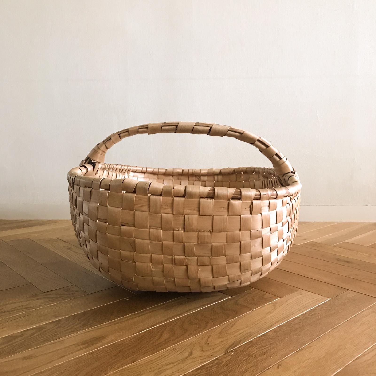 スウェーデン製のヴィンテージのハンドルバスケットです。オーバル型のおおきなサイズなので、容量たっぷりです。ハンドルと本体の中心が濃い茶色とナチュラルの一抹模様になっています。面積が広いので、布物を仕舞ったり、冬場はストールや手袋などを入れて、見せる収納として使えます。