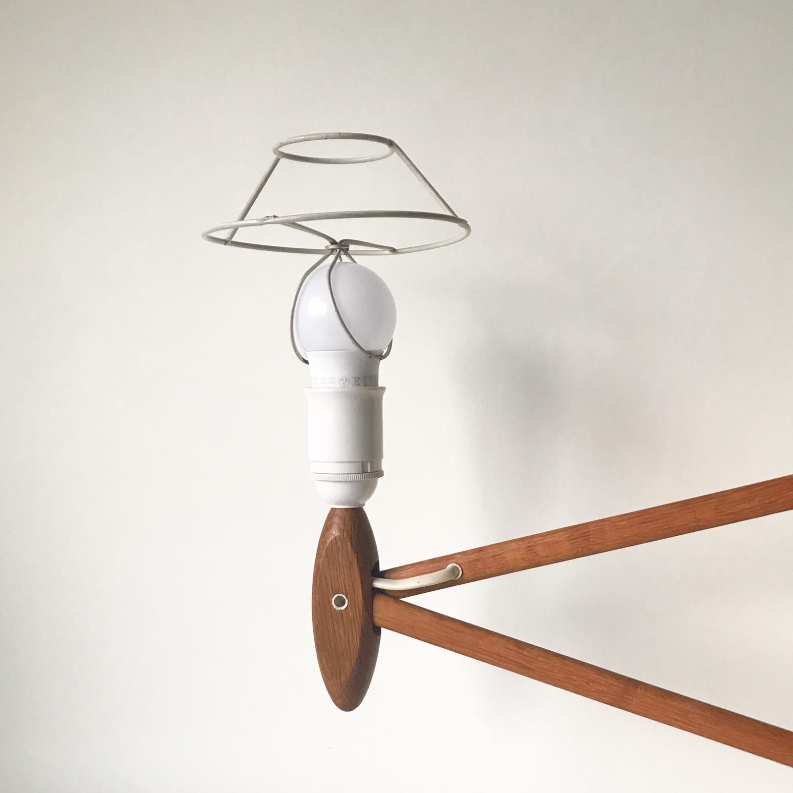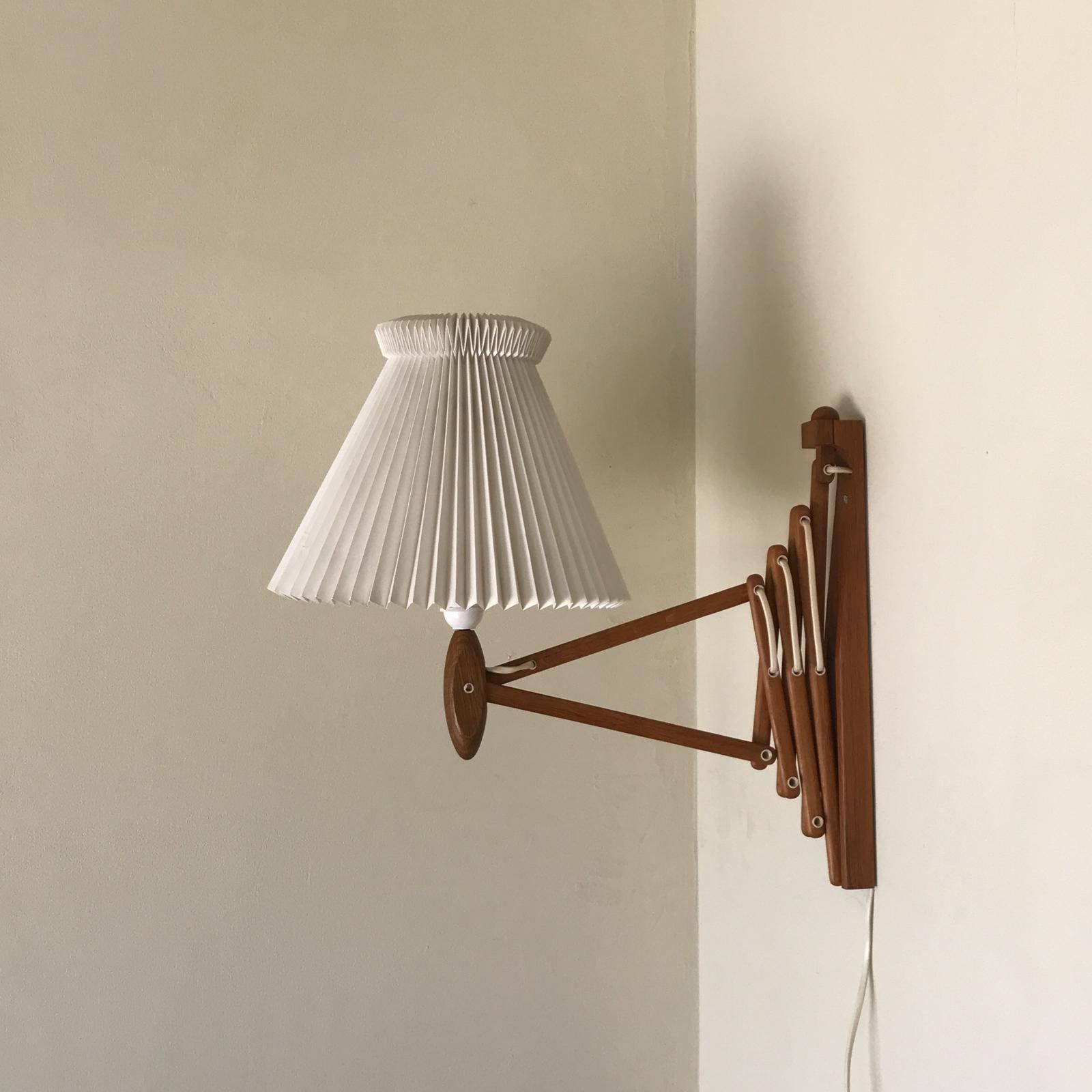 デンマークの照明メーカー・LE KLINT(レクリント)社で、エリック・ハンセン氏によって1950年代にデザインされたブラケットライトです。伸縮性のあるチークの本体と、ひと折りひと折り手作業で仕上げられた、プラスティックのシェードの組み合わせは、デンマークの照明の歴史の中でも、とりわけ個性的で秀逸なデザインとして、広く認知されてきました。現在は復刻版も販売されていますが、白木が使われています。チーク材が使われていたのは、オリジナルの時代のヴィンテージのみで希少性があります。個性があって美しく、趣のあるデザインです。使用感は見られますが、目立つダメージはなく、良好なコンディションです。コンセント差込口は日本仕様に変更しています。点灯、消灯は白いレバーを左右に回します。(最後の2枚の画像をご確認ください)