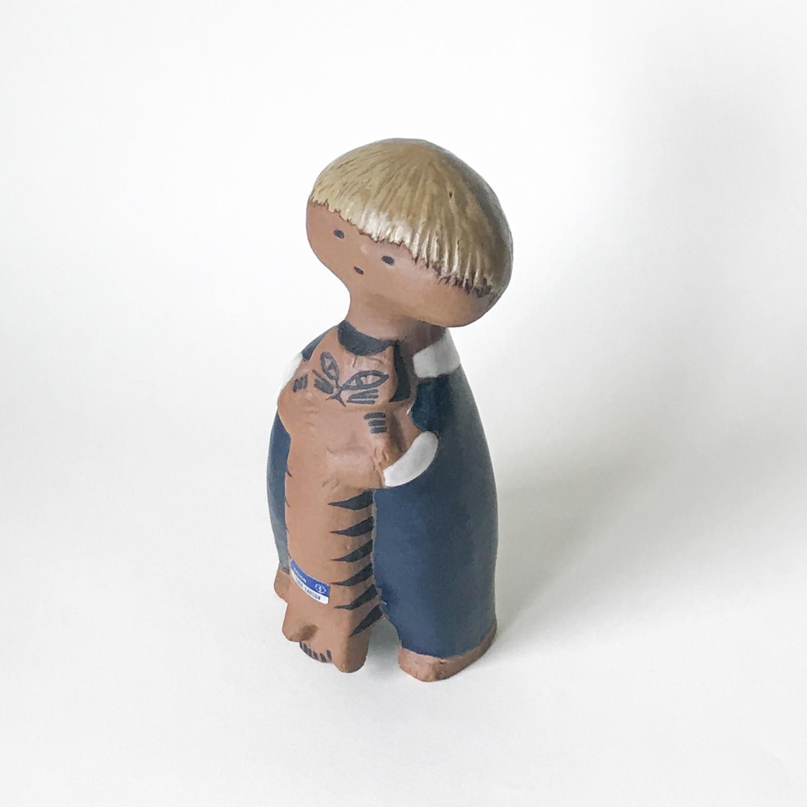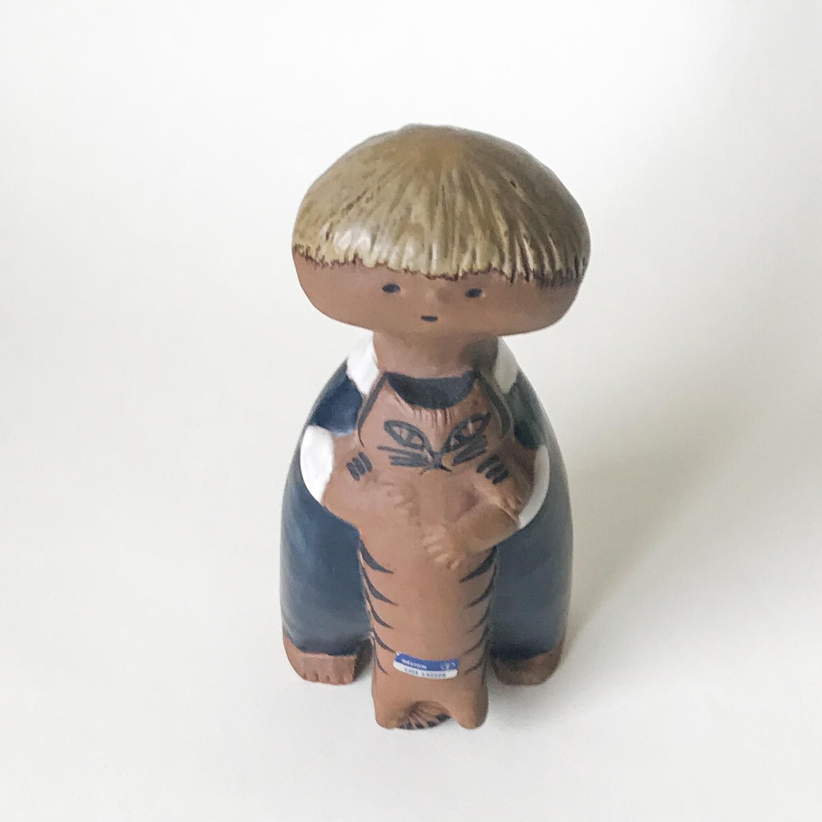 リサ・ラーソンがデザインし、陶器メーカー・グスタフスベリで、1962年〜1980年の間に作られていた「ラーソンの子供達」シリーズのPELLE|ペレです。動物や子供をモチーフにした作品が多い、リサ・ラーソンらしい作品です。マッシュルームカットにネイビーの洋服を着たペレは、ネコを抱き抱えて満足げな表情。対してネコはと言えば、身動きが取れなくて、少々不機嫌そうな表情。日常にありがちな一コマを作品に上手に取り入れる、リサ・ラーソンらしいアイテムです。