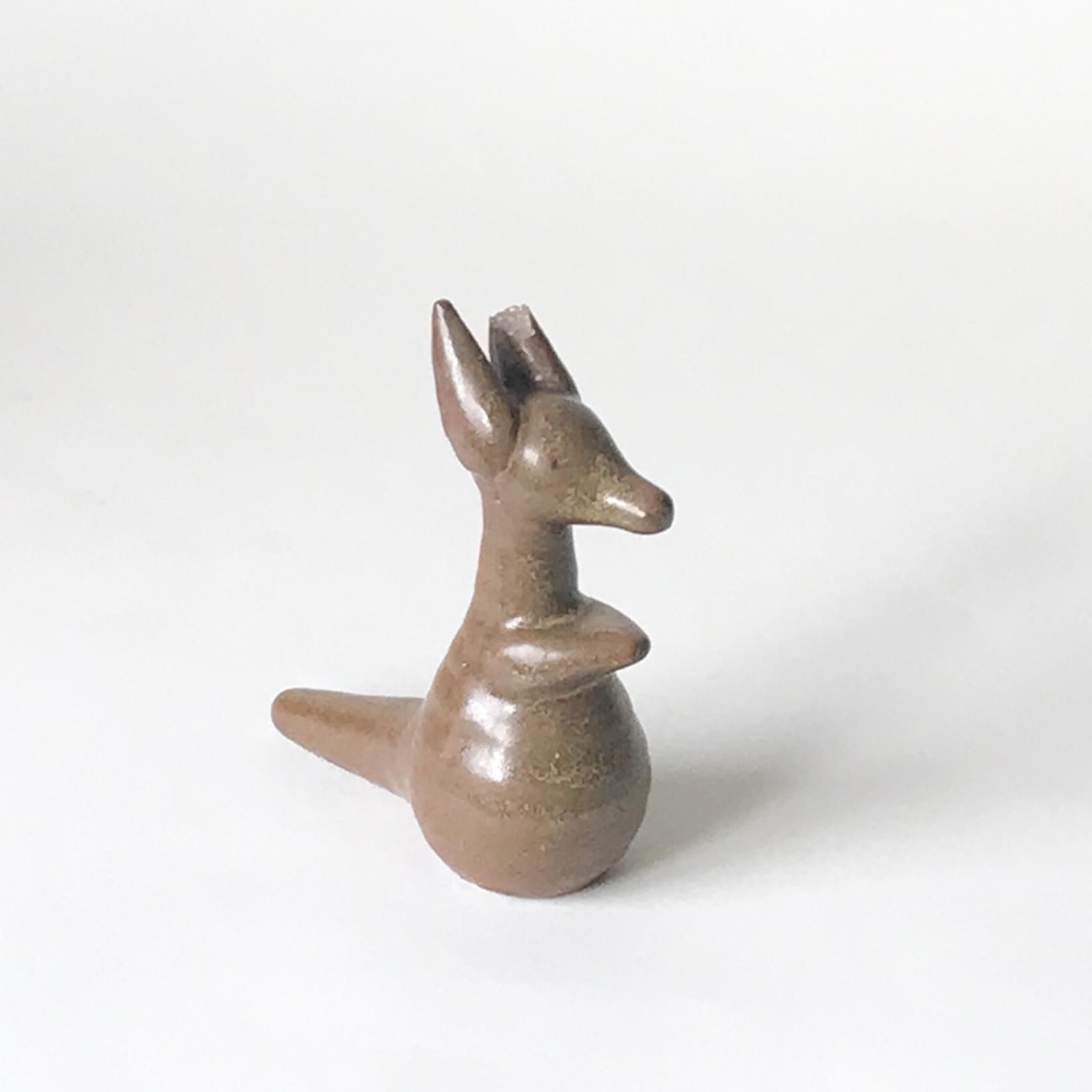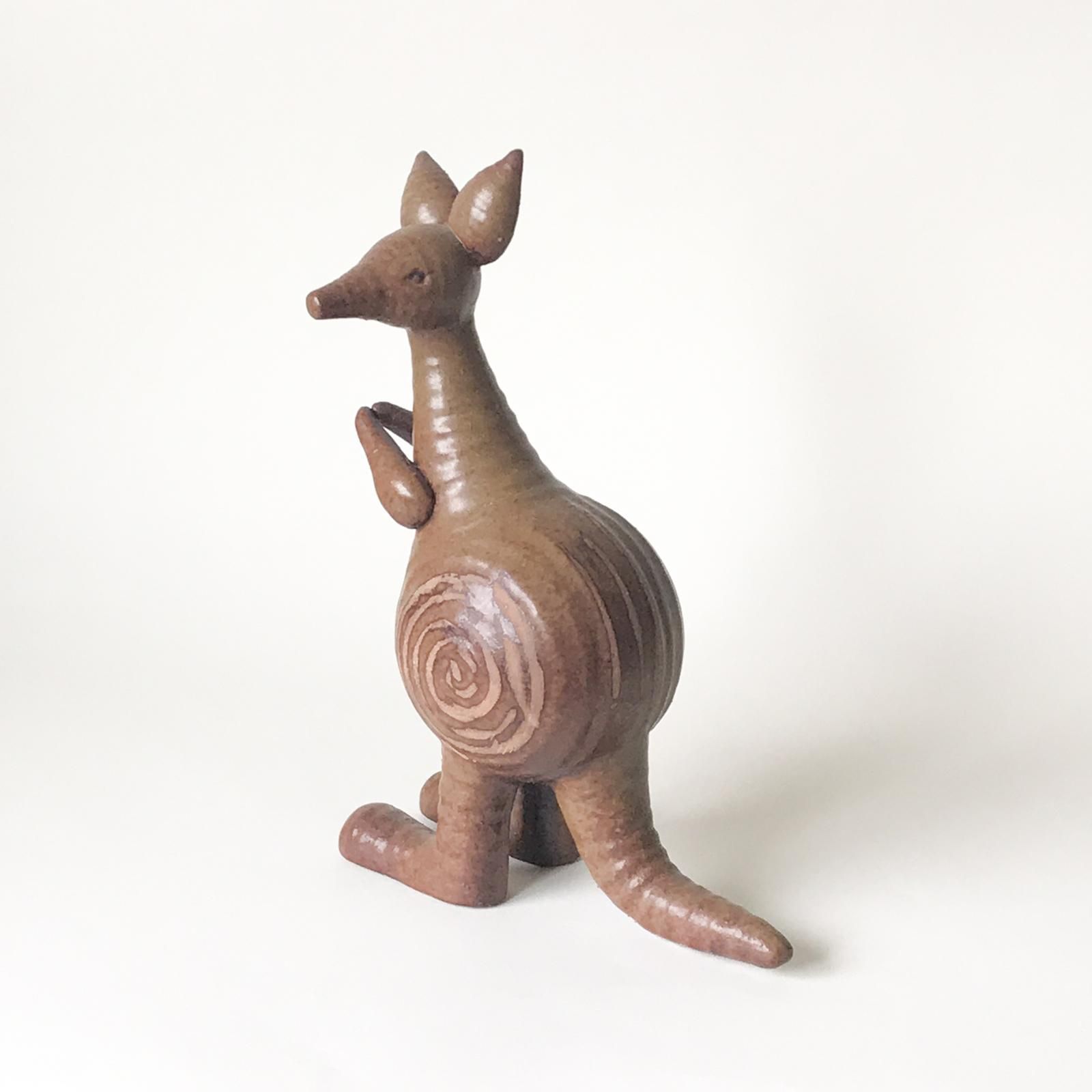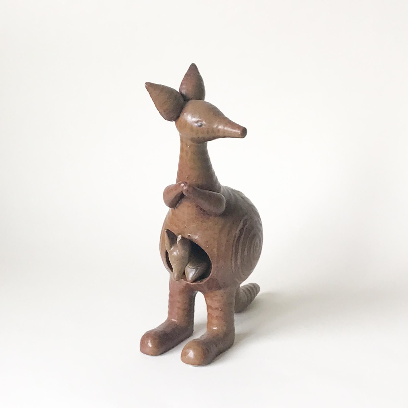 リサ・ラーソンがデザインし、陶器メーカー・グスタフスベリで、1966年〜1979年の間に作られていた「大きな動物園」シリーズのカンガルー親子です。動物や子供をモチーフにした作品が多い、リサ・ラーソンらしい作品です。カンガルーのお母さんが、顔をほんの少し傾けて、こちらを見ている表情は、動物の仕草を作品に上手に取り入れる、リサ・ラーソンらしいアイテムです。お腹の中は、球体にきれいにくり抜かれて、子供がゆったり入れます。