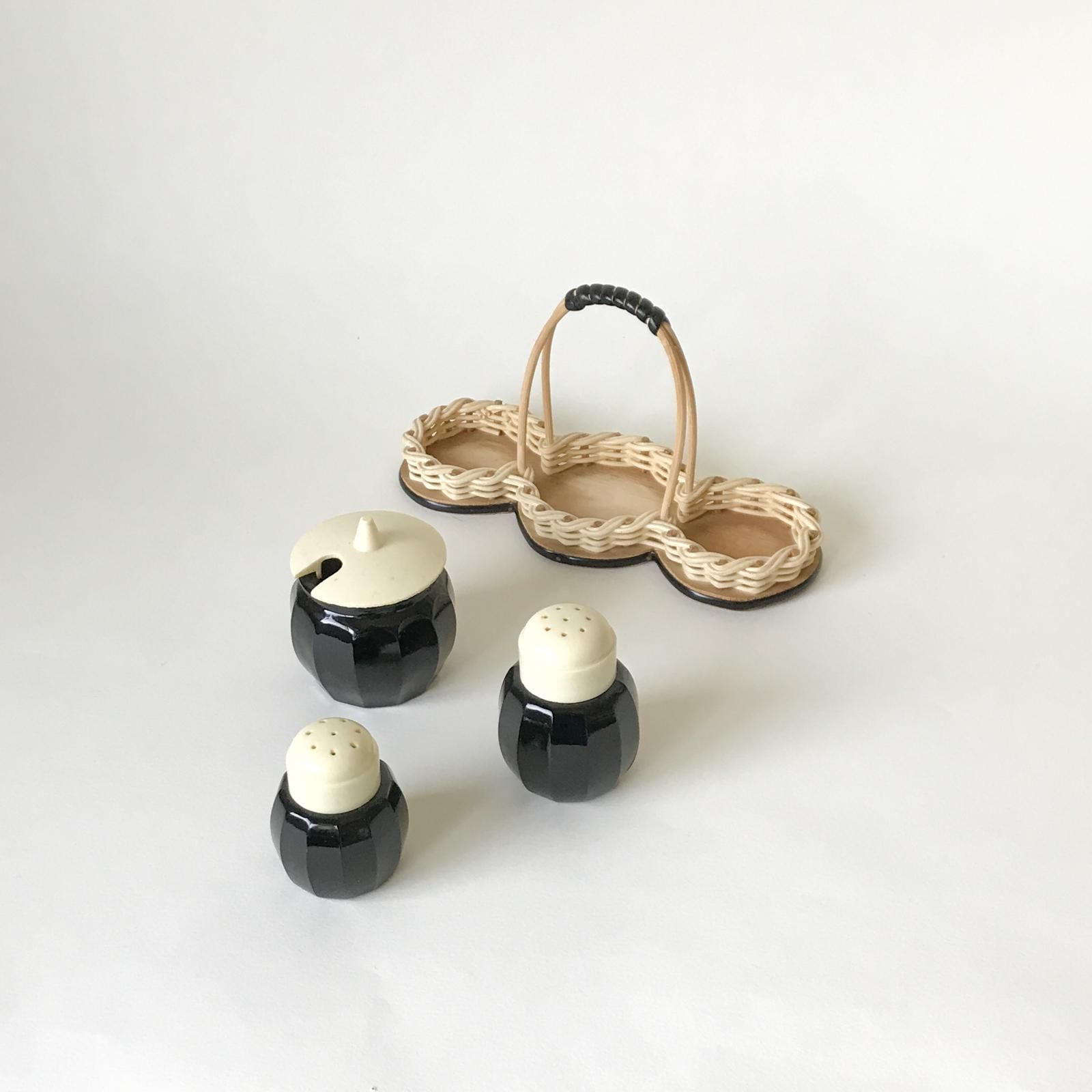スウェーデン製のヴィンテージのコンディメントセットです。塩、胡椒、マスタードポットの3つをセットにしたものは、欧米では一般的なアイテムです。アイボリーのビニールを編み込んだ、ハンドル付きのバスケットに、黒いガラスの本体に、アイボリーの樹脂のフタのソルト&ペッパーとマスタードポットが収まっています。