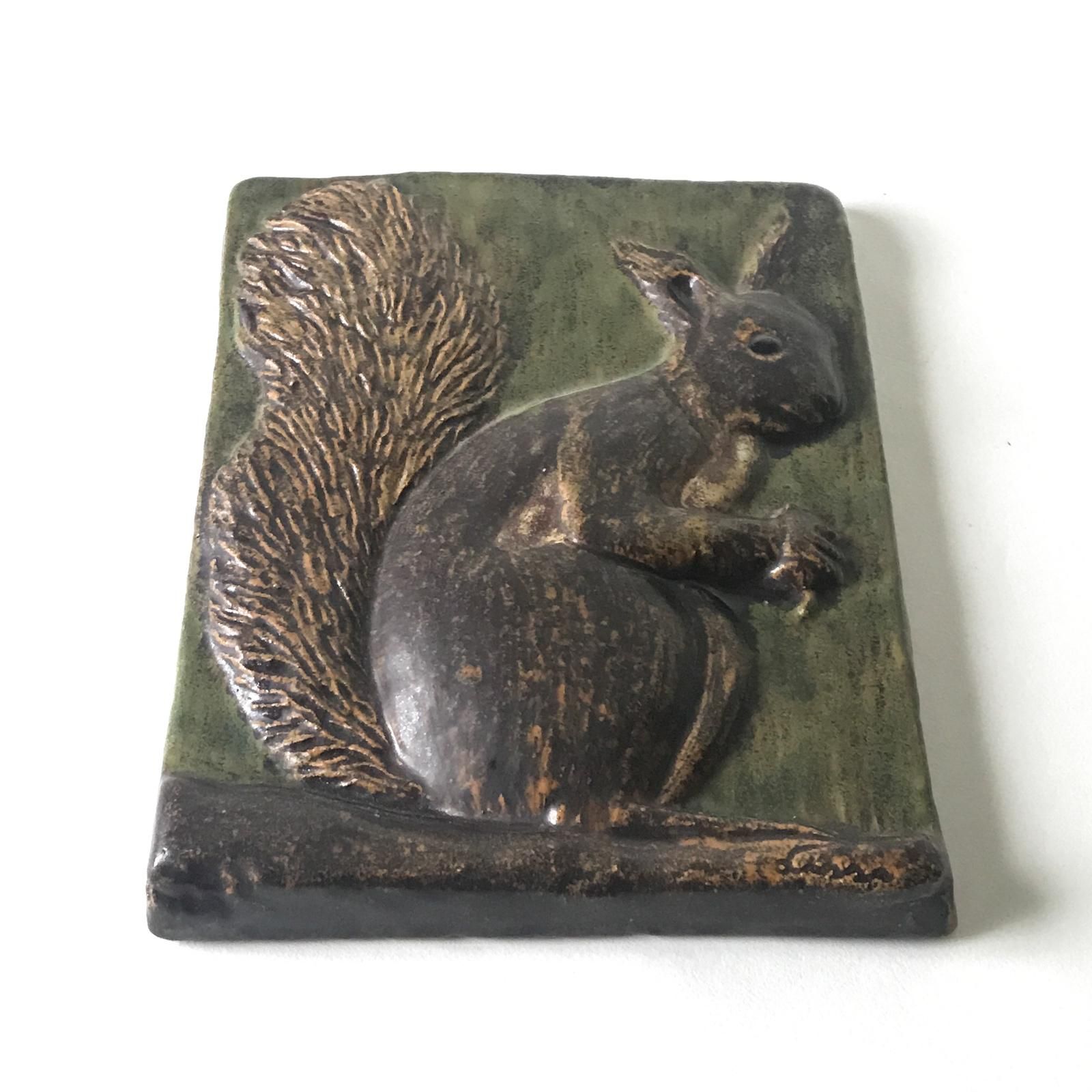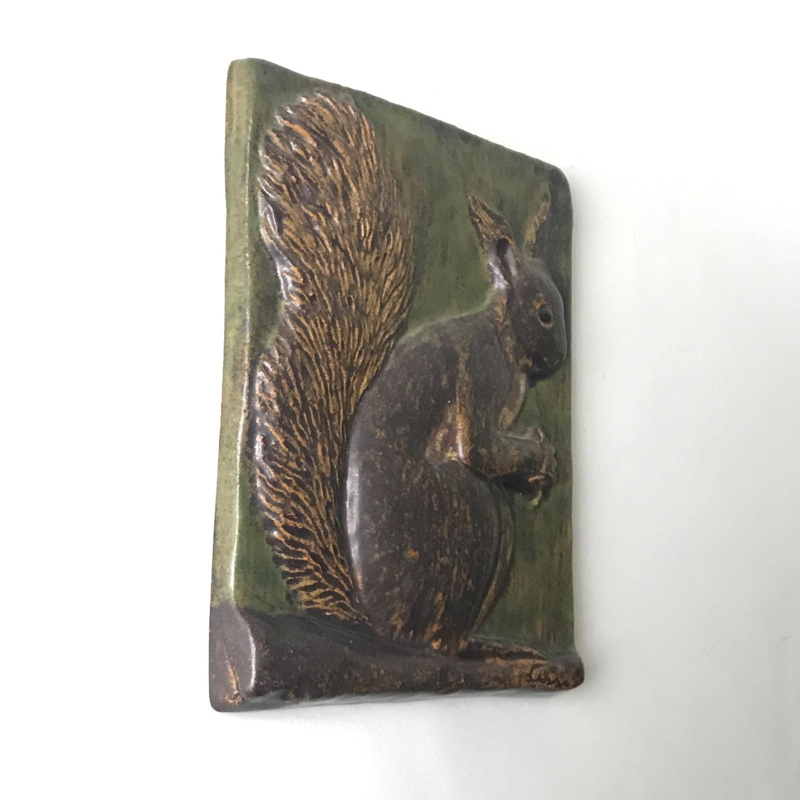 デンマークで作られていた、リスをモチーフにした陶器の壁掛けです。デザイナーは デンマークの著名な陶芸アーティスト、Ejvind Nielsen | エイヴィンド・ニールセン。モスグリーンを背景に、リスの丸みのある体と、ふさふさのボリュームある尻尾を、立体感たっぷりに表現しています。手書きのサイン入りです。