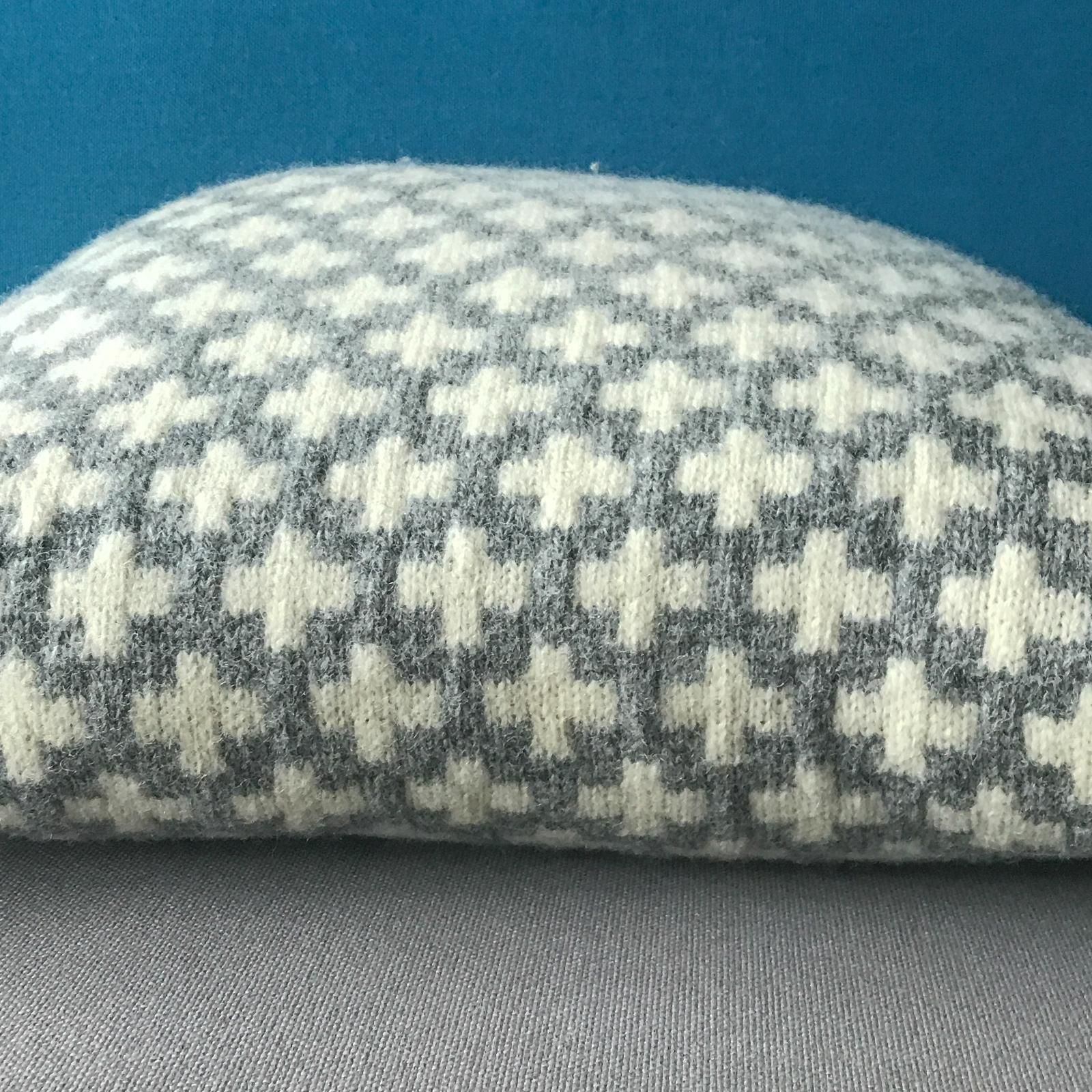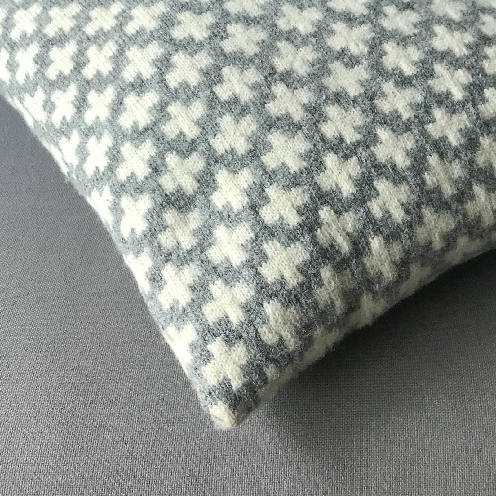 グレー地に白いクロス模様は、シンプルでインテリアに馴染みやすくて飽きのこない色柄です。最後の画像のように、大小のクロス模様で揃えるのもおすすめです。