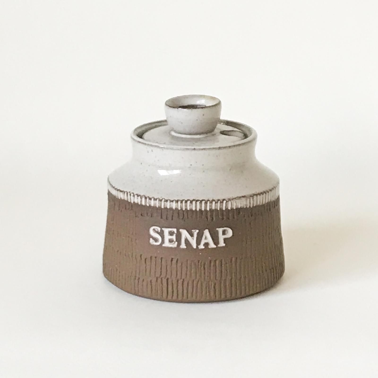 スウェーデンの著名なプロダクトデザイナー、SIGNE PERSSON-MELIN | シグネ・ペーションメリンがデザインし、自身のスタジオで制作されたマスタードポットです。「SENAP」はスウェーデン語でマスタードの意味。こげ茶色の生地を削り出した細い線模様、SENAP の白い文字、スプーン用の凹みのある蓋。落ち着いた雰囲気で、存在感のある佇まいです。裏面には「ORIGINAL SIGNE PERSSON-MELIN」の文字と、スタジオのロゴマークのかわいい魚がバックスタンプとして入れられています。
