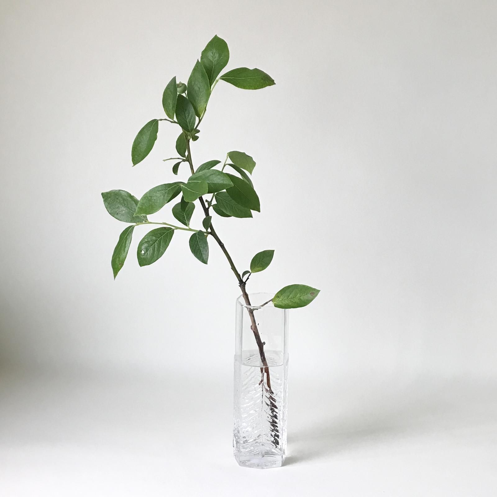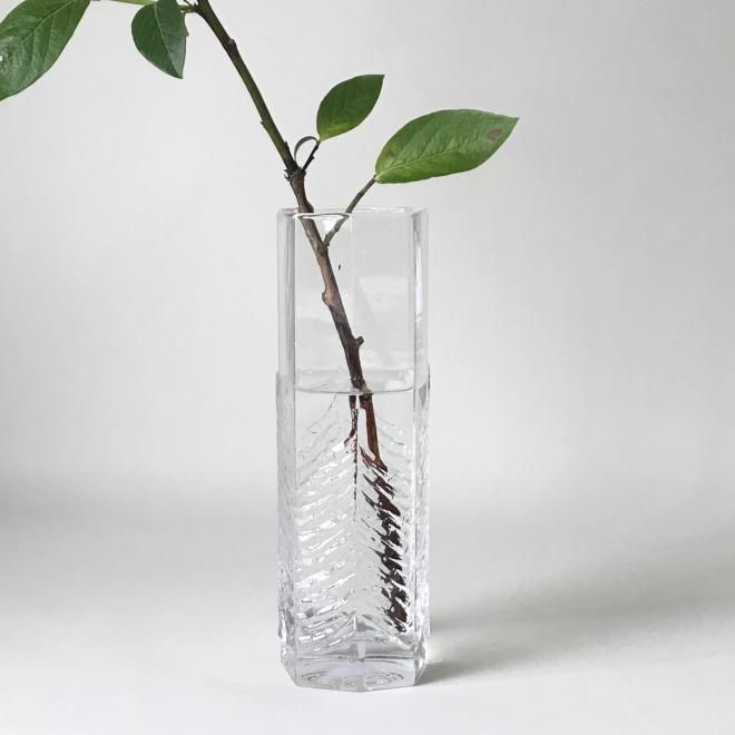 フィンランド・イッタラ社製のガラスの花器です。 「KUUSI | クーシ」というシリーズ名は、フィンランド語で「もみの木」を意味します。エンボス加工によって凹凸で表現されたもみの木がぐるりと一周していて、フィンランドの森を表しているようです。高さが18cmあるので写真のように枝物を生けてもすてきです。