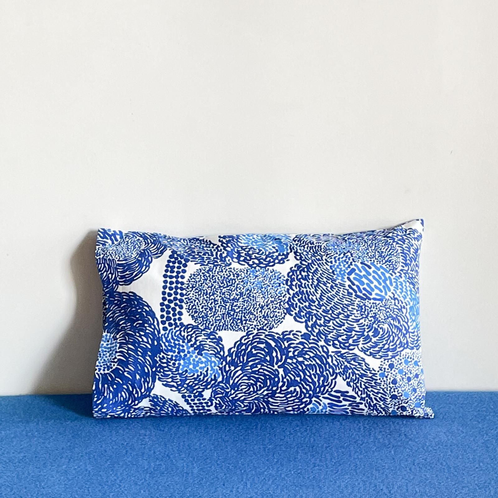 marimekkoで作られたヴィンテージ生地を使ってクッションを作りました。ブルーのグラデーションで描かれたさわやかな柄のミニピローです。小さなサイズはソファーで背当てや枕にするのにぴったり。きれいな色のクッションはインテリアのいいアクセントになります。