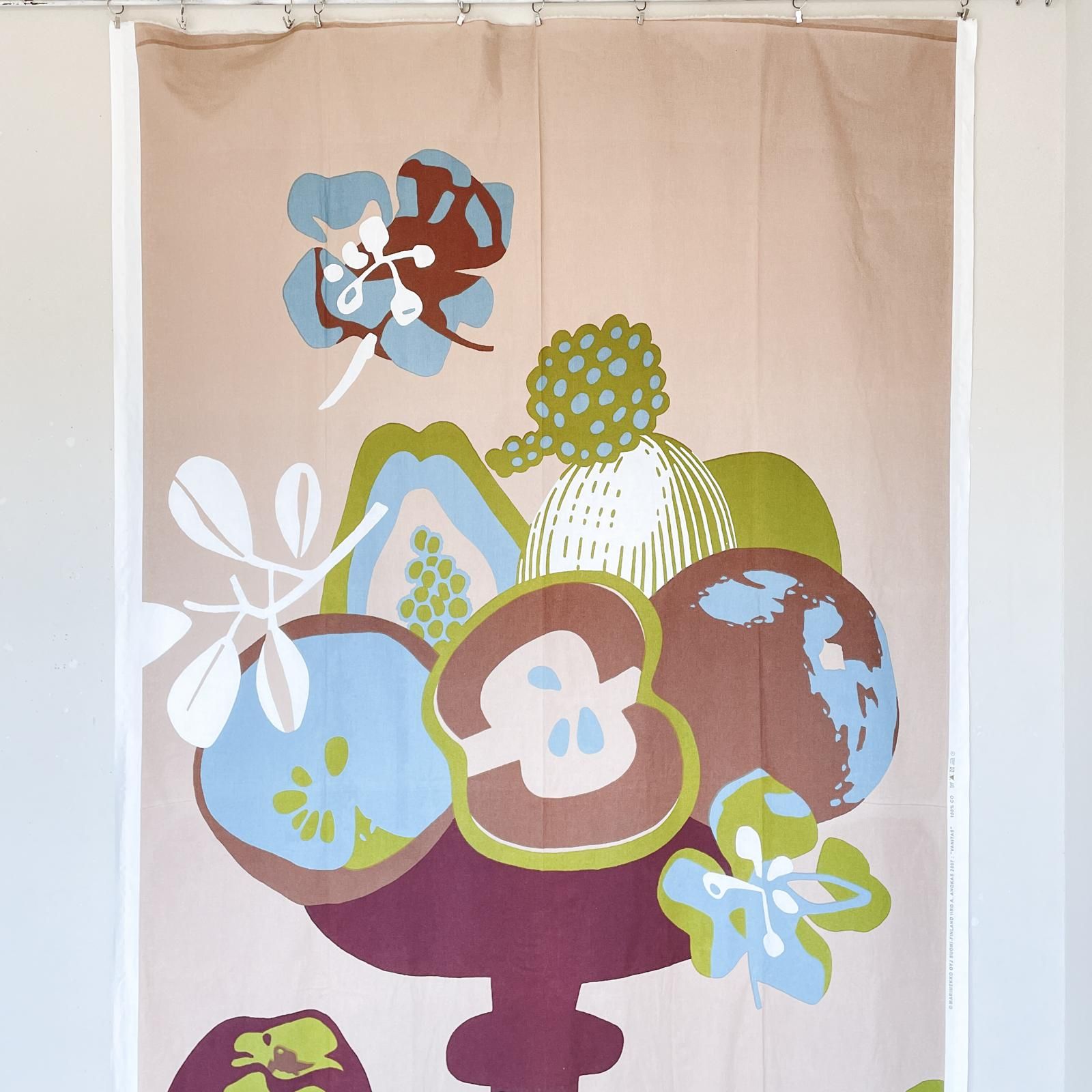 マリメッコのヴィンテージのテキスタイル、VANITAS (ヴァニタス) です。コンポートから溢れるフルーツをモチーフに、フルーツの断面や植物を大柄に描いた大胆な絵柄です。テーブルクロスや間仕切り、カーテンにおすすめの薄手の生地です。端は切りっぱなしです。