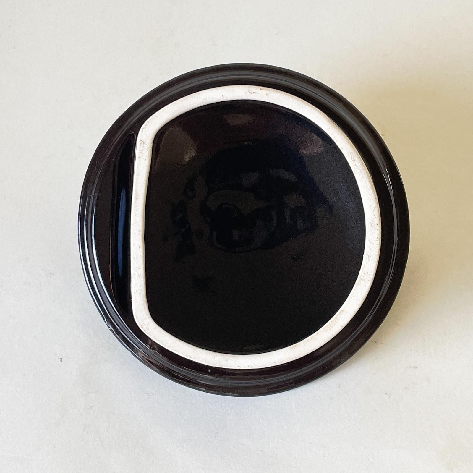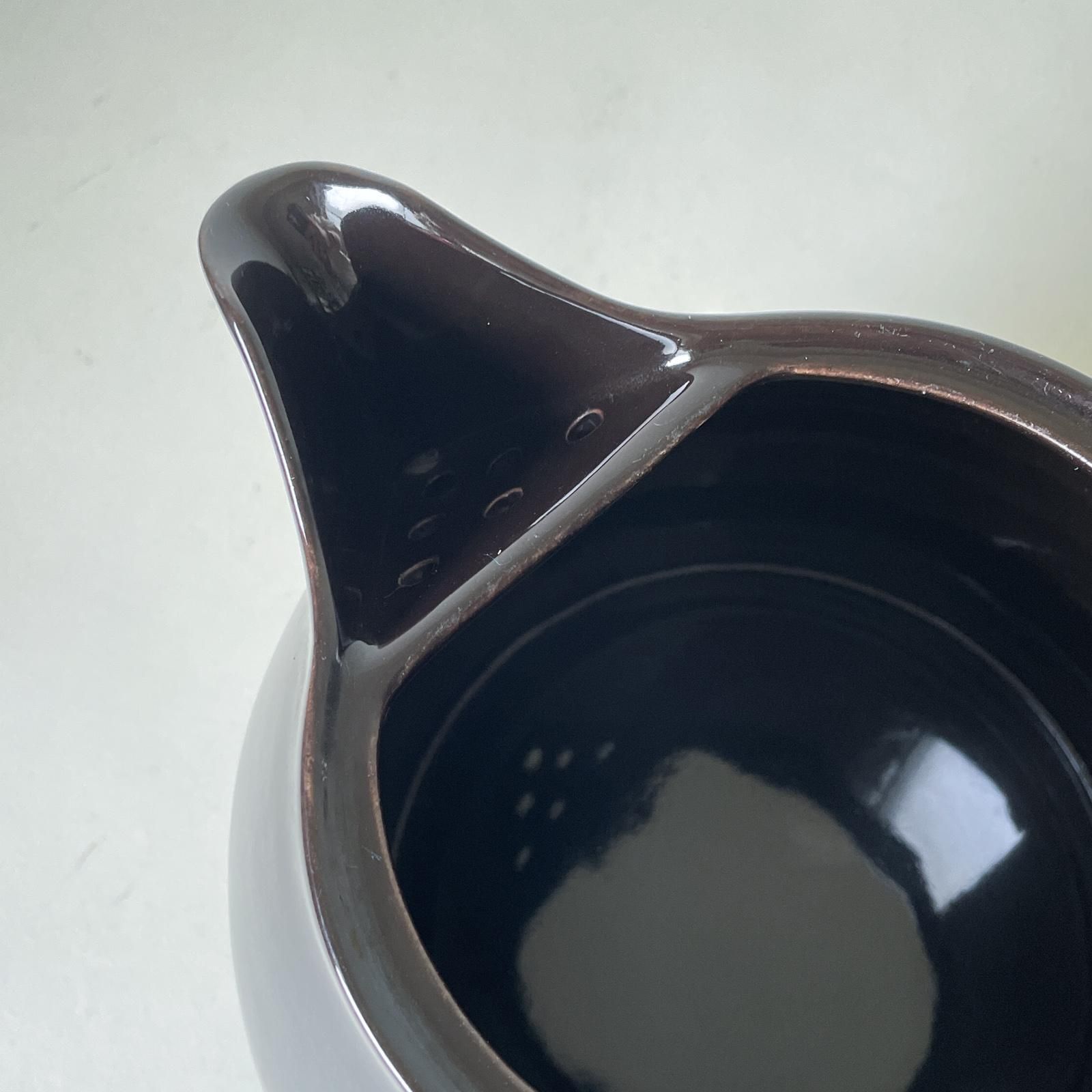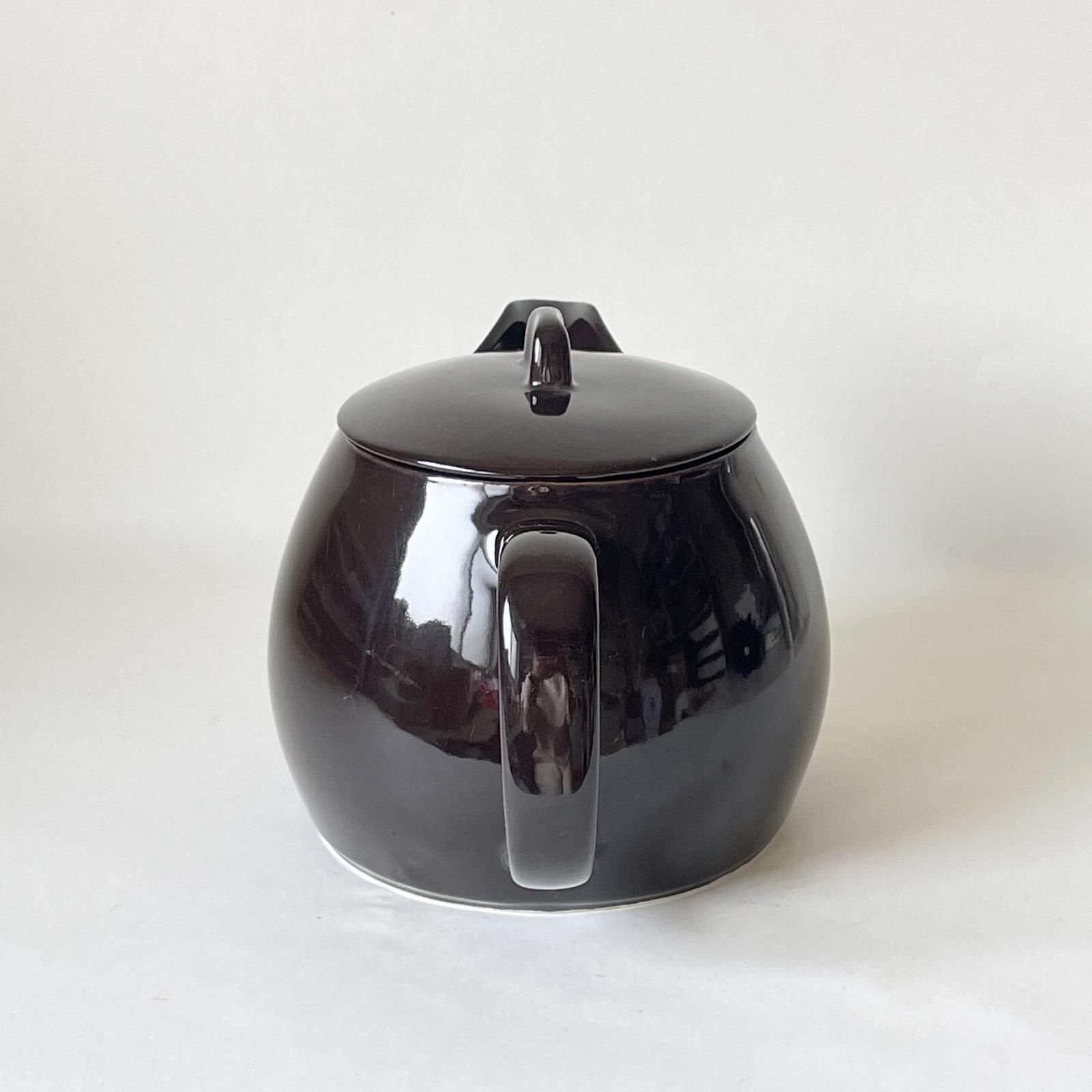 ARABIAで1952年から1970年まで製造されていたKF-3のティーポットです。コロンとした丸みのある愛らしいフォルム、注ぎ口の緩やかなカーブとフタのつまみのデザイン、そして光沢のあるのブラックの色合い。細部にまで魅力が詰まった逸品です。茶こし穴がついていて容量は1500ccです。