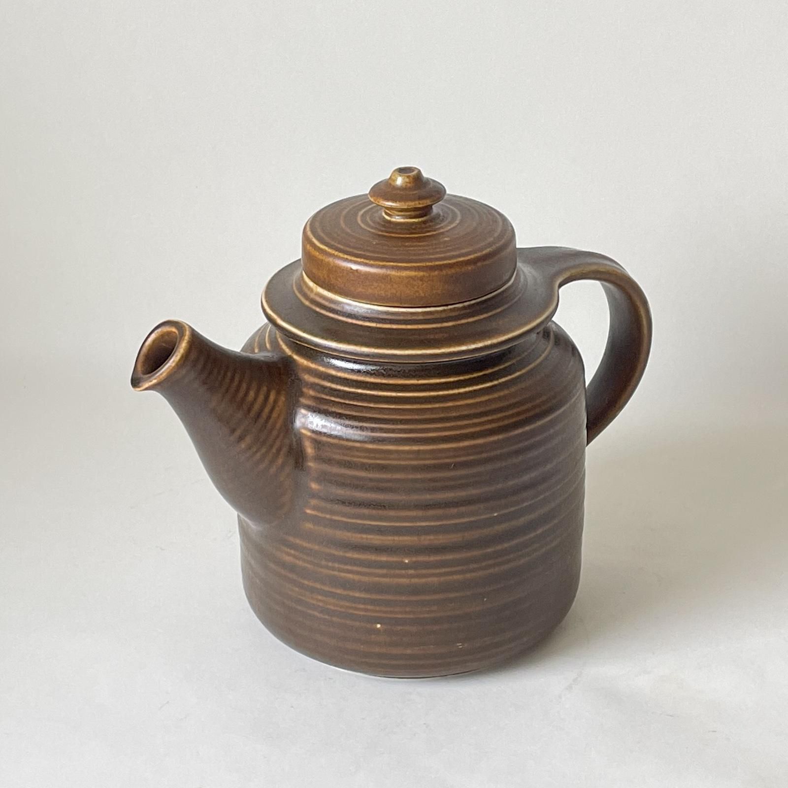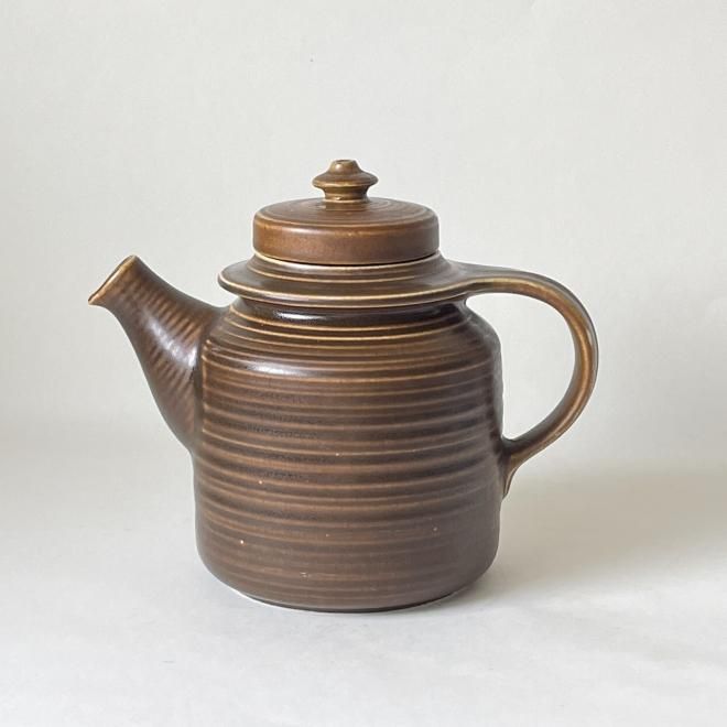 ARABIAでウッラ・プロコッペがデザインしたGDシリーズのティーポットです。1960年代に生産されていました。波紋のような滑らかな凹凸とハンドルのつき方やフタのツマミの持ちやすく個性的な形に、プロコッペらしい独自のデザイン性を感じます。釉薬の出具合によって、個体差が出るこのポットは、ブラウンの濃淡がかもしだすボーダー柄が味わい深いです。