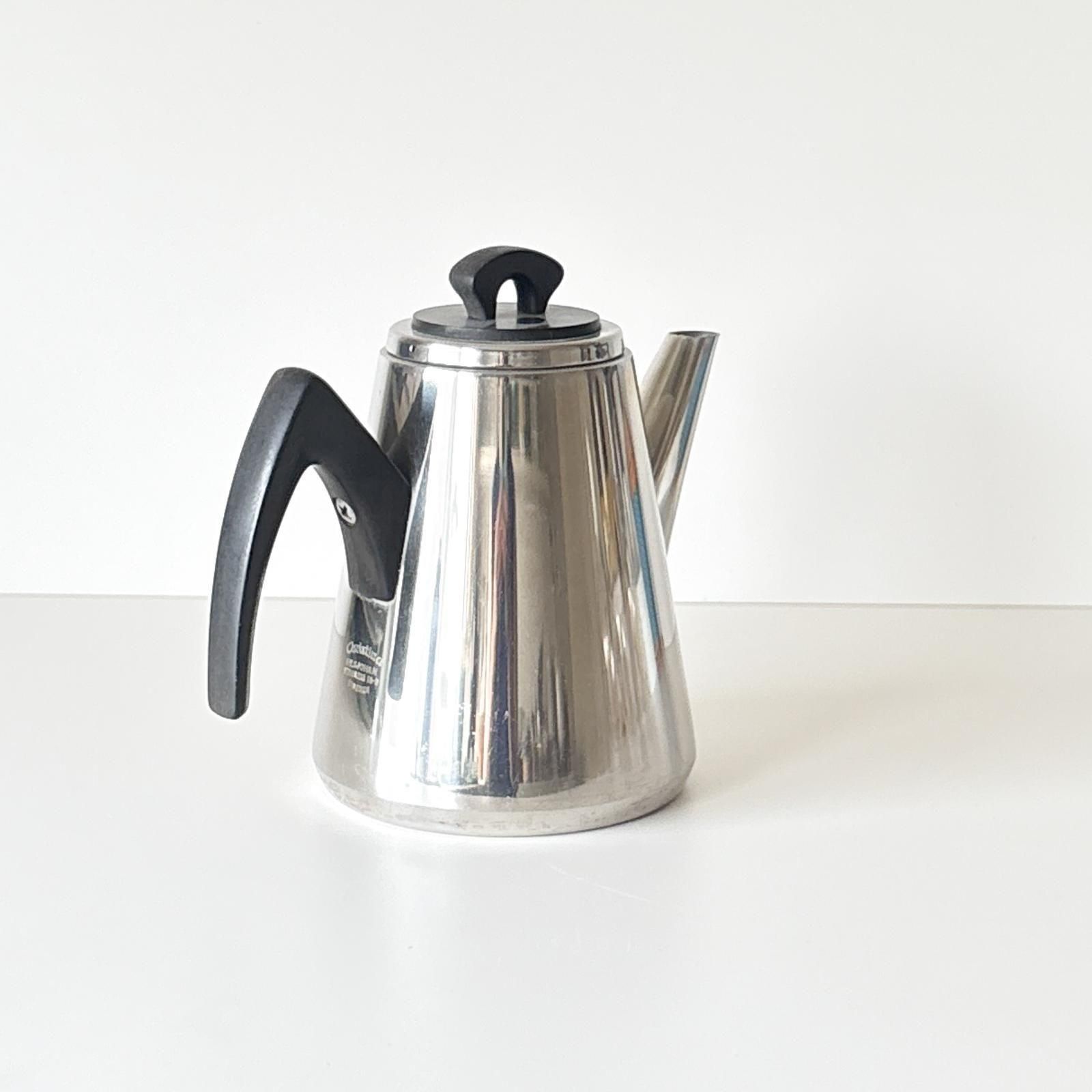 スウェーデン・NILS JOHAN|ニルスヨハン社製、クリスティーナシリーズのコーヒーポットです。円すい型の本体に、ハンドルとフタの持ち手はブラックの樹脂が組み合わされています。ハンドルの緩やかなのカーブ、フタの持ち手の扇形など、細部にわたったデザインのこだわりに魅力を感じます。