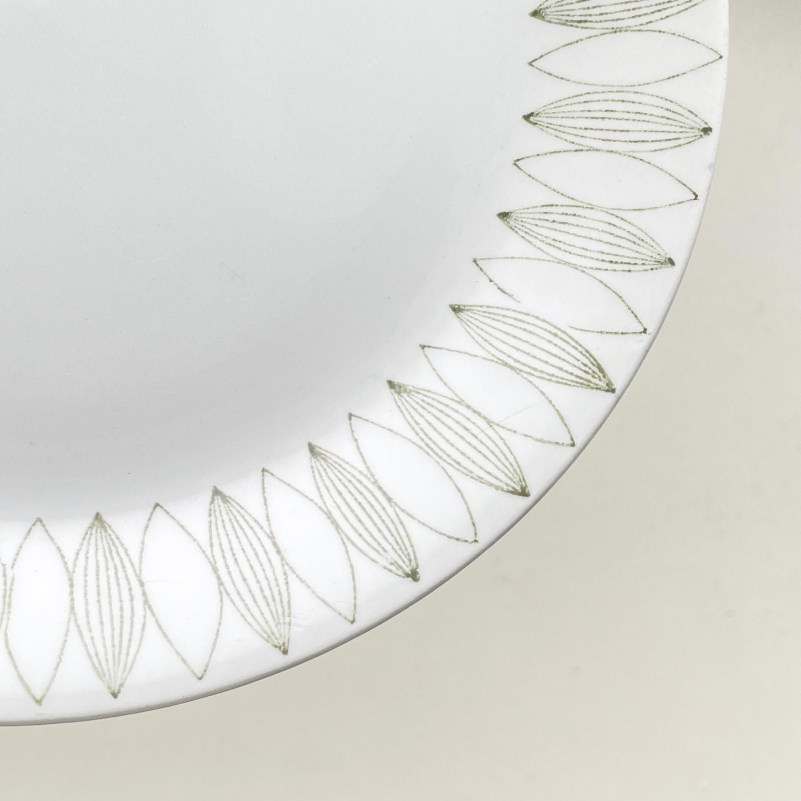 1950年代から1960年代にかけてアラビアで作られていたプレートです。デザインしたのはライヤ・ウオシッキネン。植物モチーフを得意とするデザイナーらしく、縁取りされた白い葉とストライプの葉が交互に並んで、プレートのフレームを埋めています。
