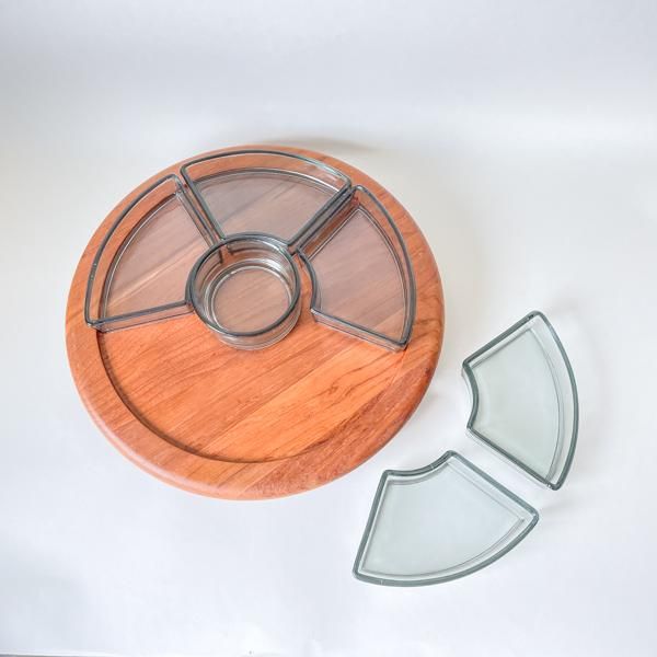 デンマーク製のガラスボウルとターンテーブルのセットです。グレーのグラスの扇型が5個と中心には丸いグラスがセットされ、回転するチークのトレーはしっかりと厚みのある品質の高い素材です。