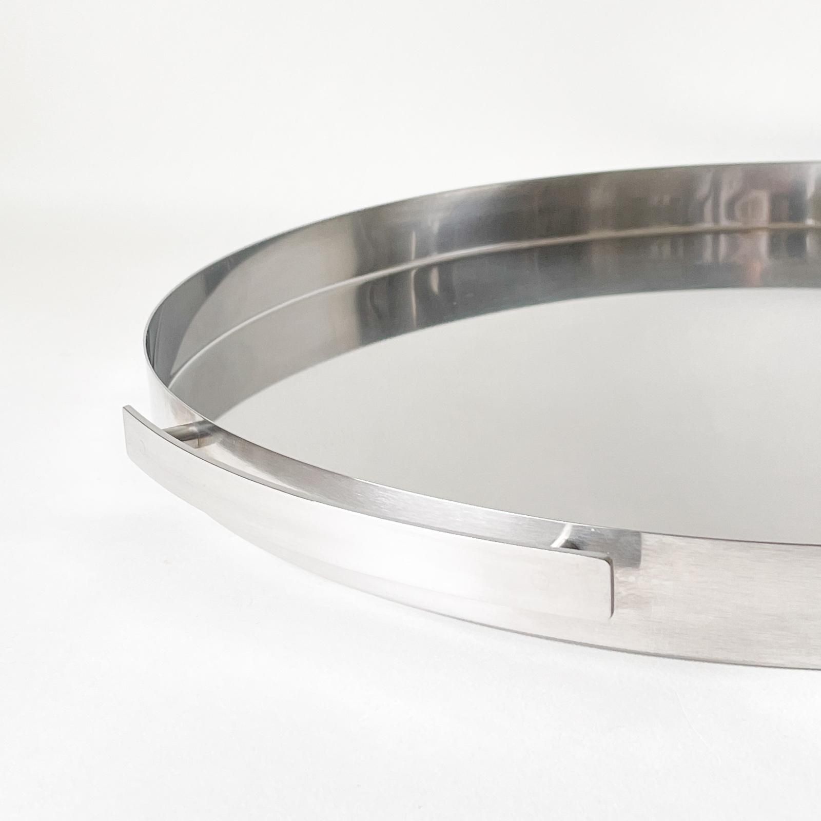 デンマークの老舗メーカーSTELTON|ステルトン社で、ARNE JACOBSEN | アルネ・ヤコブセンがデザインした、ヴィンテージのステンレストレーです。CYLYNDER LINE | シリンダーラインという名のこのシリーズは、繋ぎ目のない円柱形が特徴のシンプルで美しいグッドデザインです。このハンドル付きのトレーは、直径33cmと大きなサイズなので、気候のいい時期にはお庭やベランダで、スモールテーブル代りにも使えます。冷たい飲み物とスウィーツ、またはお酒とおつまみなどをのせて。ダイニングやリビングでは置いておくだけで、空間を変えるほど雰囲気があり、このトレーを使った素敵なシーンがいろいろと浮かびます。デザインの美しさと機能性を兼ね備えた、北欧らしいデザインです。