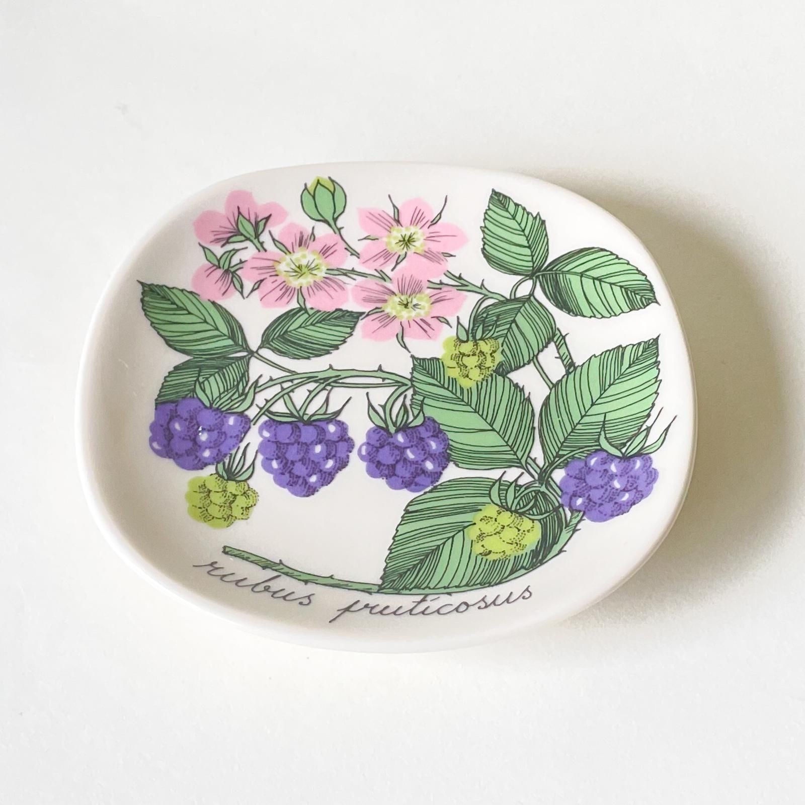 ARABIA BOTANICAシリーズの陶器のウォールプレートです。鮮やかな紫色のブラックベリーの実とピンクの花が可憐に描かれています。デザインしたのは ARABIAで数々の名作を手掛けたESTELI TOMURA (エステリ・トムラ)で、裏面には手描きのサインが印刷されています。そのまま置いておいても絵になりますし、アクセサリーなどを置くトレーとして使うのもいいですね。