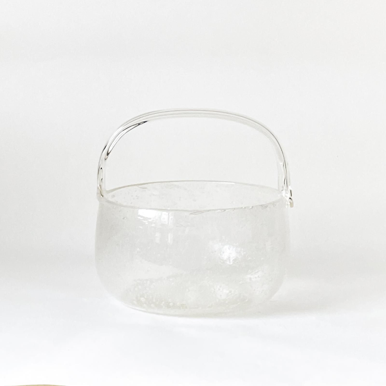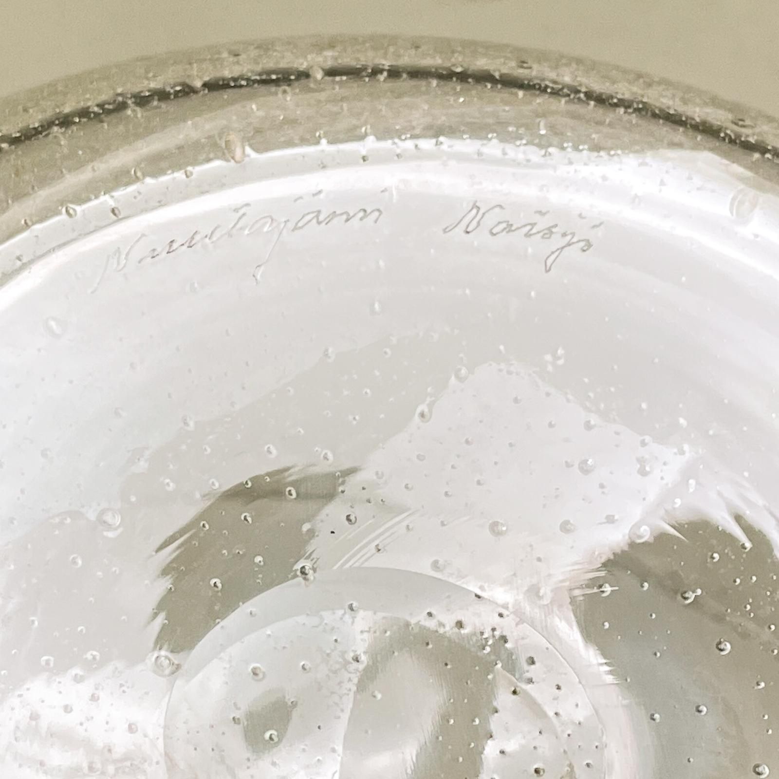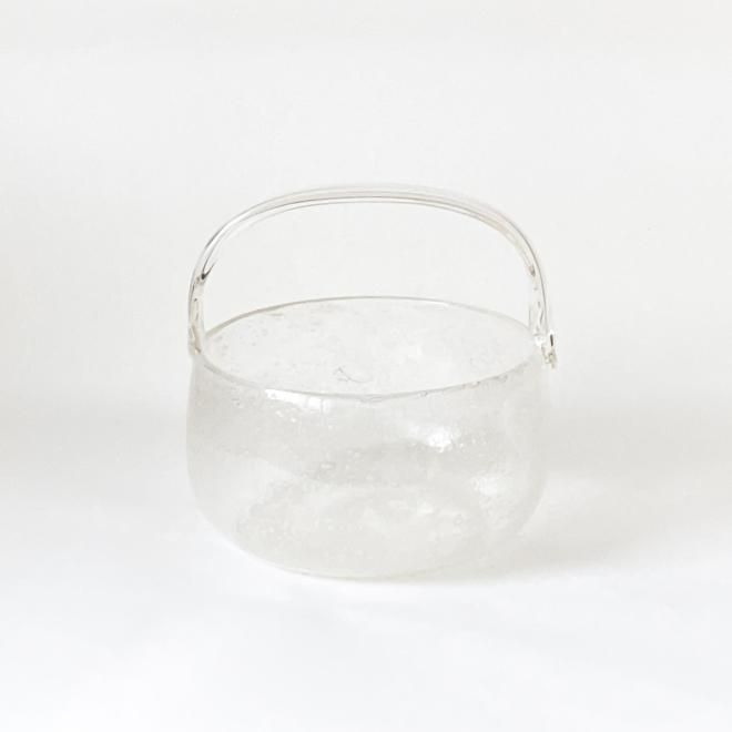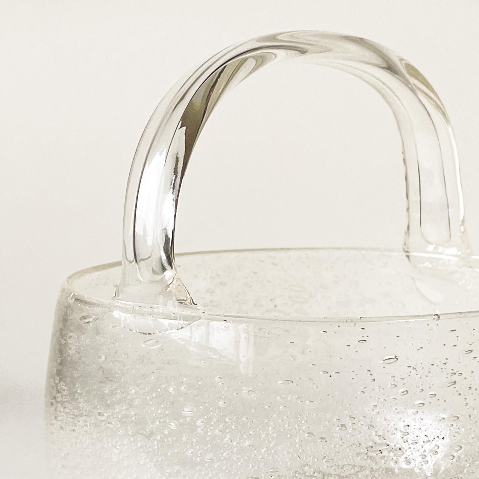 ハンドメイドで作られたガラス作品は、全体に入った様々な大きさの気泡や、ハンドルの接着箇所など、ひとつひとつの個体差に手仕事の魅力が感じられます。そのまま置いておくだけで絵になる作品ですが、柑橘を入れたり、お花を生けたり、暮らしの道具としてお使いいただくと、日々の暮らしに潤いがうまれます。雰囲気たっぷりのガラス作品をお楽しみください。裏面にはNuutajarvi Nasjjoと手書きで入れられています。