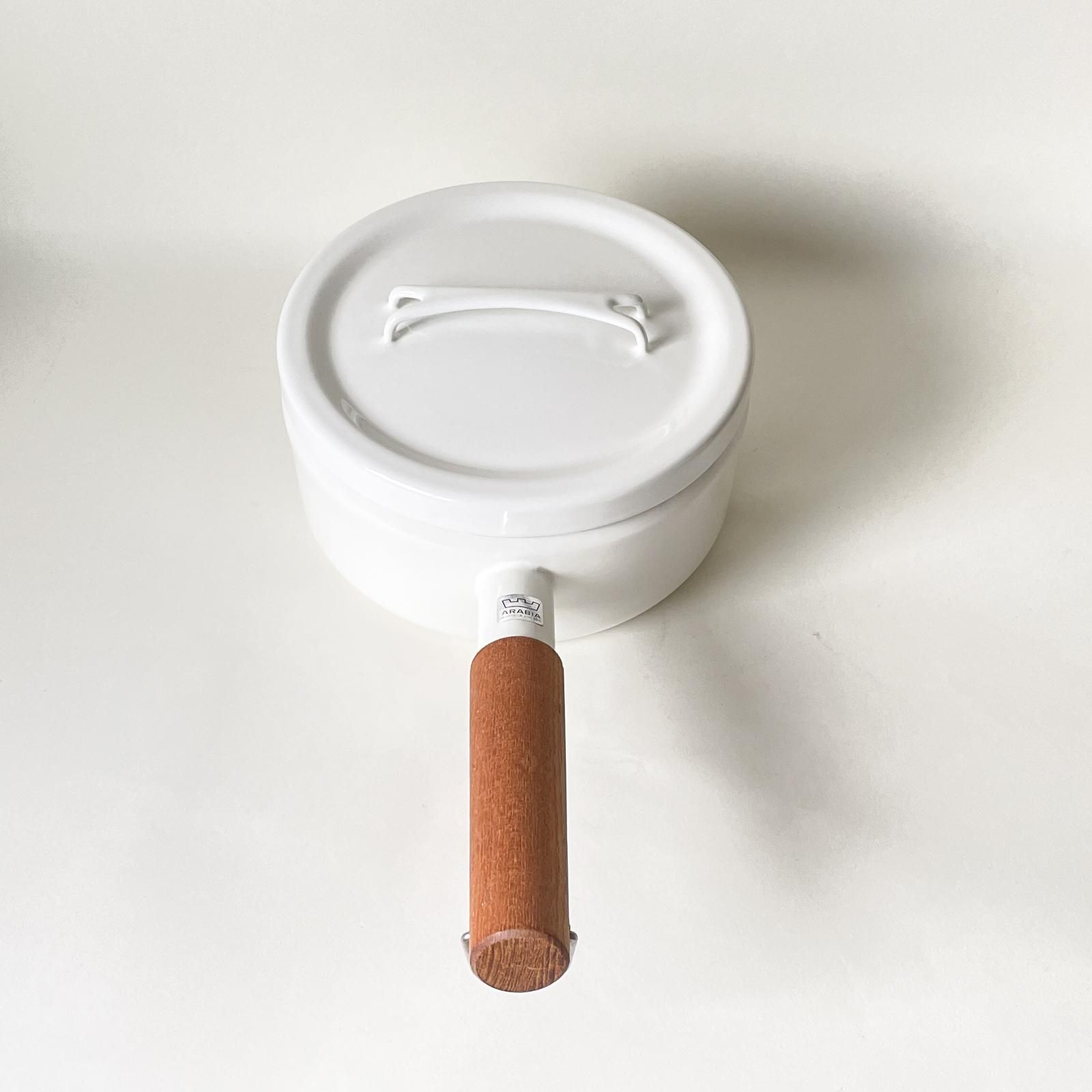 フィンランドで1960年から1970年代に生産されていた、フィネルのホーローの片手鍋です。ハンドルに木を使ったところが北欧らしいデザインです。デザインしたのはフィネルで数々のグッドデザインの調理器具をデザインしたセッポ・マッラト。このシリーズは、カラーバリエーションが豊富ですが、真っ白なホーローは清潔感があって、静かな魅力があります。片手鍋はスープや煮込み料理など、日々の道具として使用頻度の高いアイテムです。