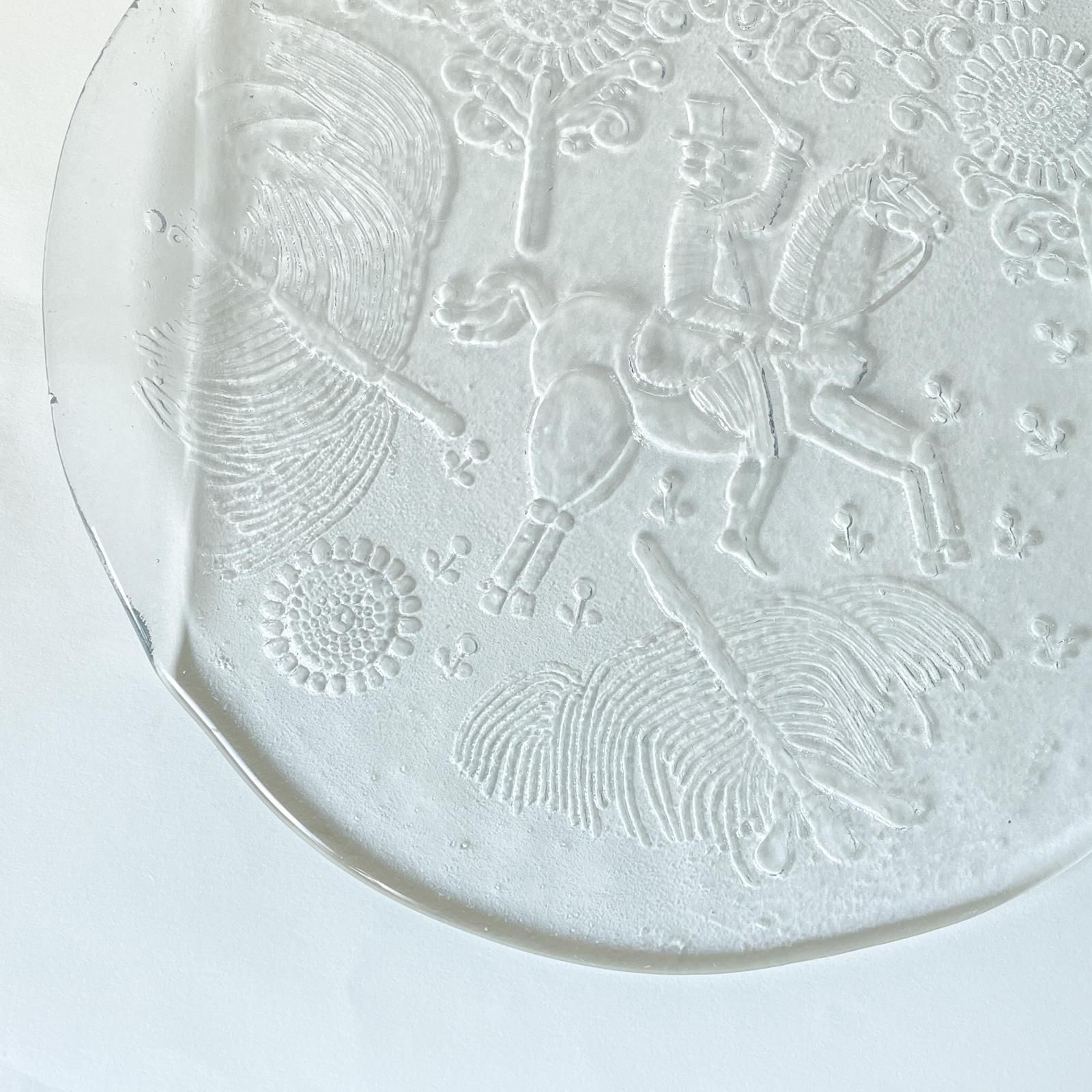 スウェーデン製のガラスのチーズプレートです。プレス加工によって、裏面に刻まれた絵は、草花が咲く草原をハットを被り正装した男性が、馬に乗って走っている様子が物語のワンシーンのようで、ロマンティックなデザインです。フチは自然な仕上がりに任せた有機的なのも魅力的です。両サイドを立ち上げてチーズトレーに仕立てていて、いい味わいを紡ぎ出しています。絵柄は裏面に凹凸で表現されていて、表はフラットなのでお手入れしやすいです。