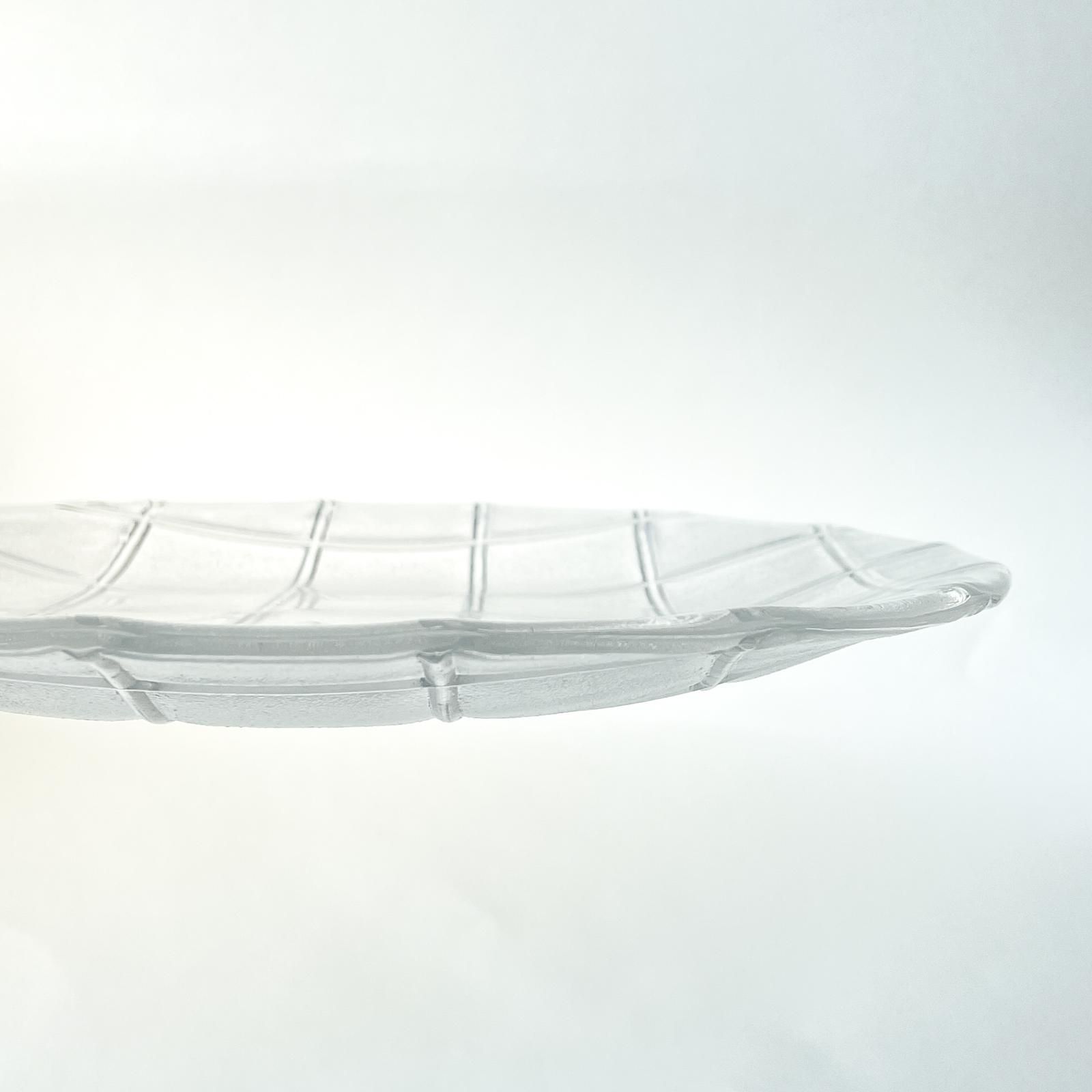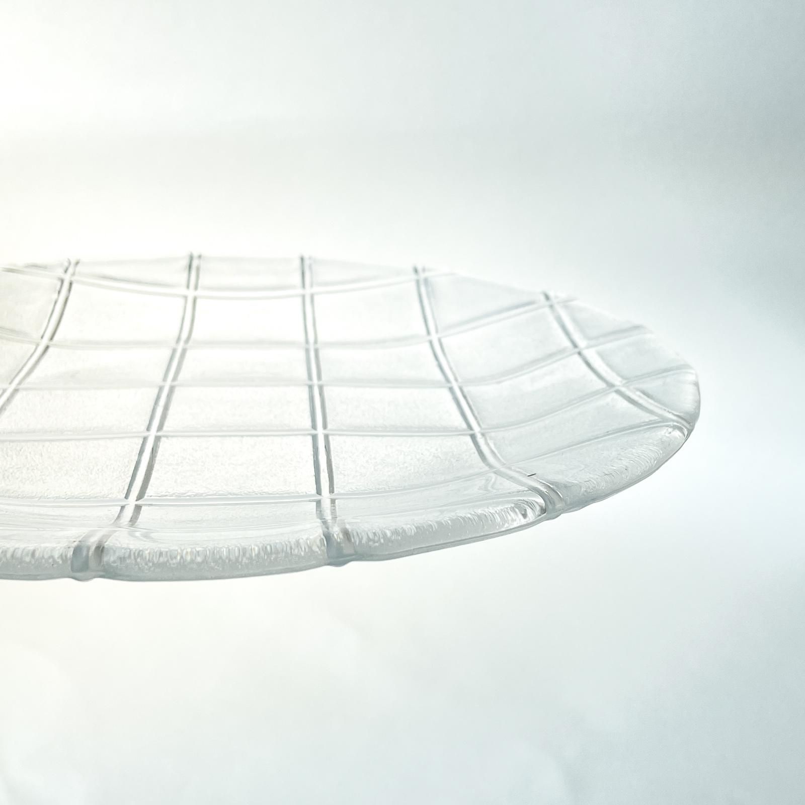 スウェーデンで作られていた直径26cmのガラスの大皿です。大きなチェック模様と、有機的なフチのラインがおおらかで魅力的です。しっかりと厚みのあるガラスの器は、影もきれいに写してくれて存在感があります。チェック模様は裏面に入っていて、表面はつるりとスムースなのでお手入れしやすいです。