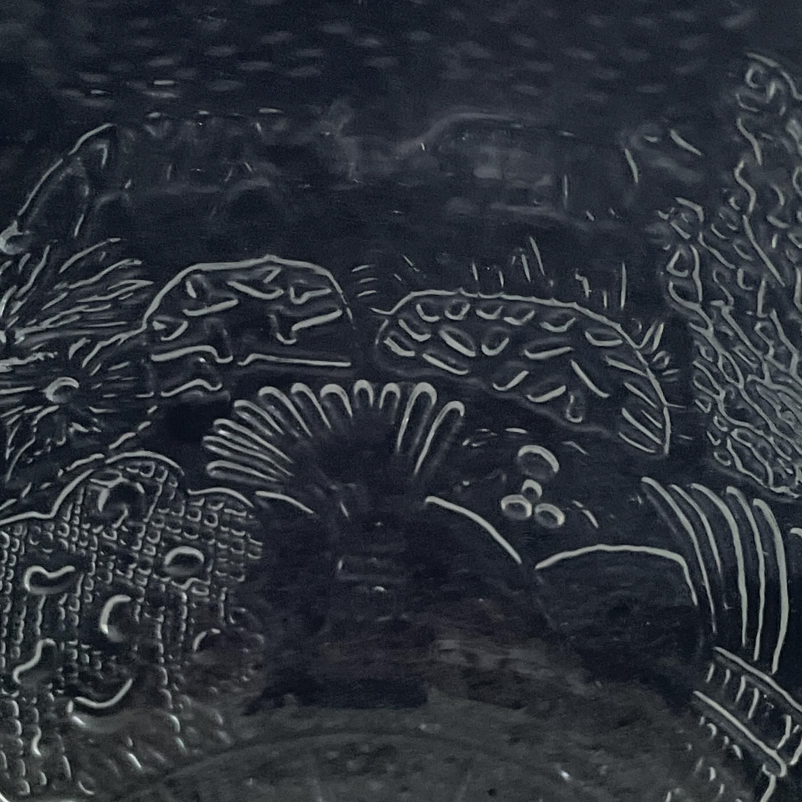 フィンランド・ヌータヤルヴィでプレス加工によって、1970年から1980年代まで作られていた、FAUNA;ファウナシリーズのベースです。デザイナーは OIVA TOIKKA・オイヴァ トイッカです。馬、牛、犬、小鳥や人がいる大草原を描いた原風景を、ガラスにのせて表現した、オイヴァの代表作のひとつです。グラスを回しながらじっくり見てみると、様々な植物や動物が現れて、何周も回してしまいます。
