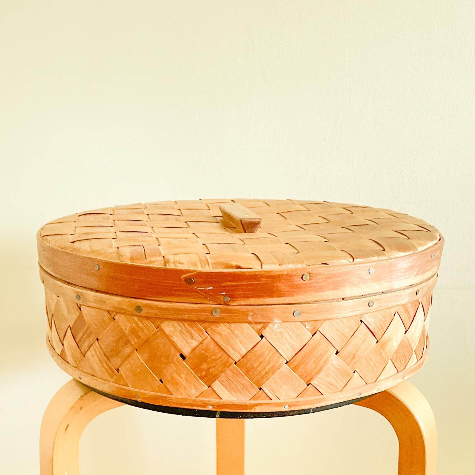 スウェーデン製の円形のバスケットボックスです。スウェーデンでは「スポーンコリ」と呼ばれ、昔から親しまれているバスケットです。直径36cmあるバスケットは、スウェーデンで親しまれるクネッケという平焼きパンをはじめ、パンや焼き菓子をしまって使われていました。食品を入れる他、大切にしているものをまとめたり、レターボックスにしたり、いろんな使い方が浮かびます。