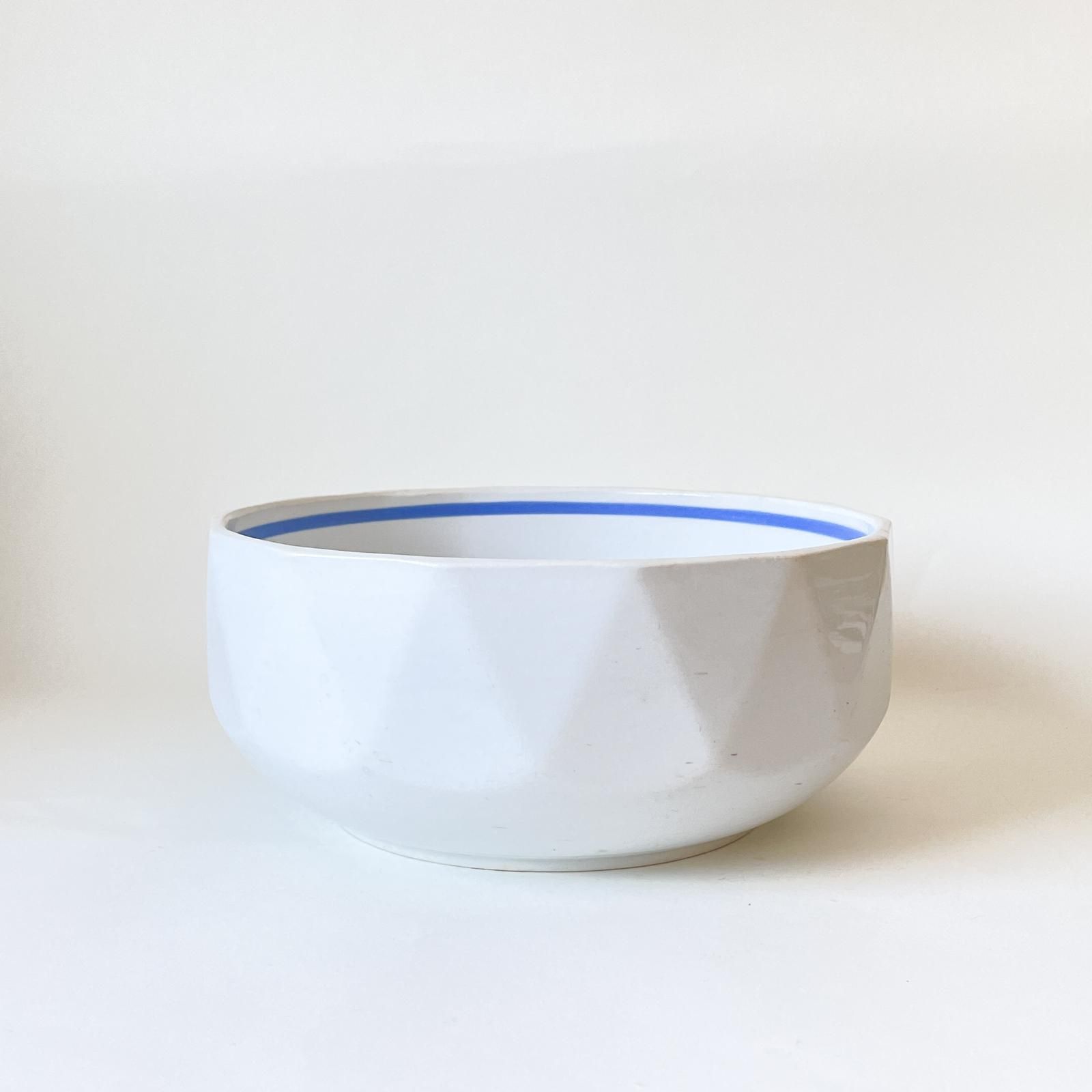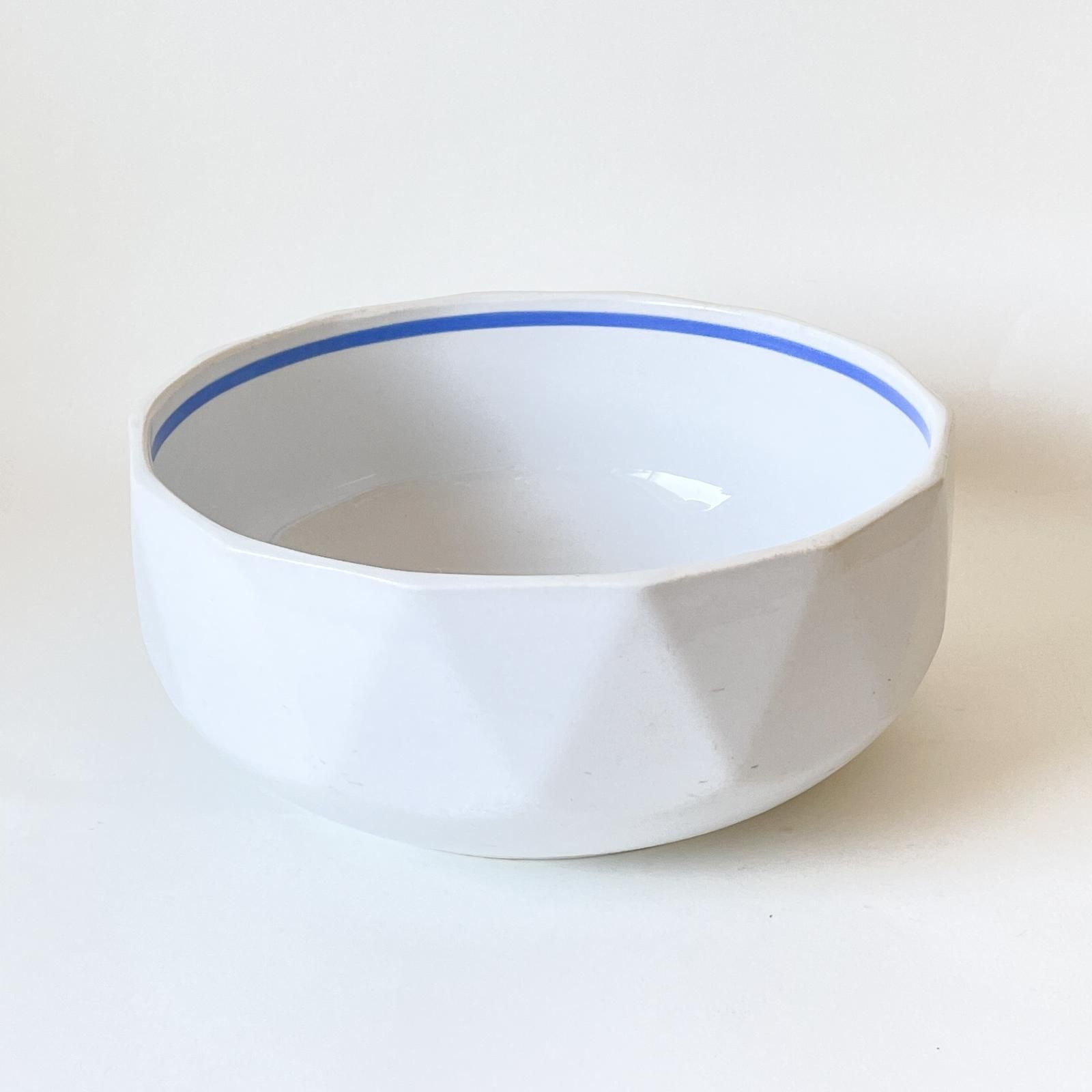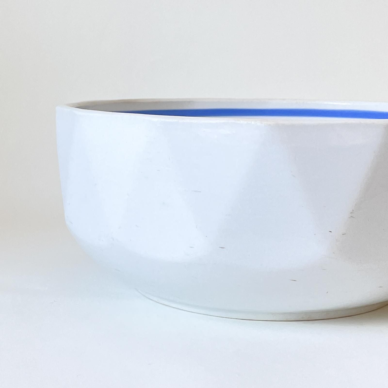 ARABIAで 1932年から1949年に製造されていた陶器のボウルです。内側には水色のラインが手描きされ、側面は △▽△▽ と三角形が交互に並ぶように綿取りされた、モダンなデザインのボウルです。