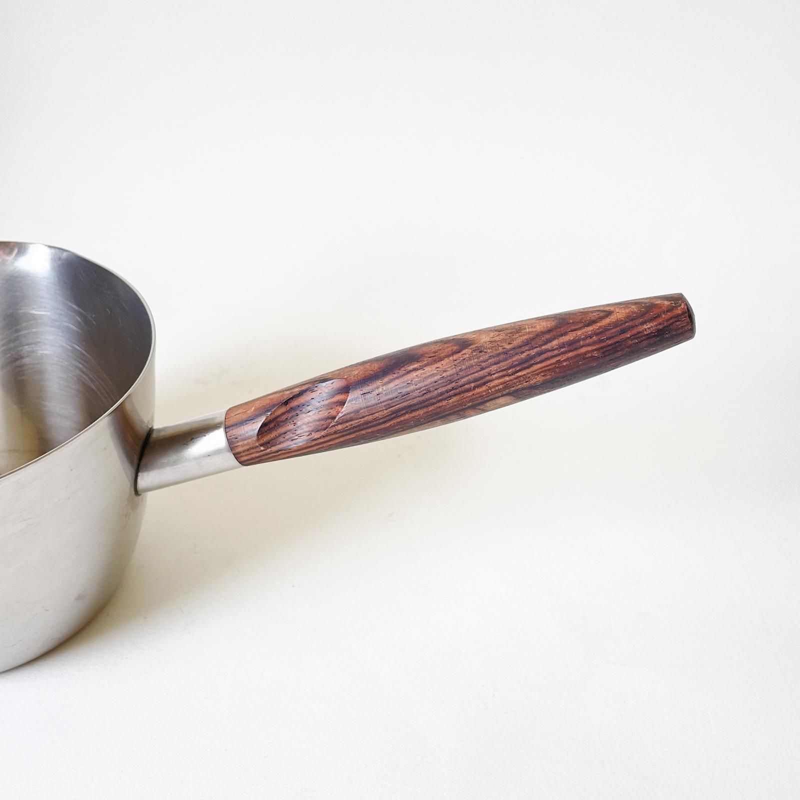 デンマークの老舗メーカーSTELTON|ステルトン社で生産されていた、ヴィンテージのミルクパンです。深さがしっかりあって容量は500mlあり。注ぎ口は右利き、左利き両方使える、ユニバーサルデザインです。ハンドルはこげ茶色のローズウッドが使われ、親指をあてて安定させるために凹みが作られていて、使いやすさを追求したデザインです。ステンレスとローズウッドの組み合わせの美しさと機能性を兼ね備えた、北欧らしいデザインです。