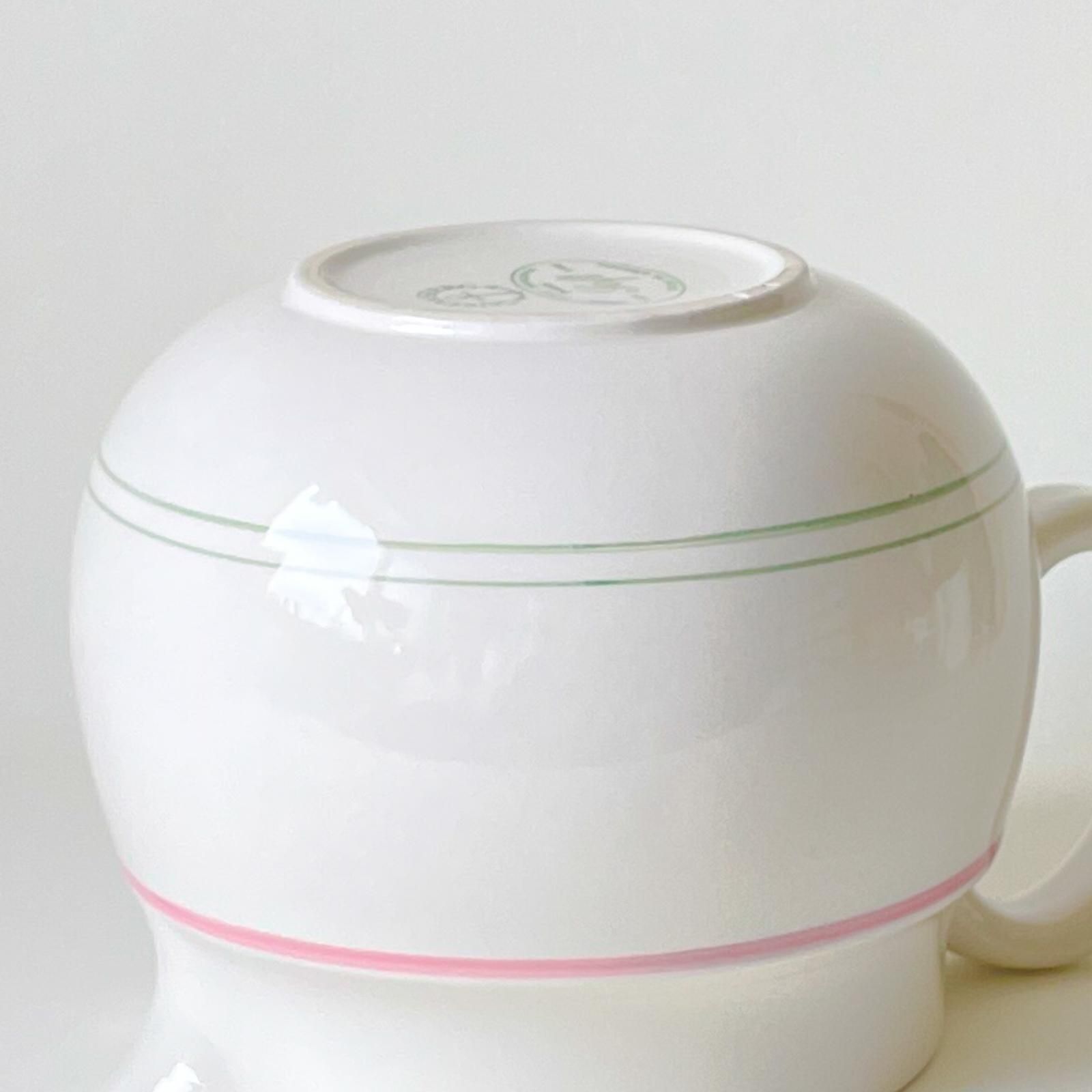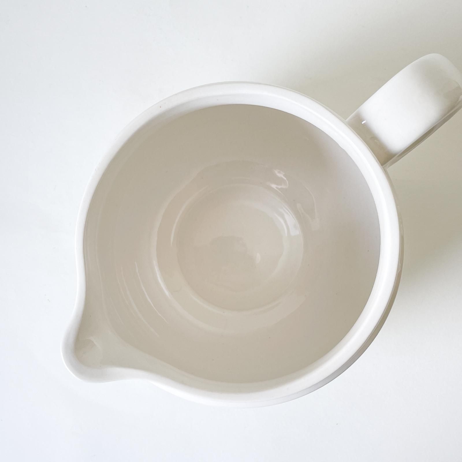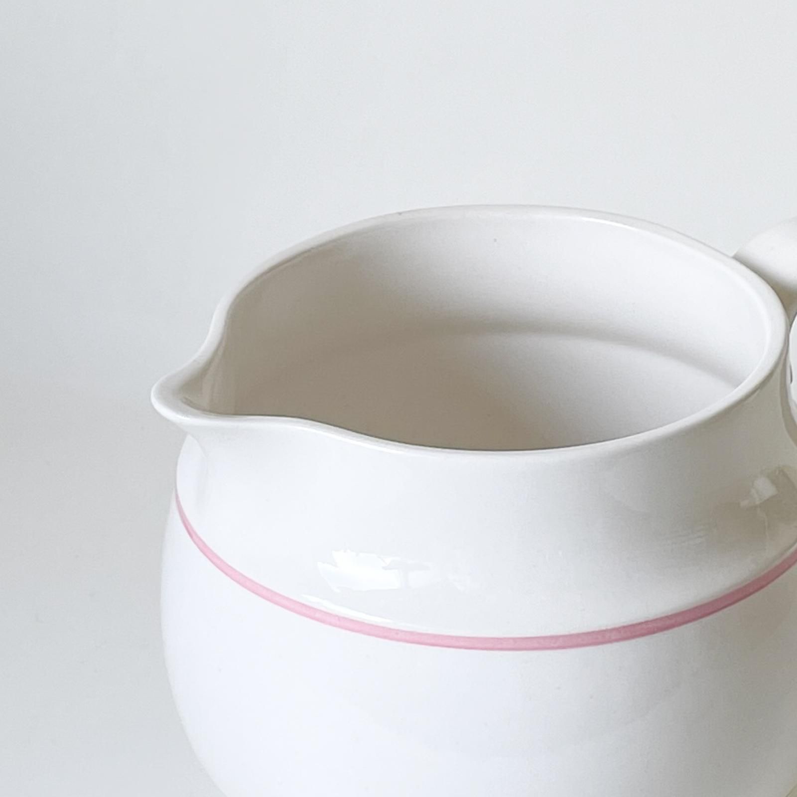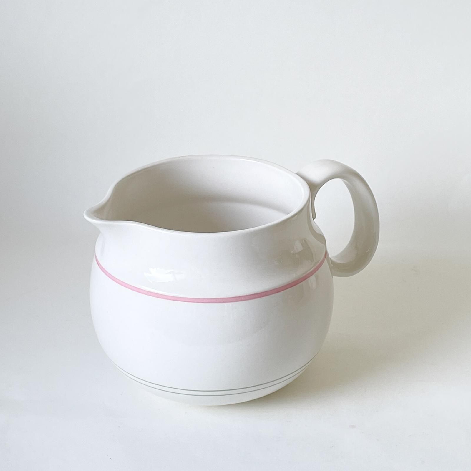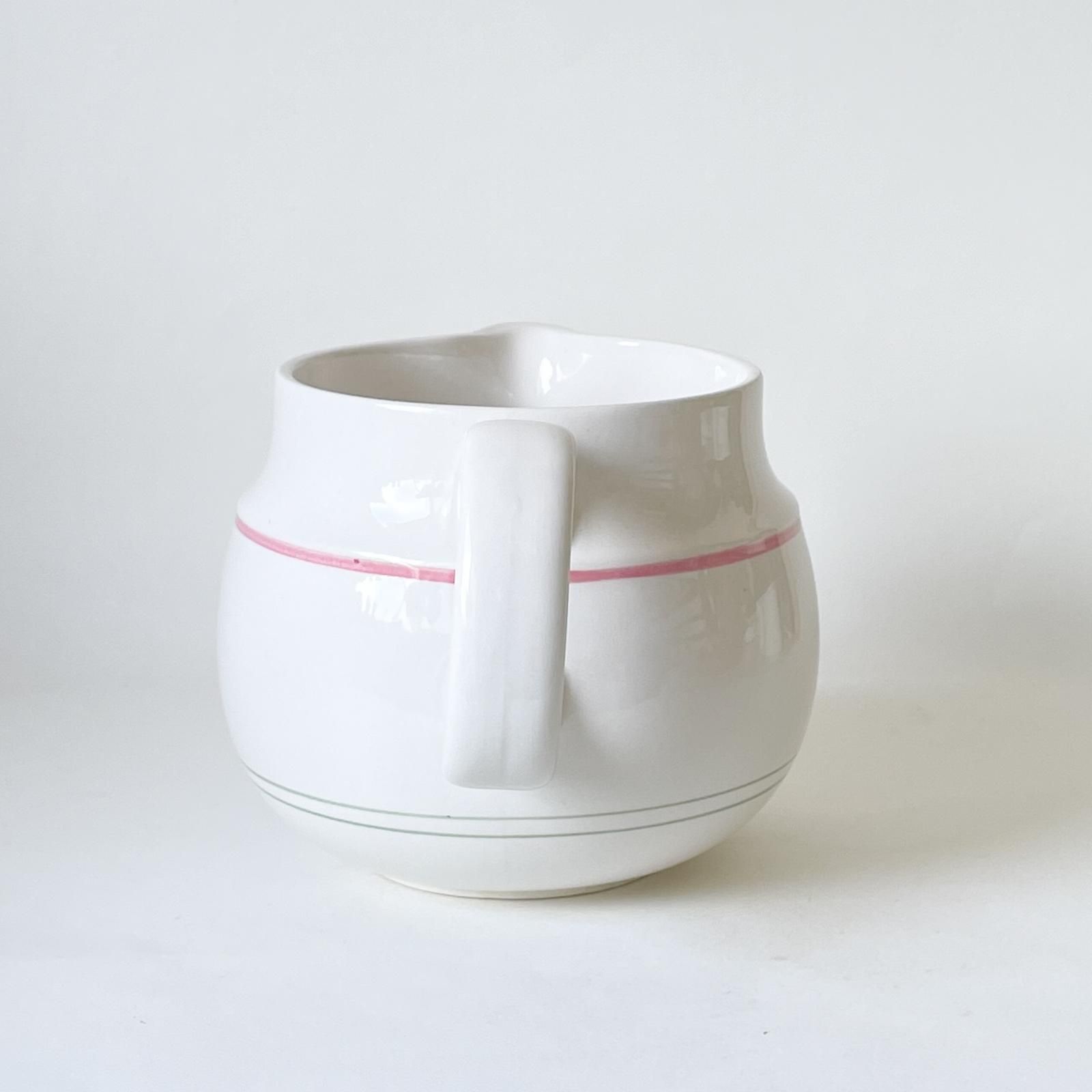スウェーデンの老舗陶器メーカー・グスタフスベリ製のSOFTシリーズの陶器製ジャグです。久しぶりにこのシリーズのジャグを見つけました。コロンとまあるい安定感のある形で、アイボリー地にピンクとミントグリーンのラインが入り、その色合いの組み合わせがとても魅力的です。そのまま置いておくだけで絵になる存在感がありますが、植物を飾って花器に使うのもすてきです。