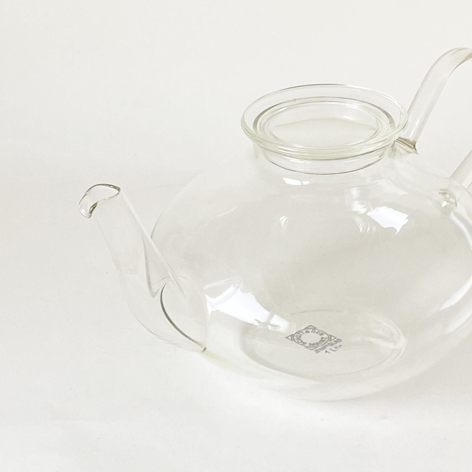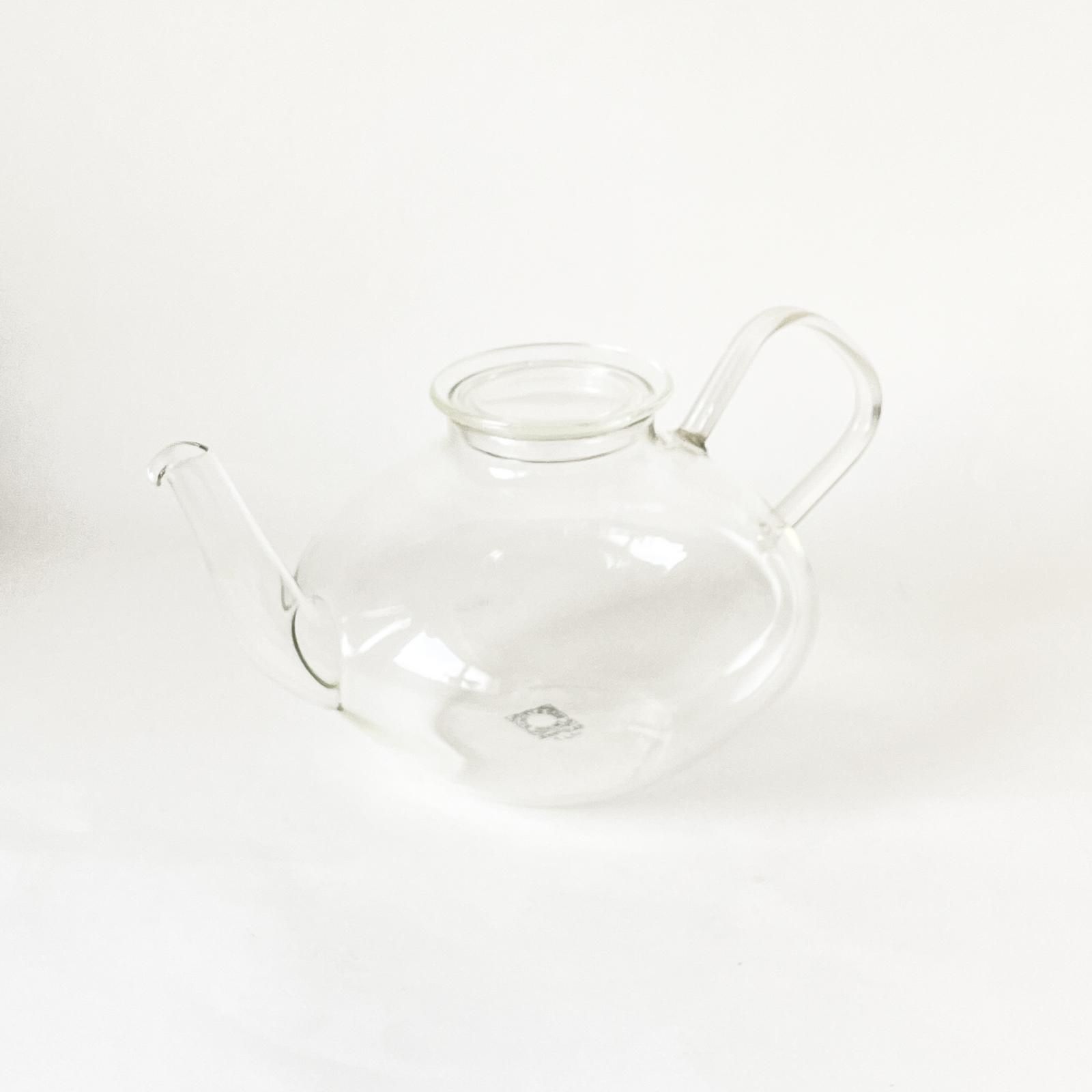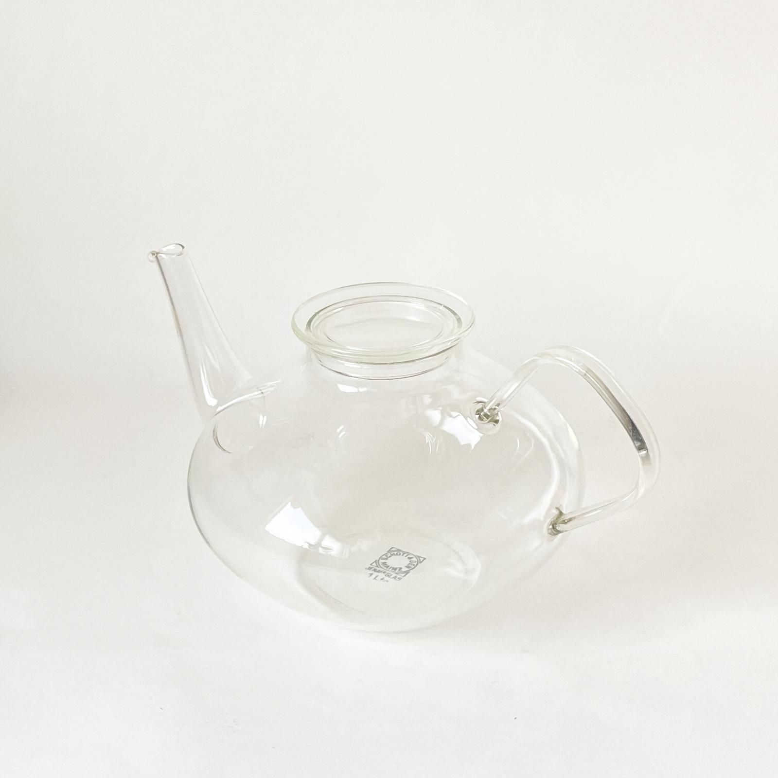 ドイツの耐熱ガラスメーカー・JENA GLAS|イエナガラス の耐熱ガラスのティーポットです。横から見ると円盤型でコの字型のハンドルが特徴的で、注ぎ口はシュッとした美しく、優美なデザインです。ガラスポットには、ハーブをたっぷりいれてハーブティーに、茶葉のきれいなフレーバーティーを淹れると、目でもたのしめておすすめです。