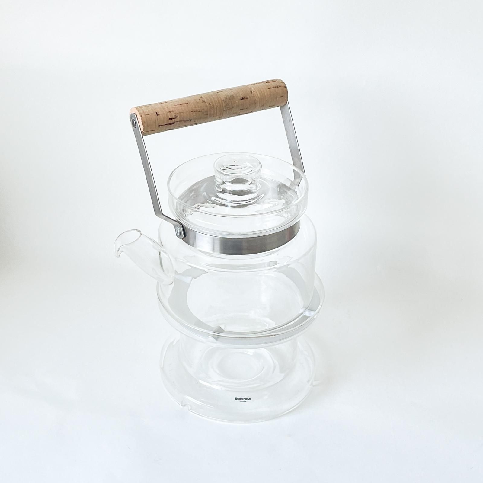 スウェーデンのプロダクトデザイナー、シグネ・ペーション・メリンがデザインし、1971年にBODA NOVA社から発売された耐熱ガラスシリーズのティーポットとウォーマーのセット。こちらはSサイズです。円柱形のすっきりとしたデザインのポットはマウスブロウ(口吹き)によって作られたもの。そのため注ぎ口とフタそれぞれに個体差があり、ハンドメイドならではの魅力が感じられる逸品です。ウォーマーにカップインキャンドルを灯して、テーブルで温度をキープしながらゆったりとティータイムを楽しめます。( 直火にはお使いいただけませんのでご注意ください)
