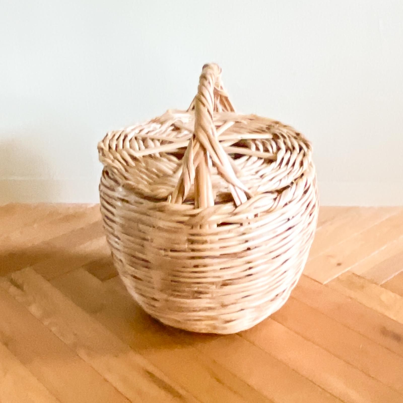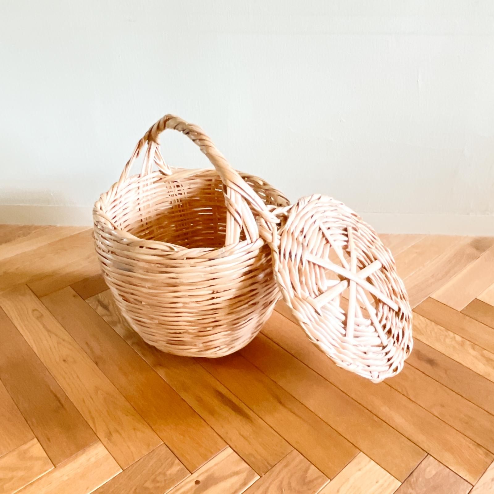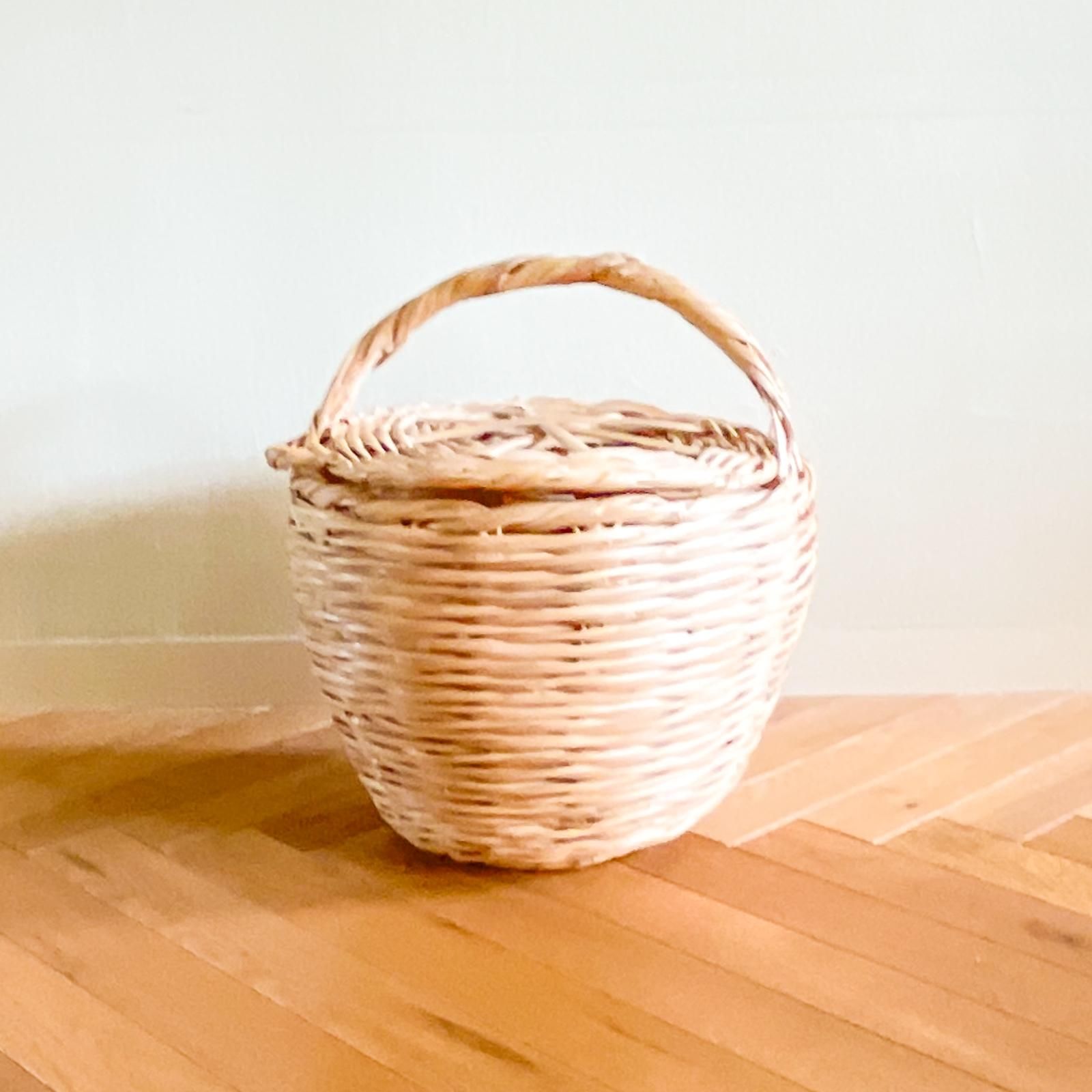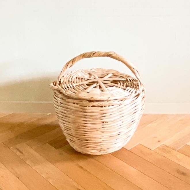 スウェーデン製のヴィンテージバスケットです。スウェーデンではマッシュルームバスケットとして作られたもので、当時はキノコ狩りに使われていました。このバスケットは子供用の小さなものからかなり大きなものまで、さまざまなサイズが作られていましたが、こちらは中間のサイズです。丸みのある形がより一層かわいいバスケットです。フタがついていて収納力があるので、中に収納しながら部屋に置くと存在感のあるいいインテリアになります。カケなど目立つダメージはないので、このカゴを探されていた方はこの機会にぜひどうぞ!