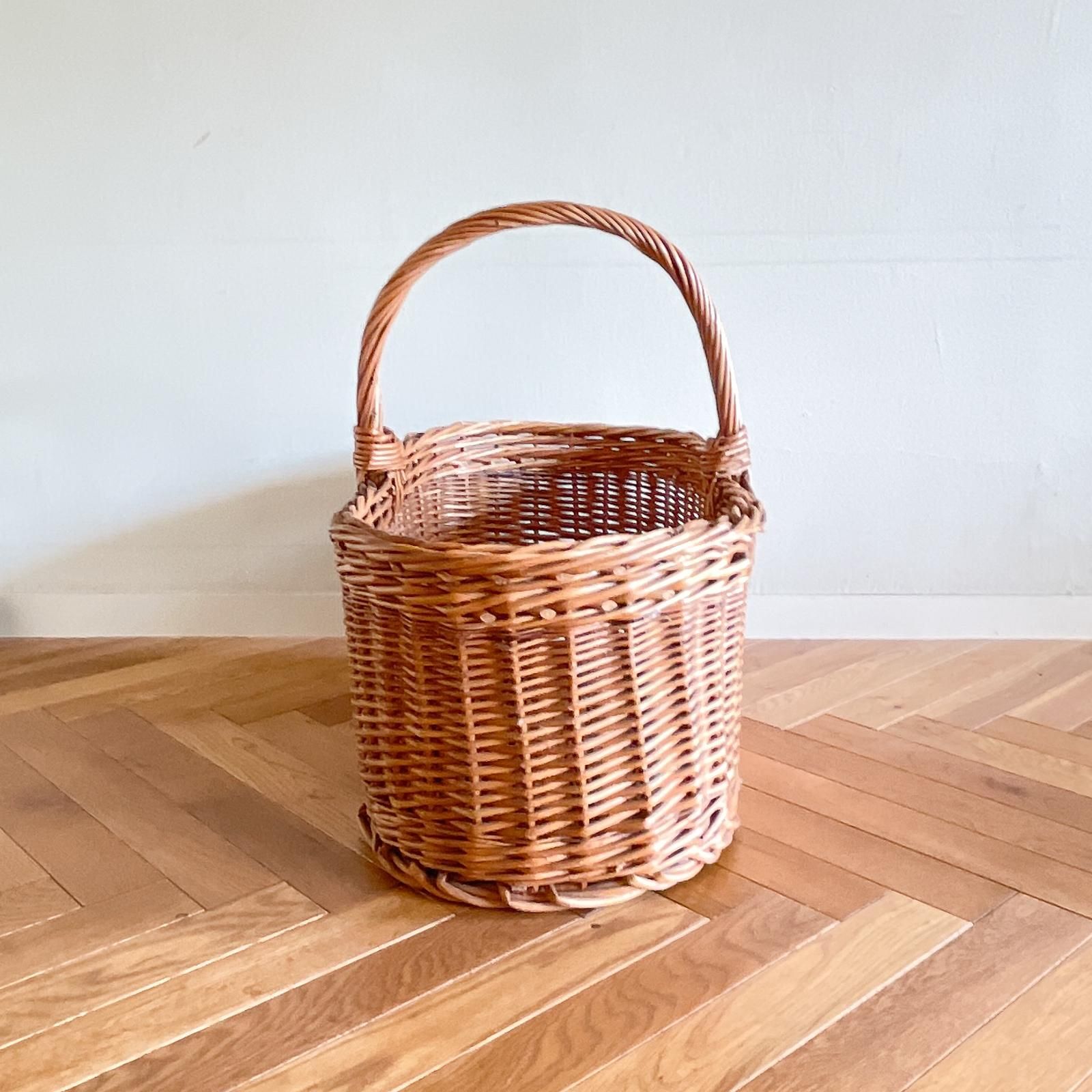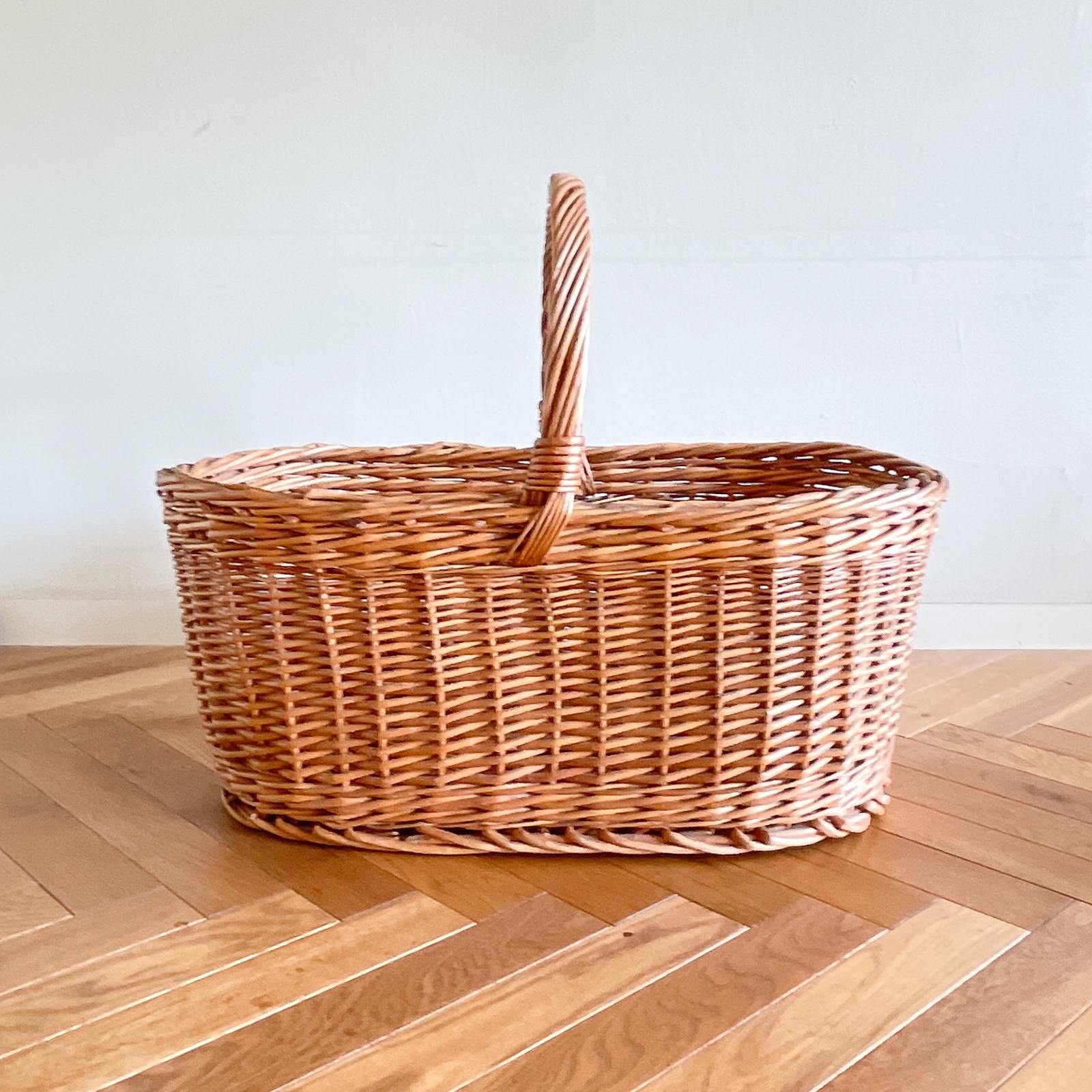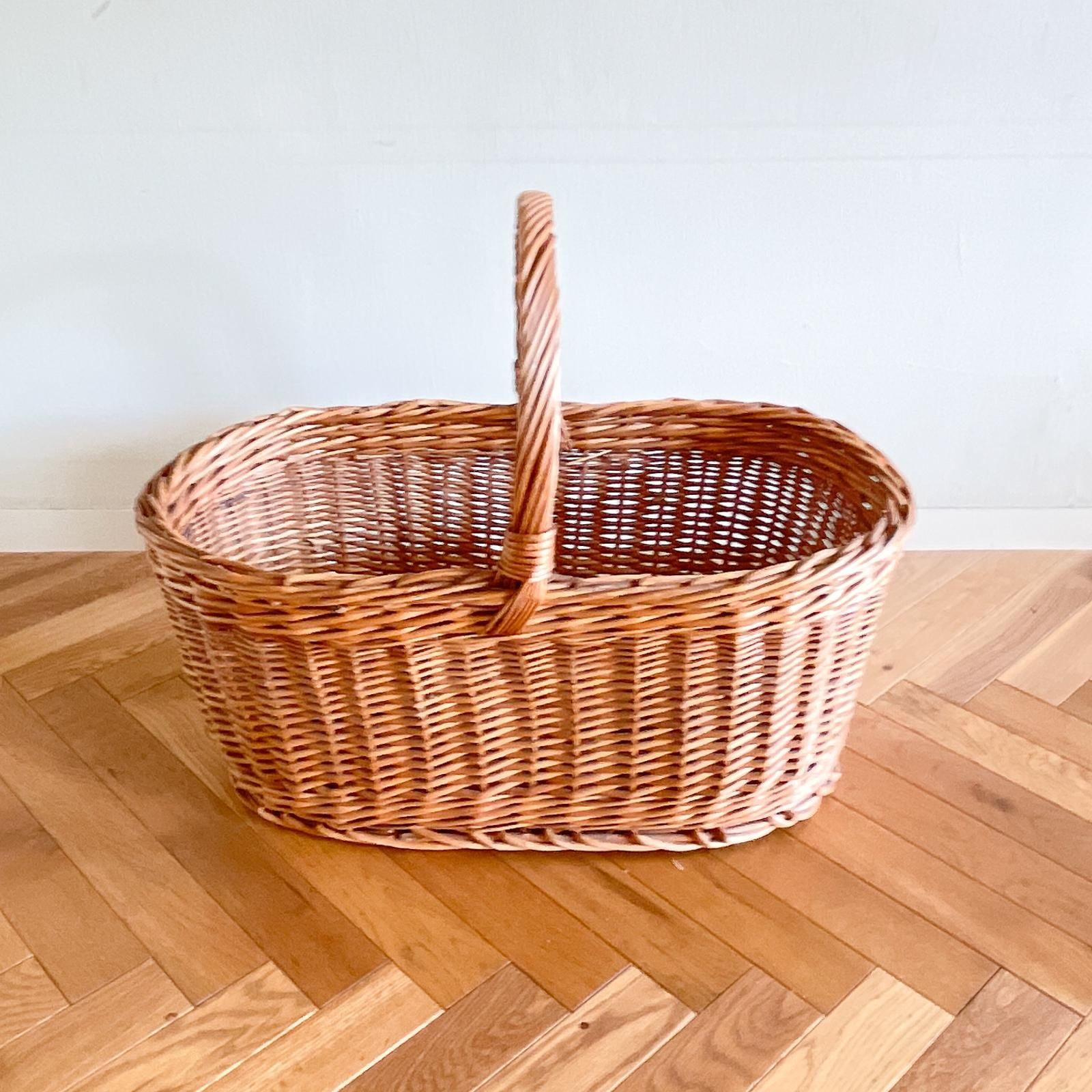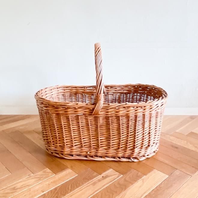 スウェーデン製のヴィンテージバスケットです。横幅が56cmある大型サイズのバスケットには、長さ40cmのクッションカバーがすっぽり入ります。オーバル型のバスケットは収納力抜群で、網目はシンプルに縦横に編まれ、太い素材でしっかり編まれているためとっても頑丈なつくりです。ピクニックやキャンプへ持っていくと、たくさん入れられるので頼り甲斐があります。室内使用ではバスケットに収納しながら部屋に置くと、存在感があって、見せる収納としていいインテリアにもなりますよ。
