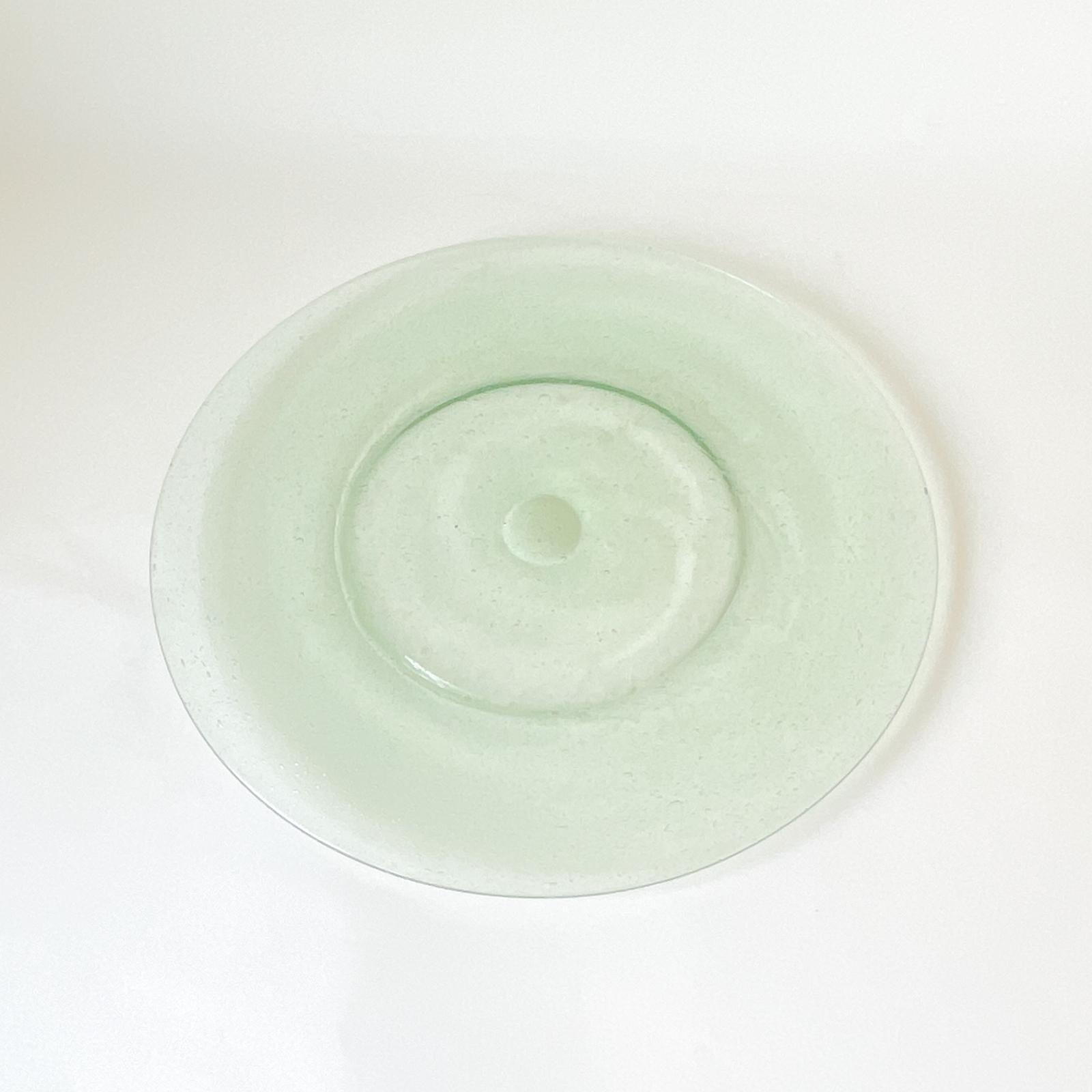 スウェーデン製のガラスの大皿です。ハンドメイドで作られたプレートは、直径が27.5cmあり、薄いグリーンに色付けられ、大小様々な気泡が入った、とても美しい逸品です。フラットなプレートは、チーズやクラッカーなどの前菜にもぴったり。テーブルの中心にサービングプレートとして置くと、グリーンのガラスは見栄えがします。