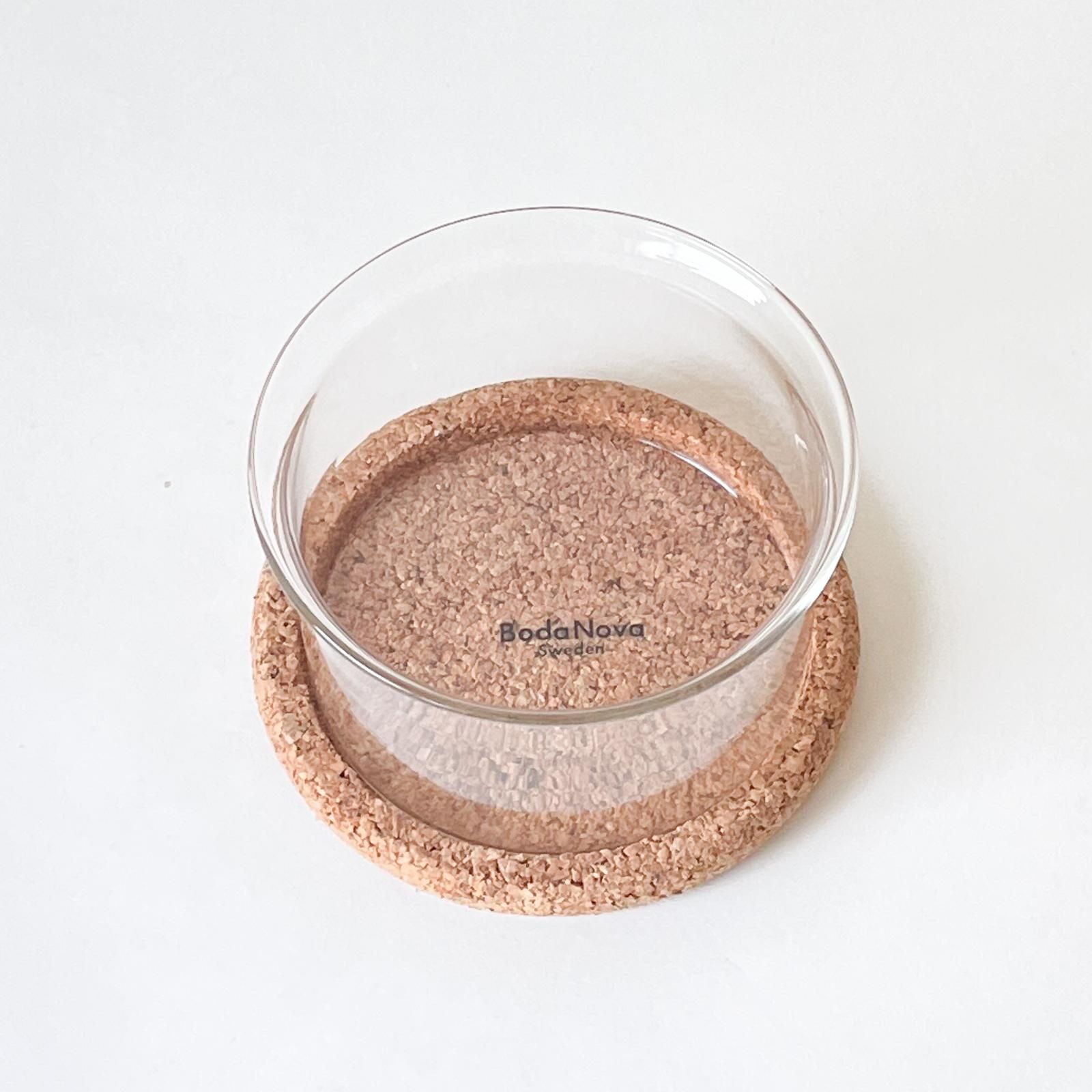 スウェーデンのプロダクトデザイナー、シグネ・ペーション・メリンがデザインし、1971年にBODA NOVA社から発売された耐熱ガラスのボウルとコルクコースターのセットです。円柱形のすっきりした形とコルク素材との組み合わせにオリジナリティーを感じます。グラスの裏面にBODA NOVAのバックスタンプが入っています。