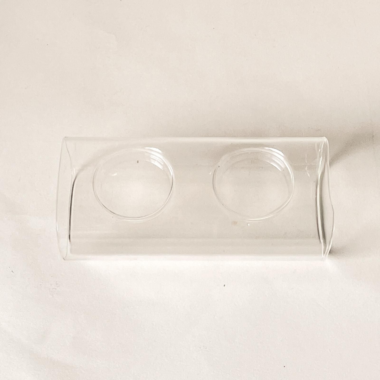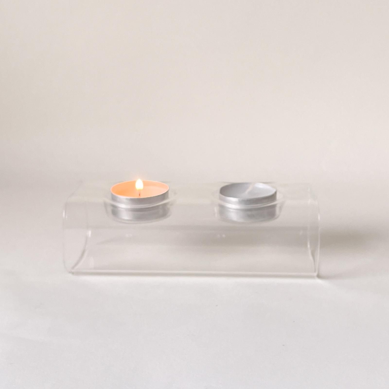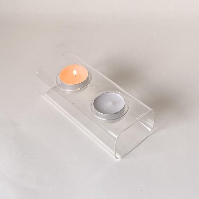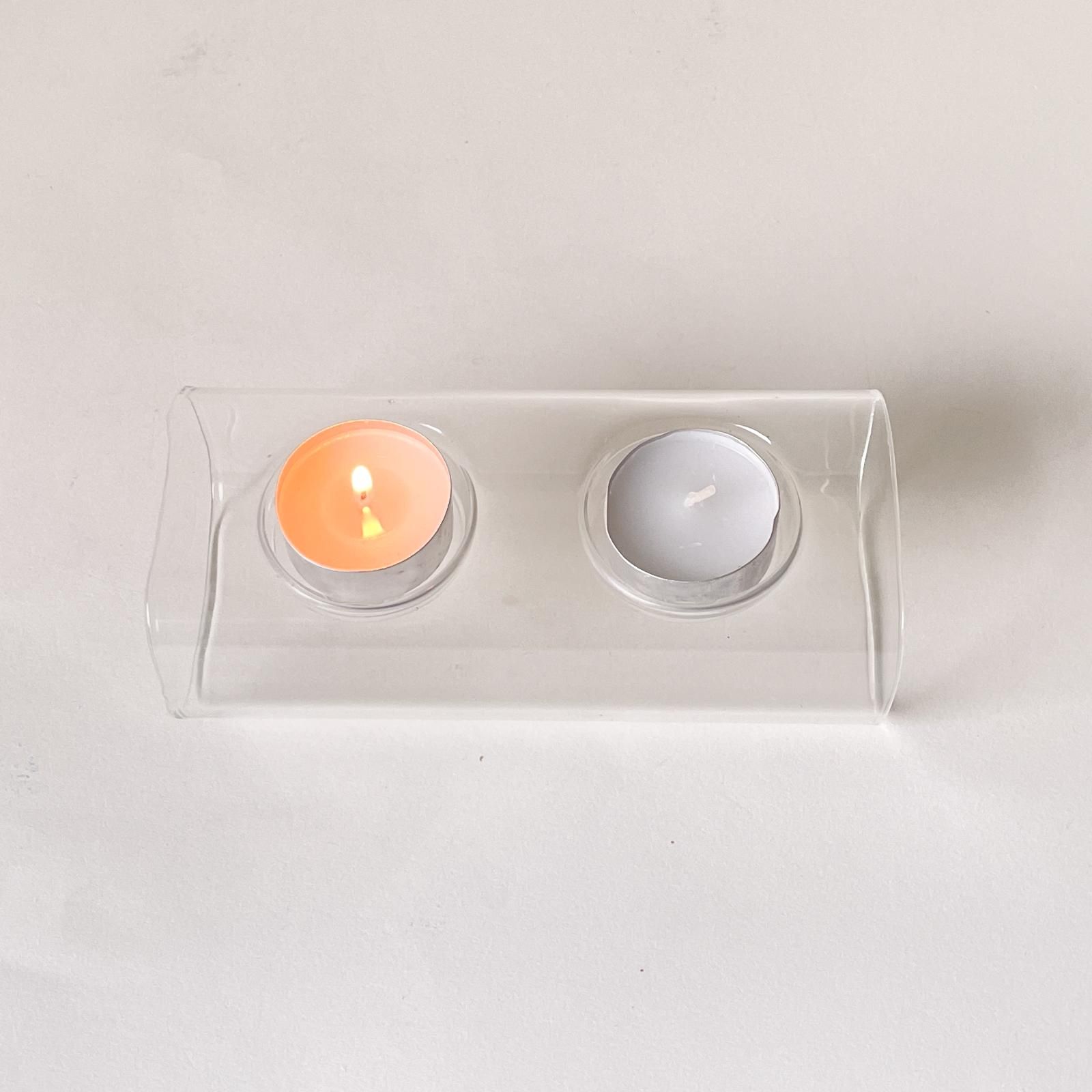 スウェーデン製のガラス製のキャンドルホルダーです。中が空洞になった長方形のガラスに、ティーライトキャンドルが置ける凹みがふたつ作られたホルダーです。キャンドル以外にもピアスやリングの置き場にしてもよさそうです。