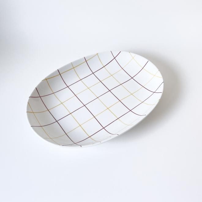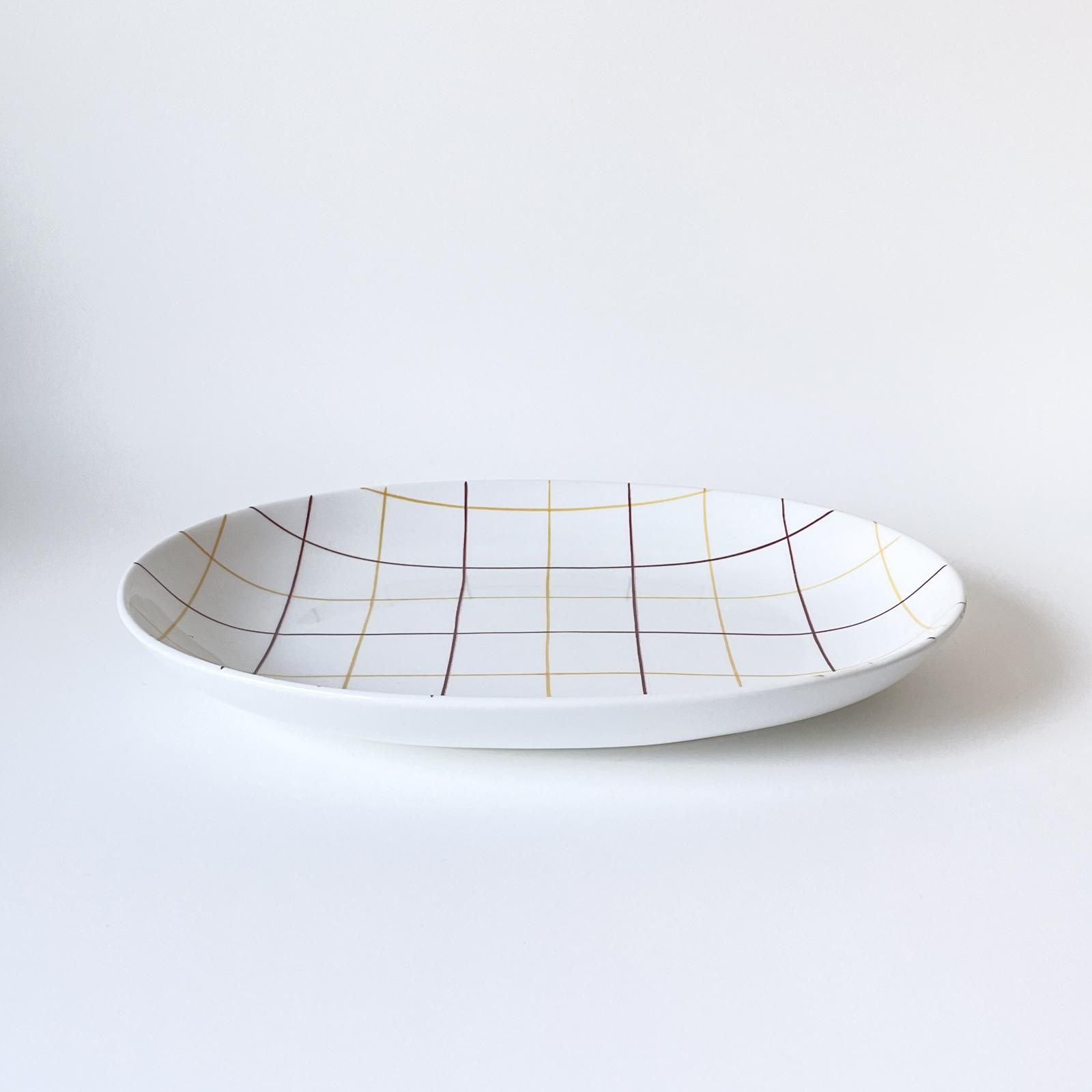 1958年から1966年の間、ARABIAで製作されていたVERKKO|ベルッコシリーズのプレートです。イエローとブラウンのチェック模様の装飾は手描きされたものです。幅27.5cmのオーバルプレートは存在感があります。食器として使うほか、トレーのように大切なものを置く場所として使うのもおすすめです。