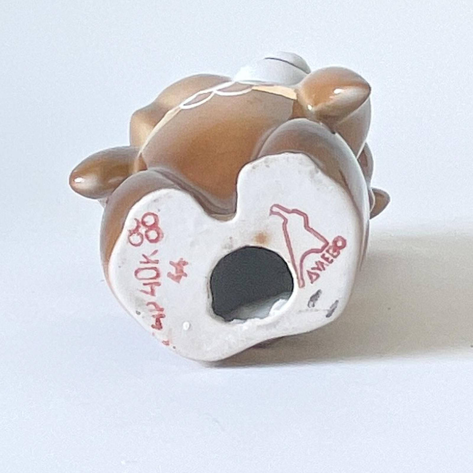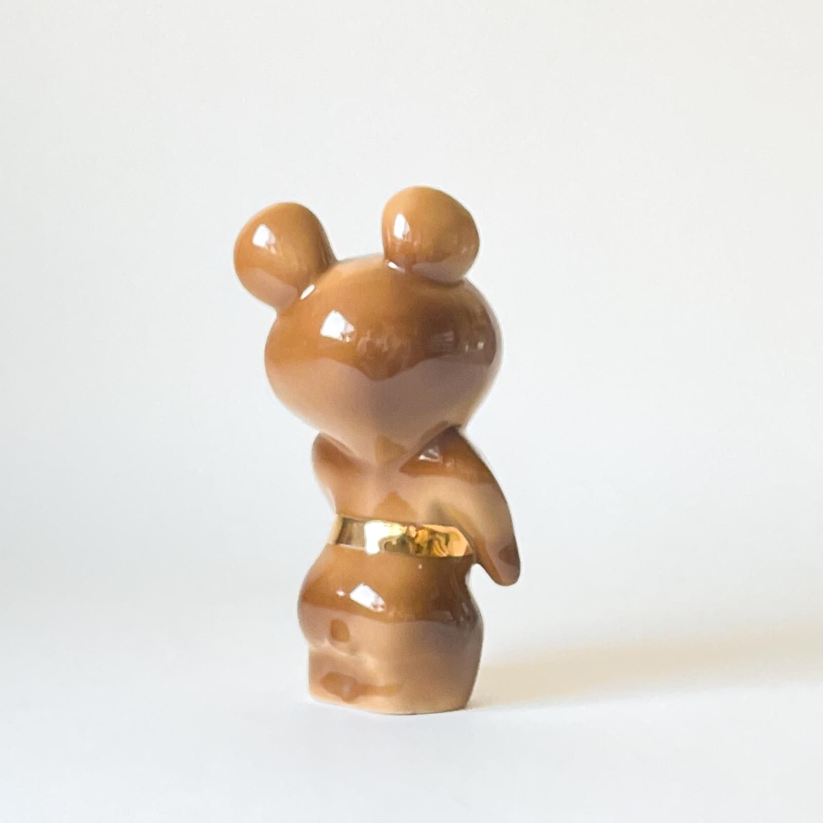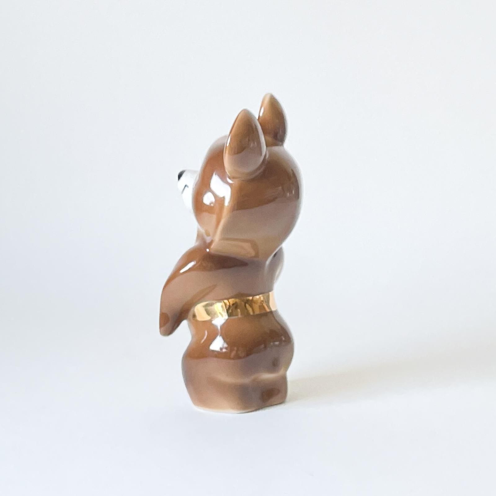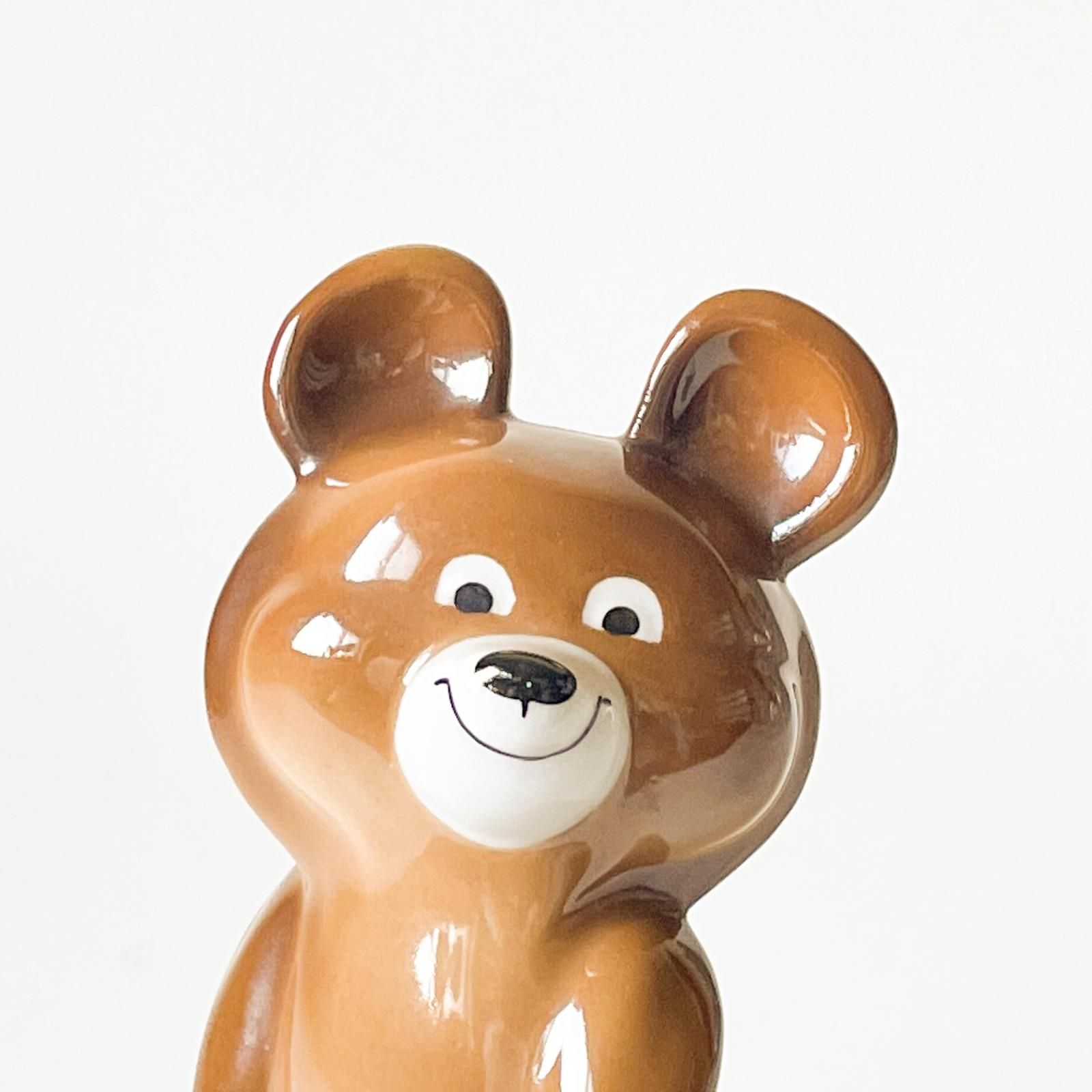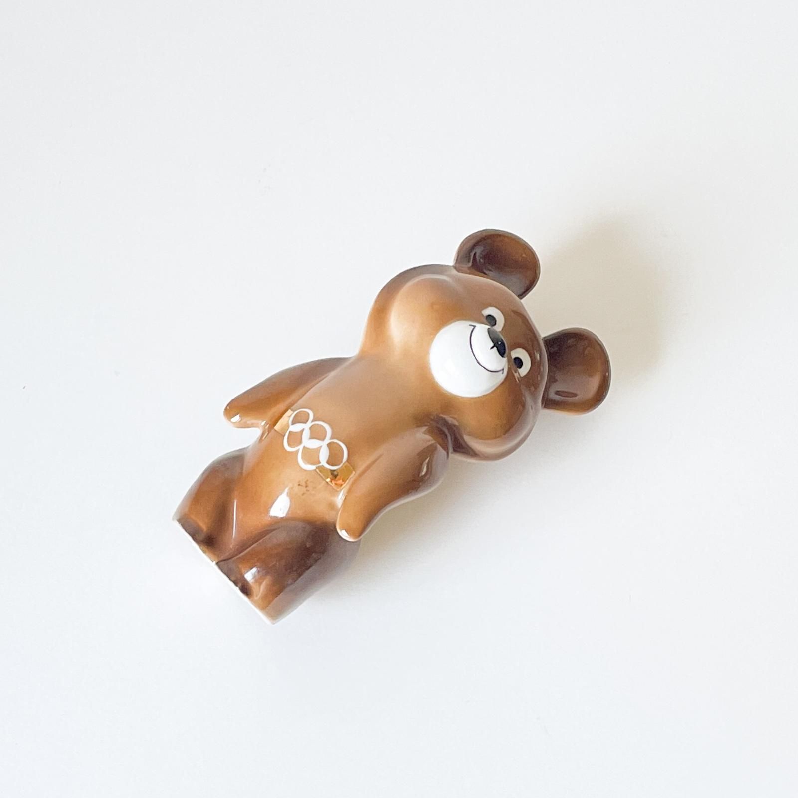 1980年に開催されたモスクワオリンピックのマスコット・ミーシャの陶器製の置物です。1980年当時は、児童書のイラストレーター、ビクター・チジコフ氏の原画を元に、ぬいぐるみや陶器の置物、ピンバッジなど、たくさんのミーシャグッズが生産されました。体をひねったポーズ、少し上目使いに微笑む表情、五輪のベルト、ひとつひとつがなんとも言えないかわいらしさで、見ていると目がハートになってしまいます。ベルトの右下にスレ跡が見られますが、他はカケやヒビなどは見られず良好なコンディションです。
