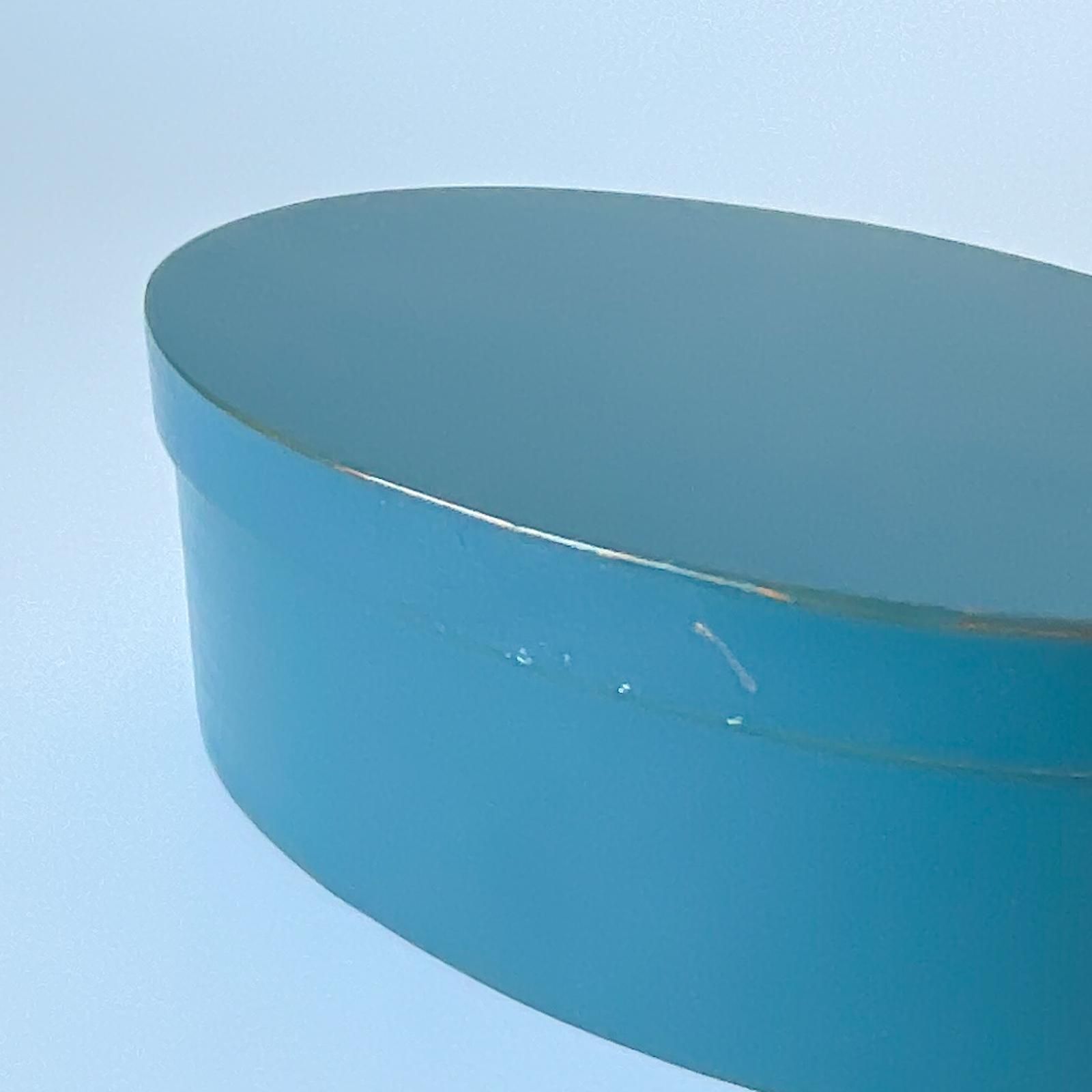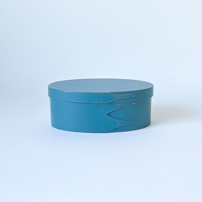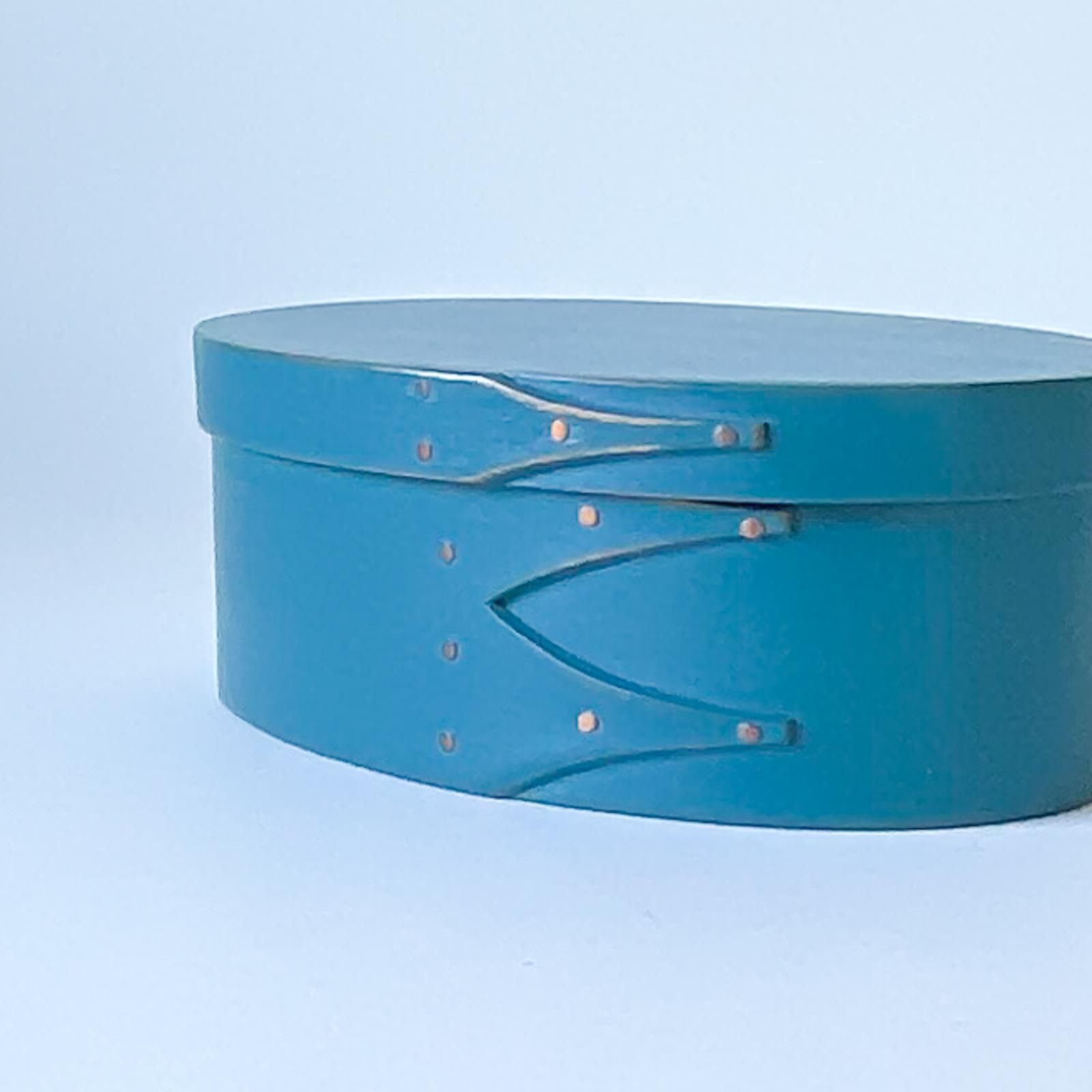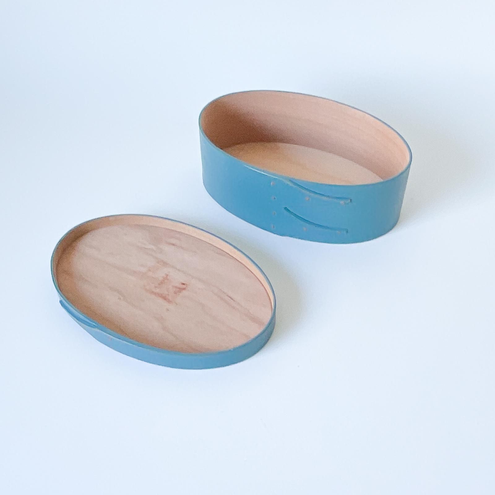 スウェーデン製のシェーカースタイルのオーバルボックスです。曲げ木の手法で木をカーブさせ、ごく小さな金具で留められた手工芸品です。北欧らしいきれいなブルーの色合いと、留め具の銅色がシックな組み合わせです。裏面にはORLEANS CARPENTERSと刻印されています。