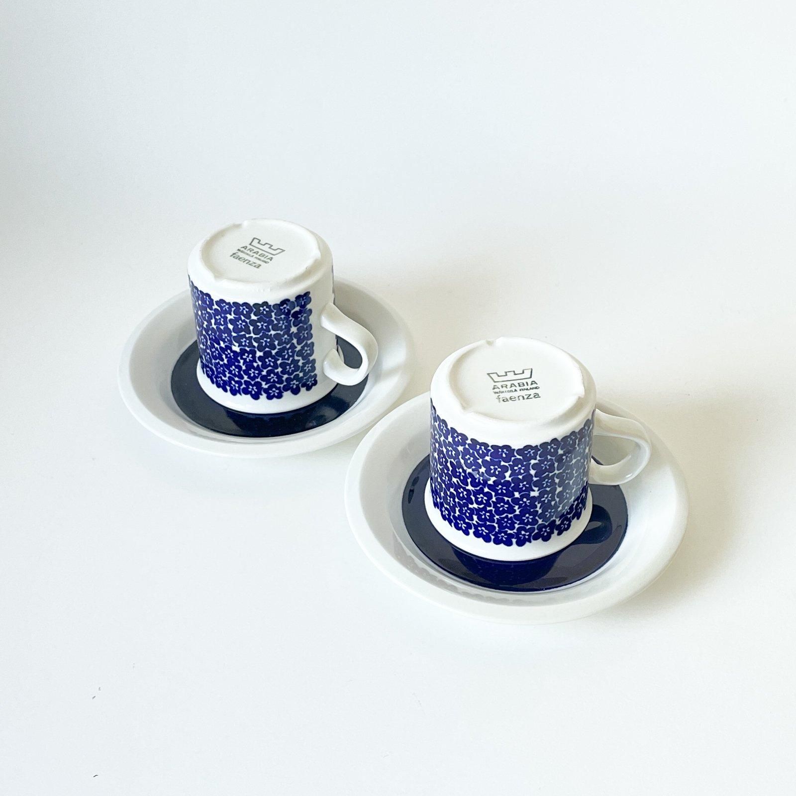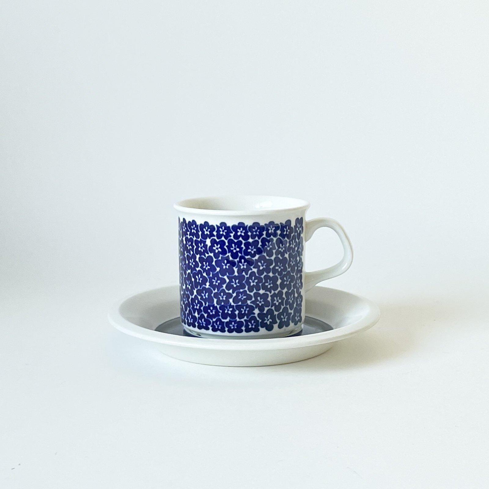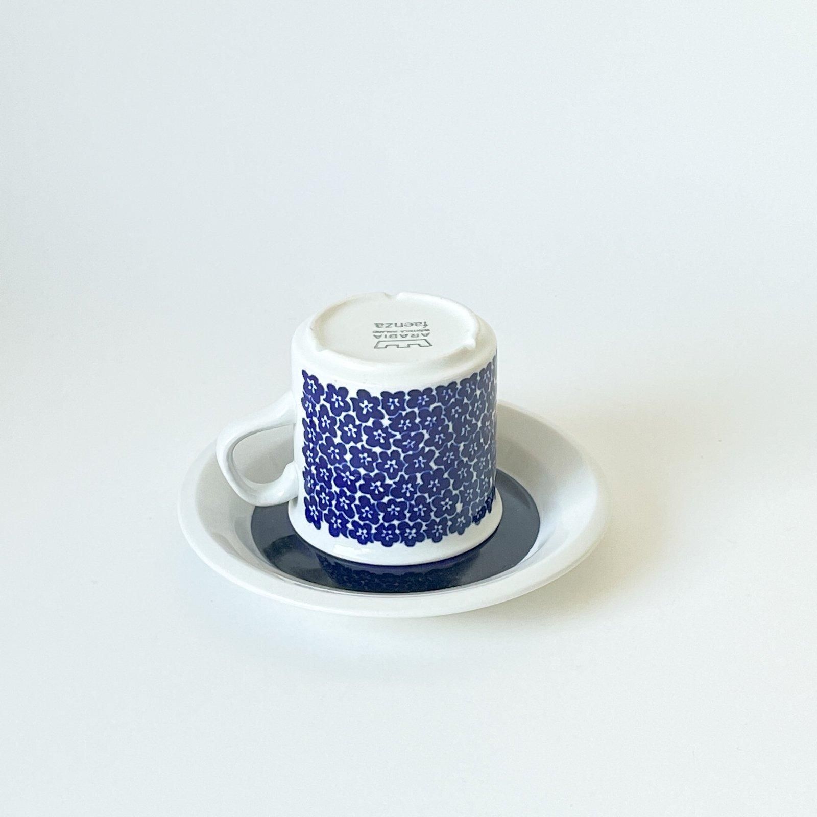 ARABIA社製のFAENZA | ファエンツァシリーズのエスプレッソカップ&ソーサーです。鮮やかなブルーの小花がぎゅっと重なり合った模様は、このシリーズの中でも人気の絵柄です。この図柄をデザインしたのは、INKERI SEPPARA | インケリ・セッパラ で、製造されていたのは1973年-1979年の6年間という短い期間でした。コーヒーやティーカップは時々見つけますが、エスプレッソカップはなかなか見つからないレアアイテムです。