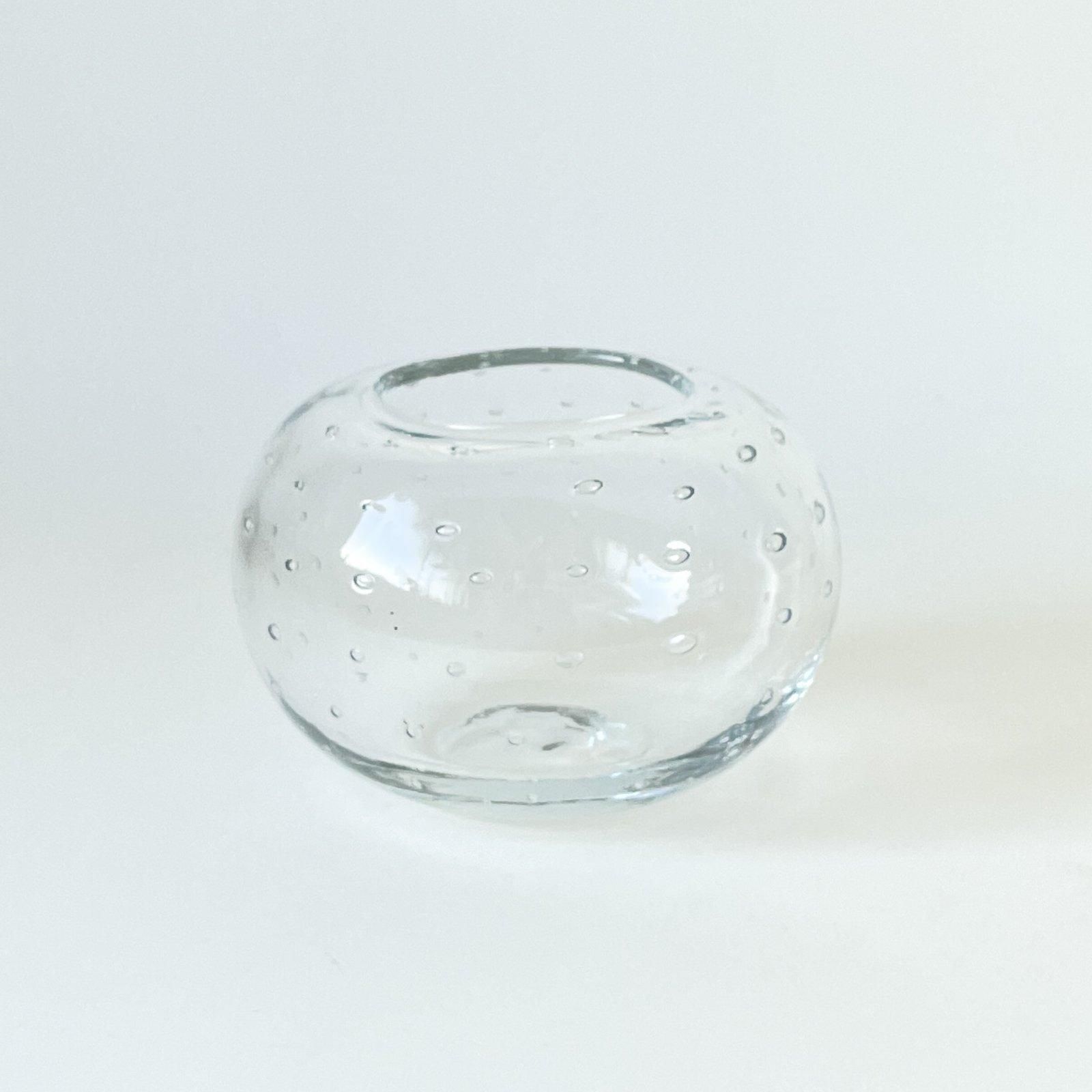 スウェーデンで見つけたグラス製のフラワーベースです。ハンドメイドで作られたベースは、気泡を散りばめながら球体に仕上げた魅力的な作品です。小ぶりな花瓶として使う他、そのまま置いておくだけで雰囲気があります。
