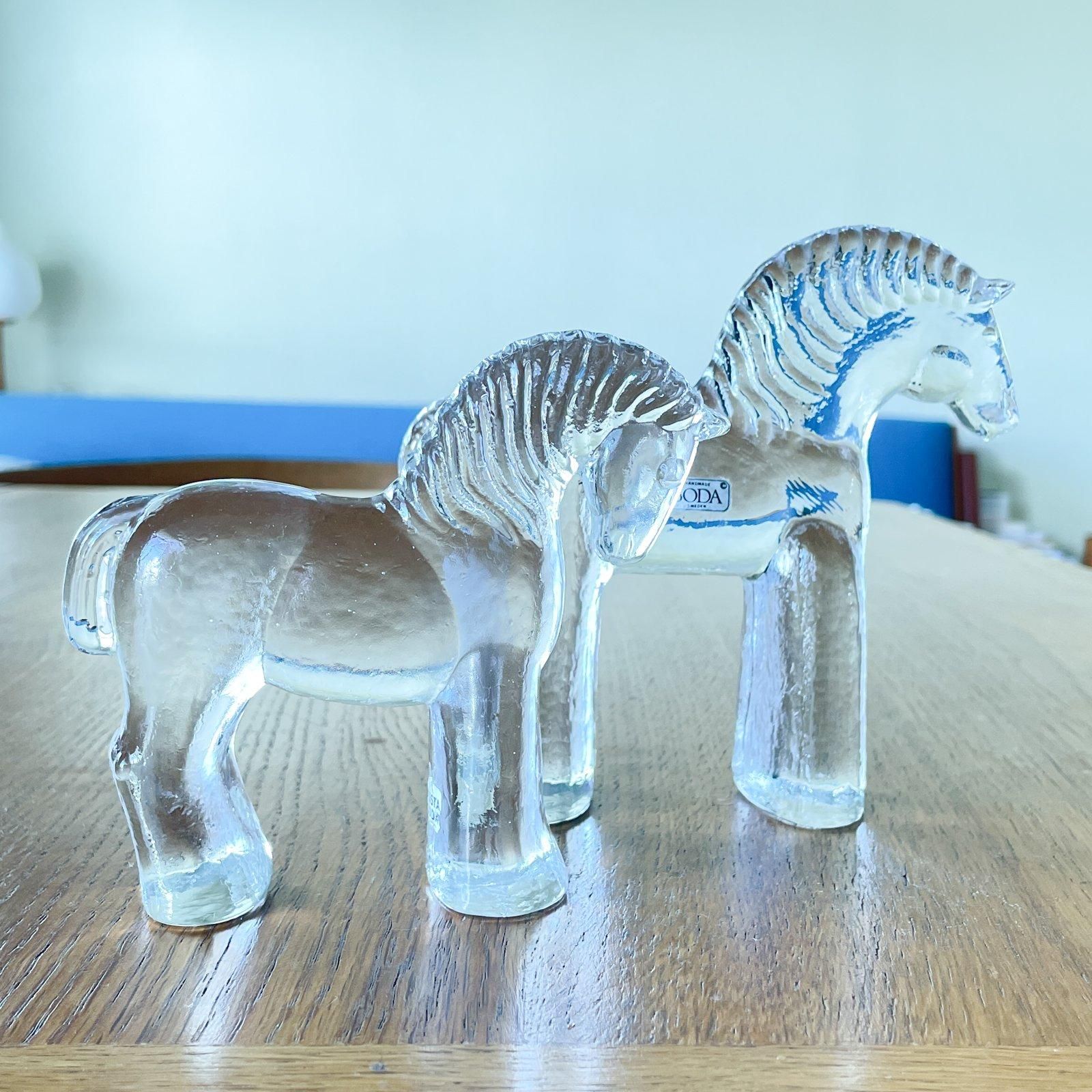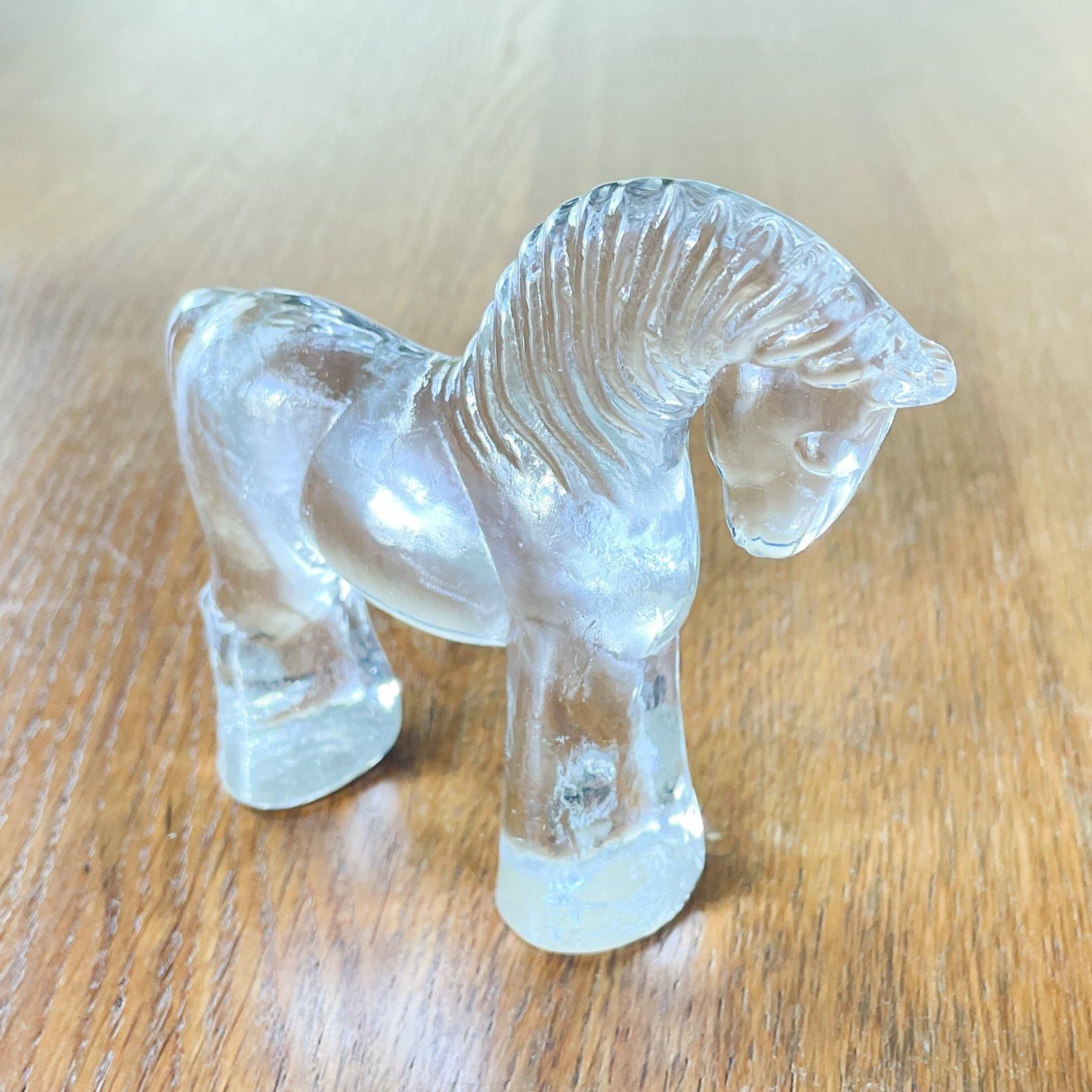スウェーデンの老舗ガラスメーカー・KOSTA BODA社で、1970年代に手作りされていた、クリスタルガラスの馬です。デザイナーはBertil Vallien | バーティル・ヴァリエンです。ふさふさの立髪やしっぽ、うつむいた顔につぶらな瞳。馬のやさしい表情をこまかく表現しています。ハンドメイドガラスのゆらぎもまたこの作品の魅力を引き立てています。裏面はフラットなのでペーパーウェイトとしても使えます。