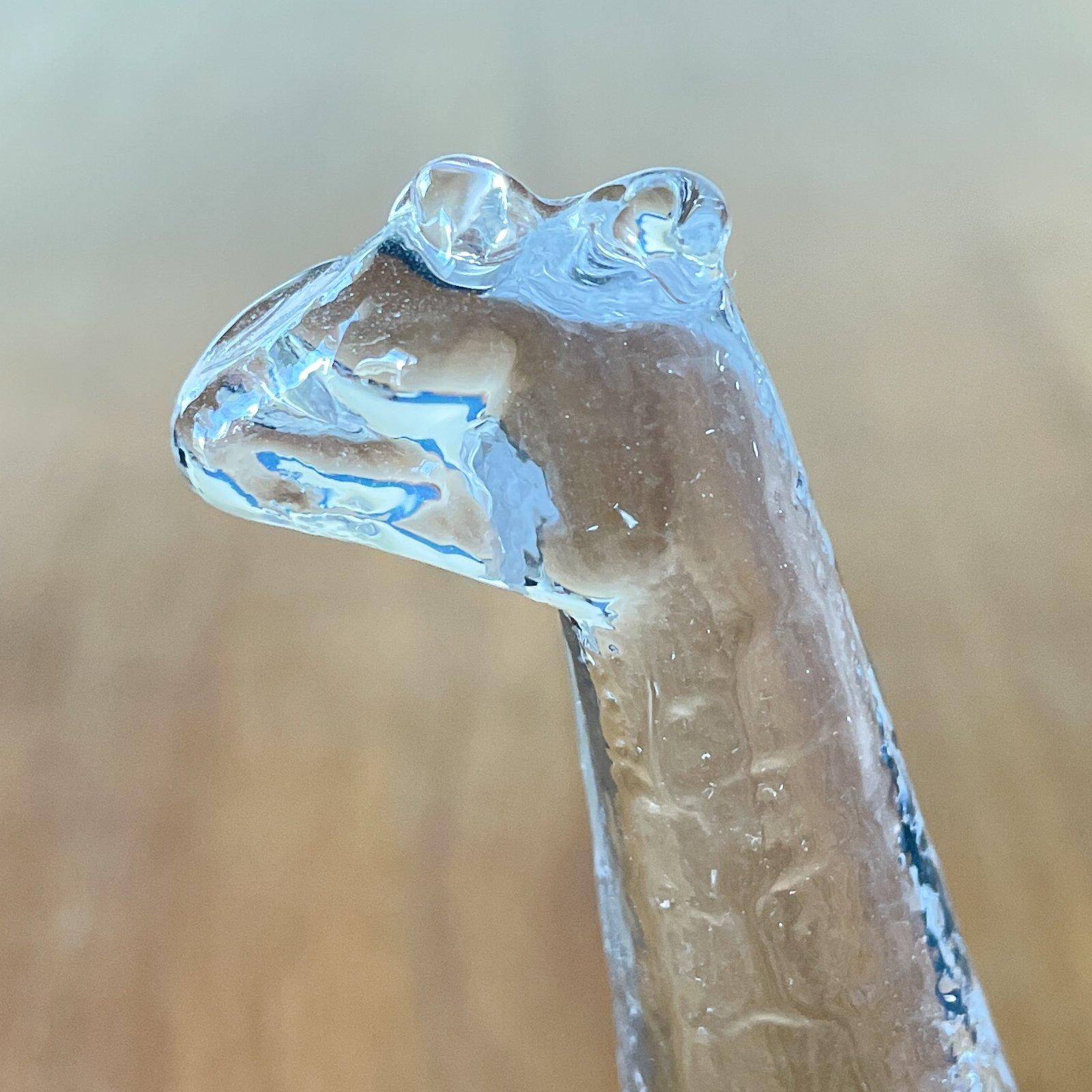 スウェーデンの老舗ガラスメーカー・KOSTA BODA社で、1970年代に手作りされていた、クリスタルガラスのキリンです。デザイナーはBertil Vallien | バーティル・ヴァリエンです。キリンの肌模様、丸い耳やしっぽが、やさしく表現されています。ハンドメイドガラスのゆらぎもまたこの作品の魅力を引き立てています。裏面はフラットなのでペーパーウェイトとしても使えます。