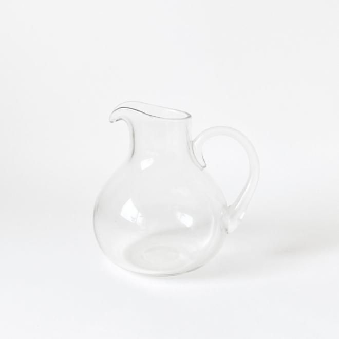 スウェーデンで見つけたグラスジャグです。球体で安定感のある本体に、ハンドメイドでつくられたハンドルと注ぎ口の両方が、このジャグのチャームポイントになっています。お花を生けてフラワーベースとして使うのもおすすめです。
