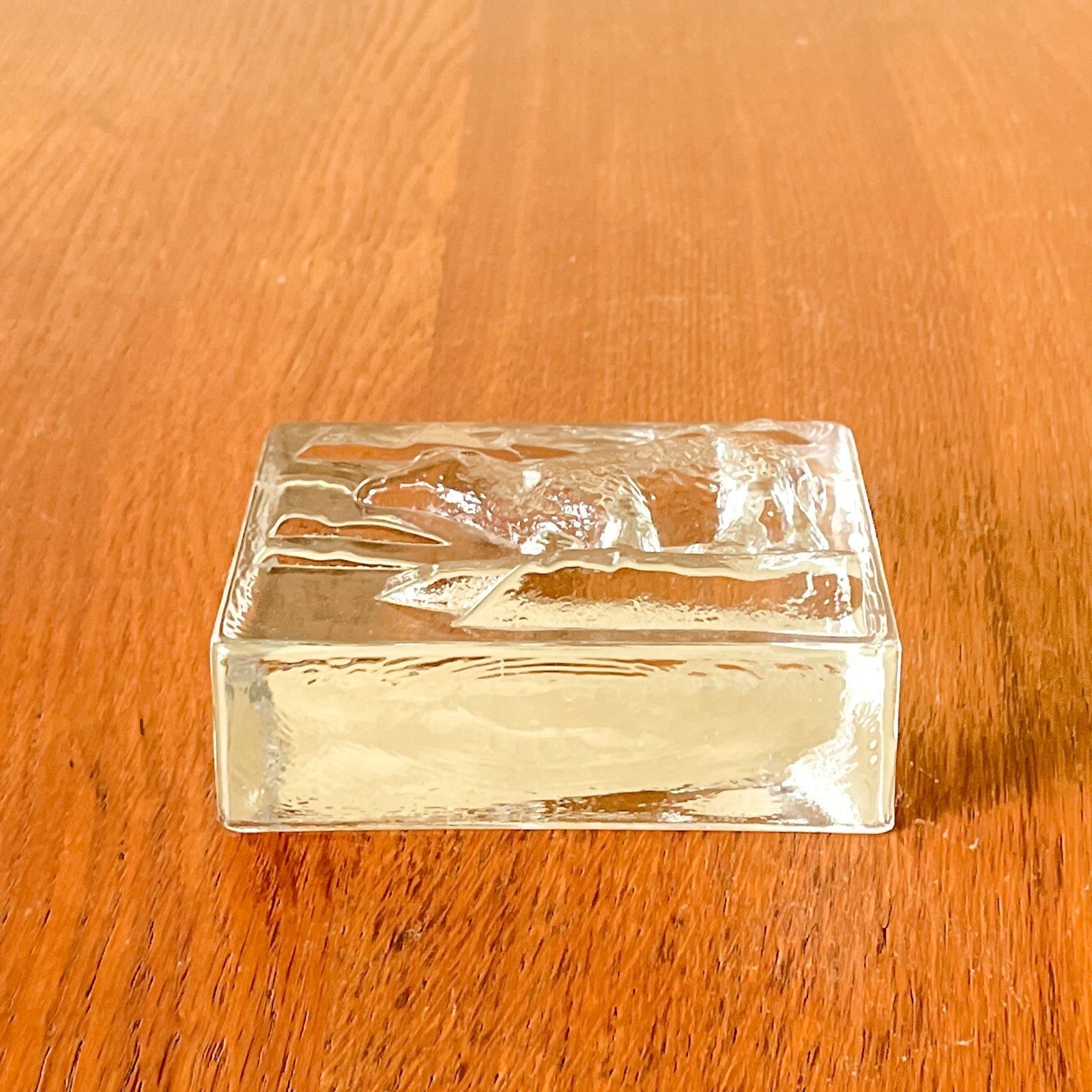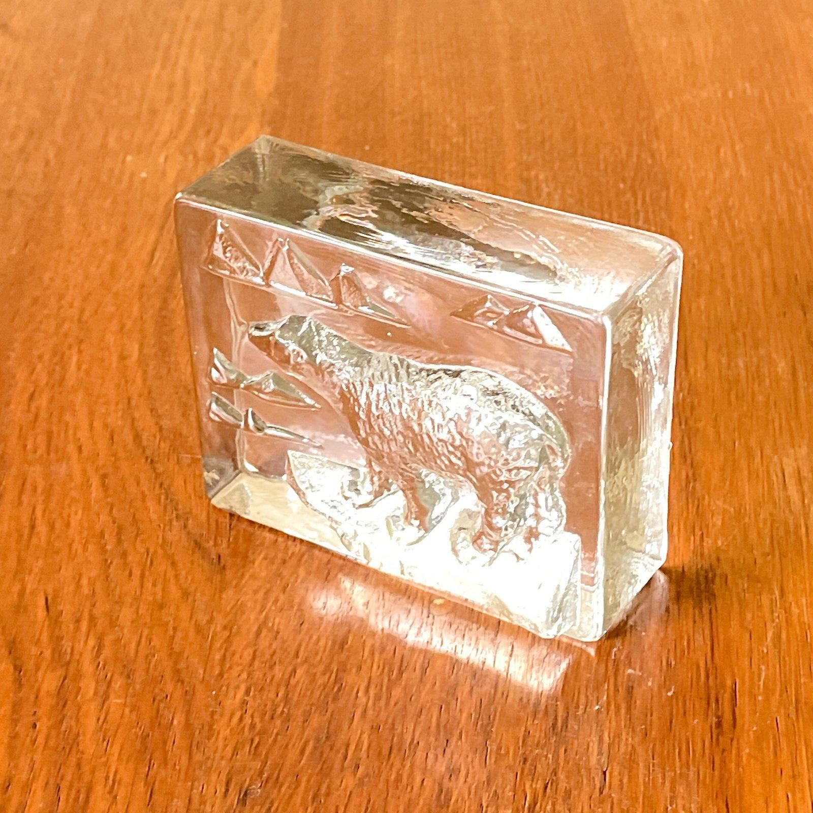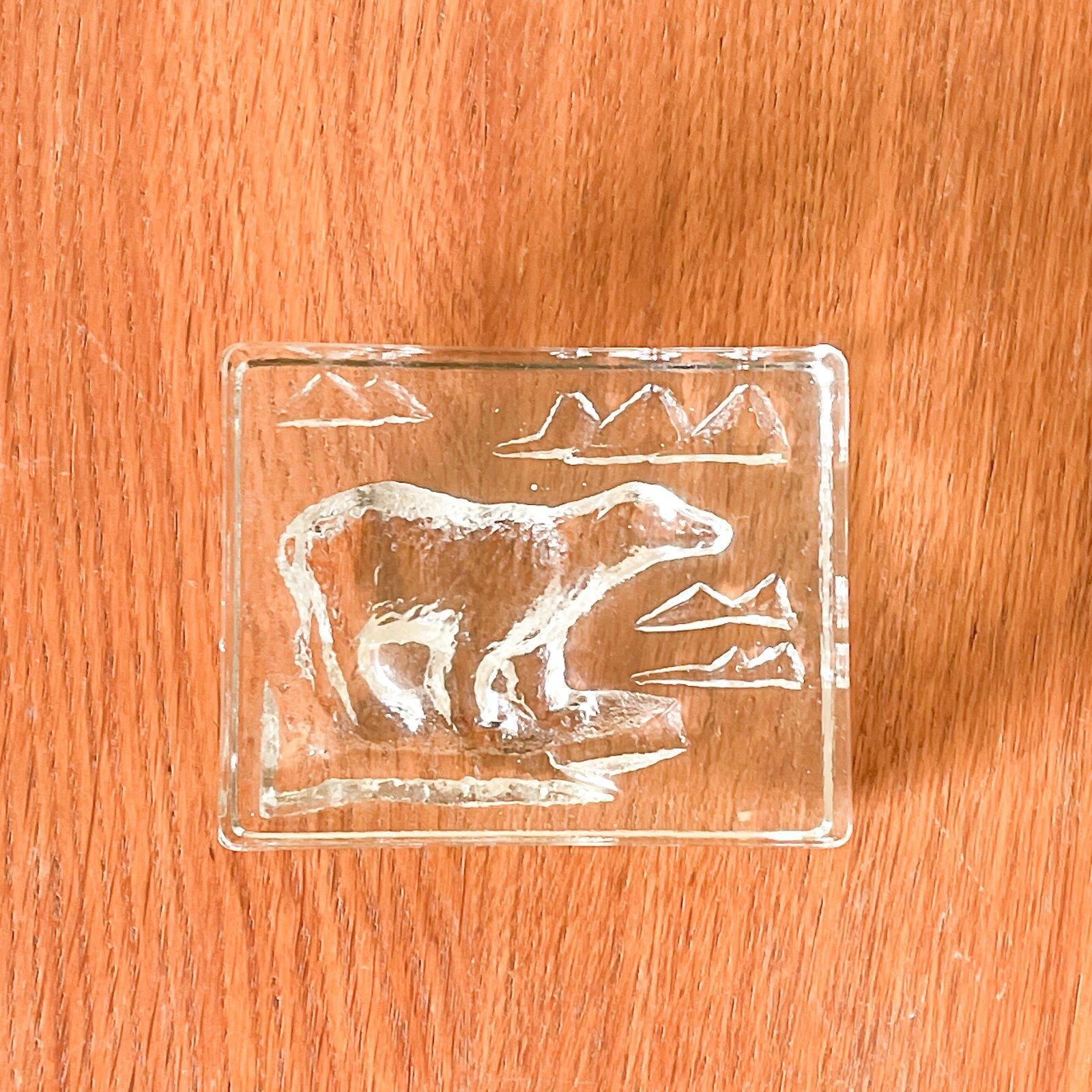 フィンランド製のガラスのデコレーションです。北極で氷上に佇むホッキョクグマをモチーフにしたデザインです。厚みにある長方形のガラスは、氷のかたまりのようにも見え、ハンドメイドガラスのゆらぎもまたこの作品の魅力を引き立てています。しっかりと厚みがあり、裏面はフラットなのでペーパーウェイトとしても使えます。