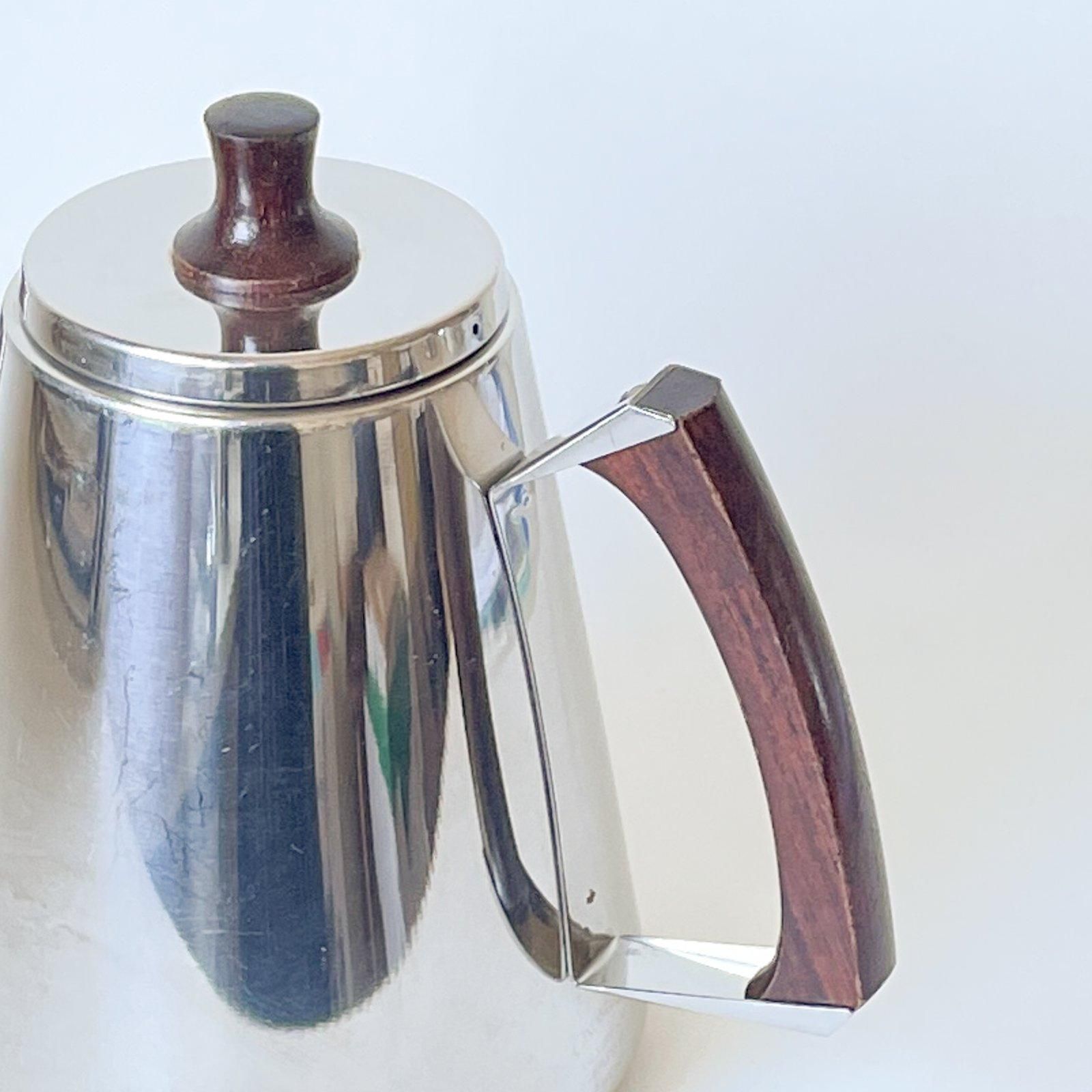 スウェーデン・NILS JOHAN|ニルスヨハン社製、クリスティーナシリーズのコーヒーポットです。円すい型の本体に、ハンドルとフタの持ち手には、こげ茶色のローズウッドが使われ、ステンレスとダークブラウンの木の組み合わせに、北欧らしさが感じられます。