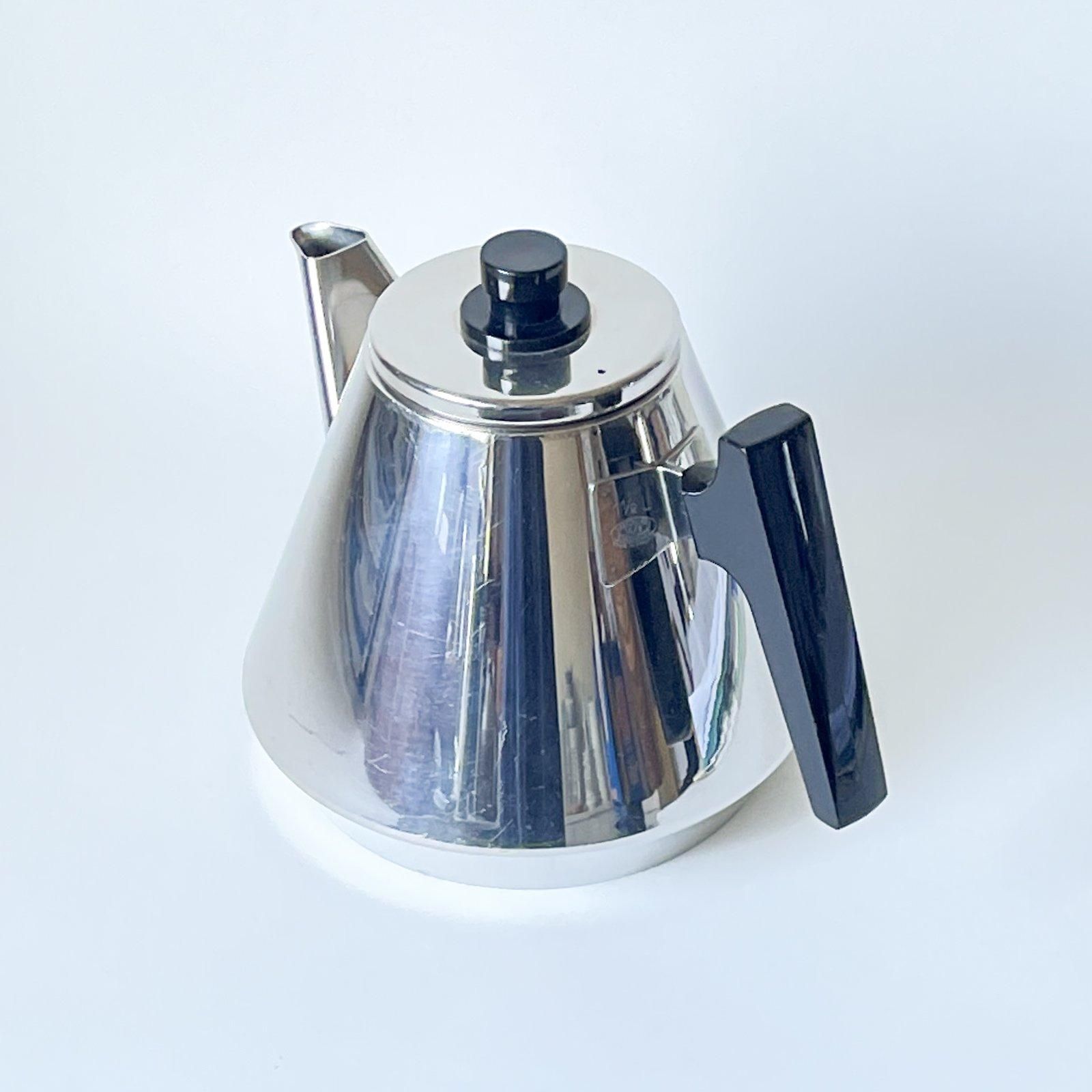 フィンランド・HACKMAN|ハックマン社のコーヒーポットです。容量は1.5リットルです。安定感のある円すい型の本体と、水平に付けられた真っ直ぐなハンドルとフタの持ち手には、ブラックの樹脂が合わせられ、デザイン性の高さに魅力を感じます。