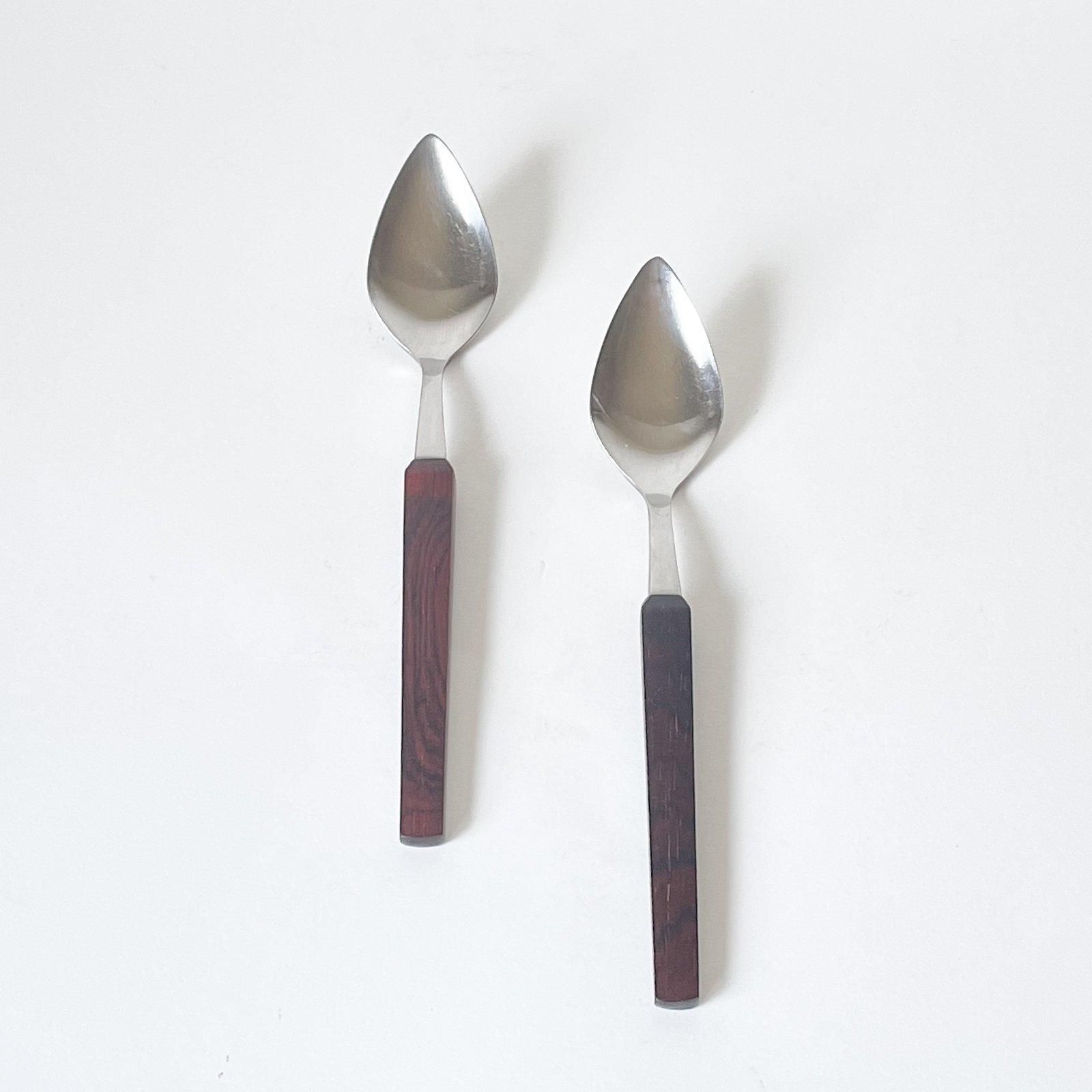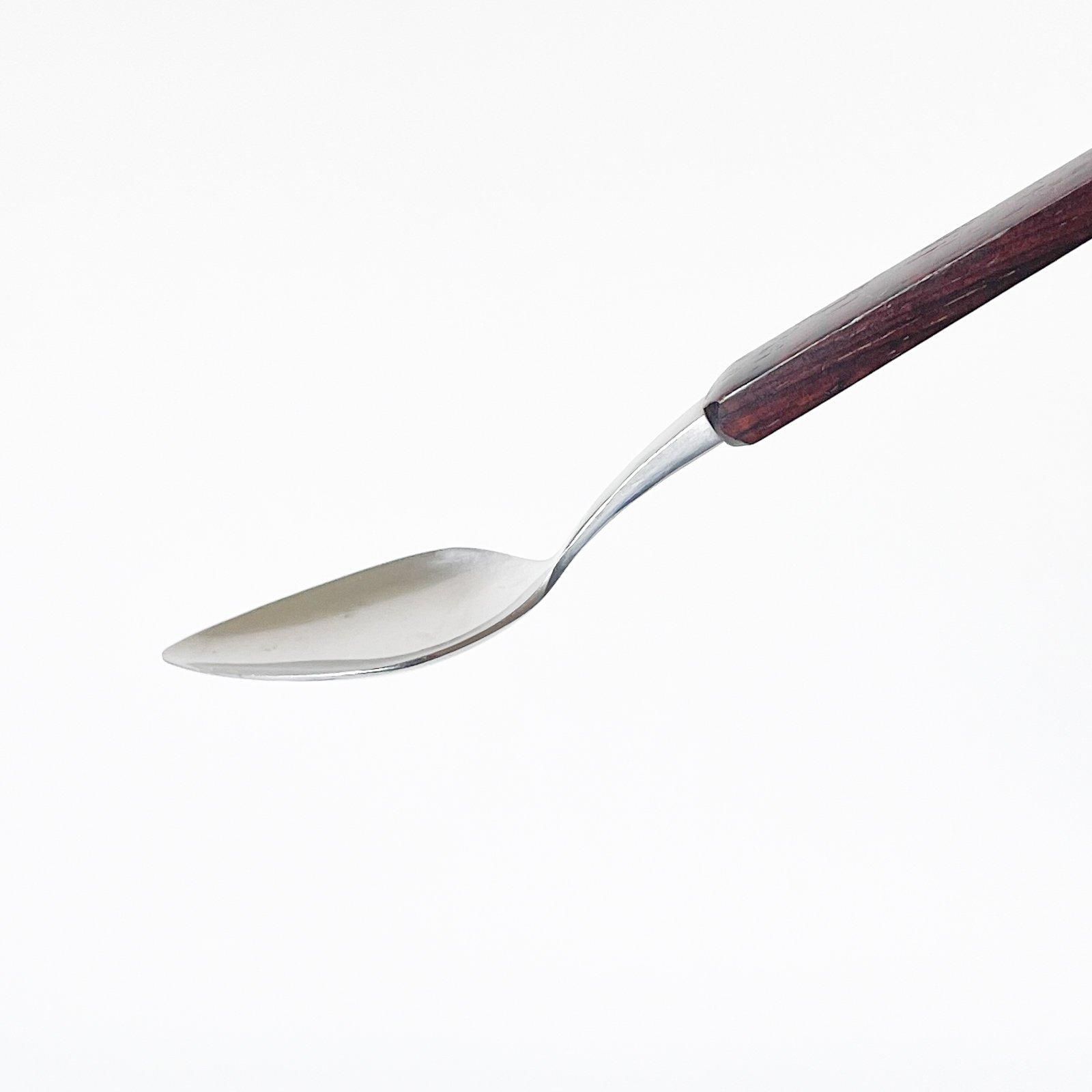 スウェーデンの NILS JOHAN | ニルス ヨハン社で1970年代に作られていたスプーンです。先が三角をした珍しいシェイブです。ブラウンのチークのハンドルが魅力的で、テーブルコーディネイトのいいアクセントになります。