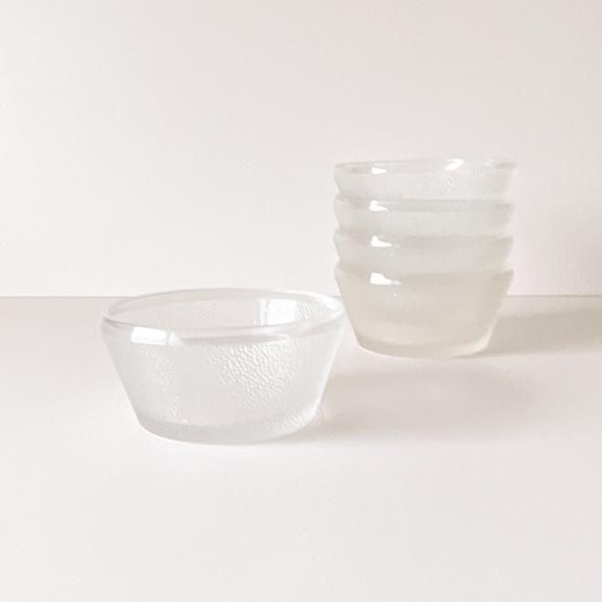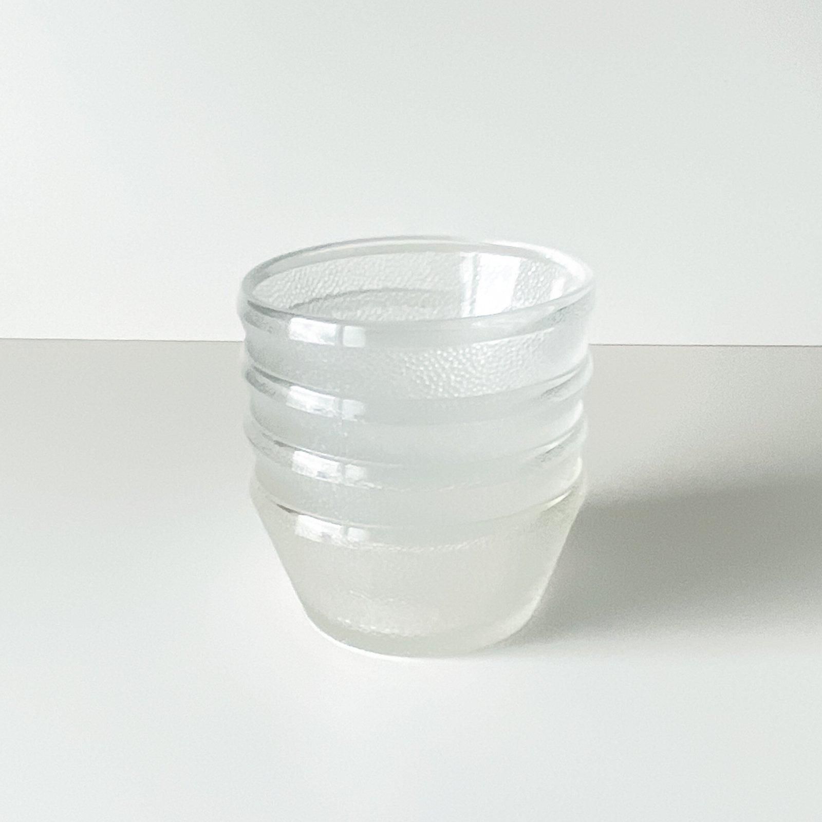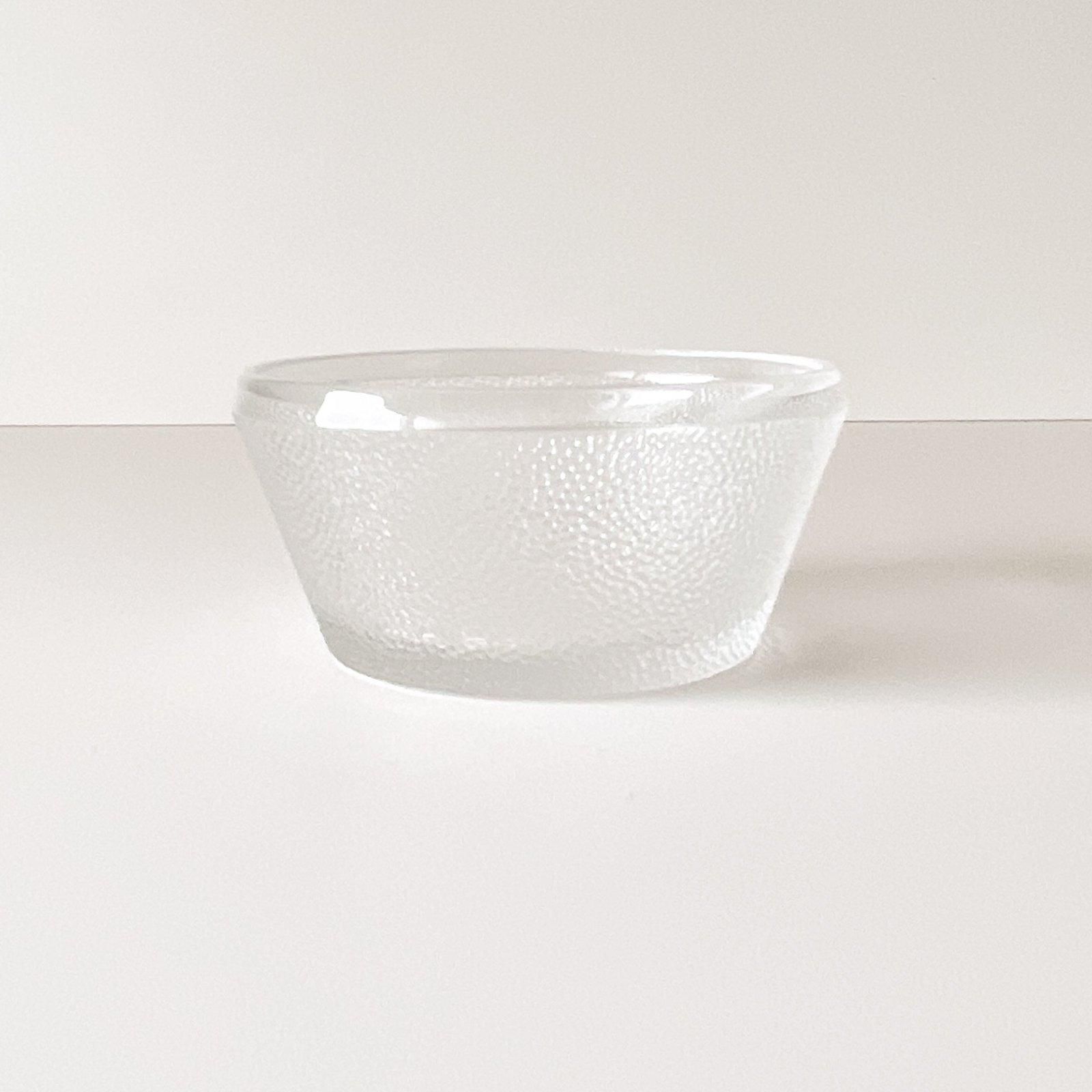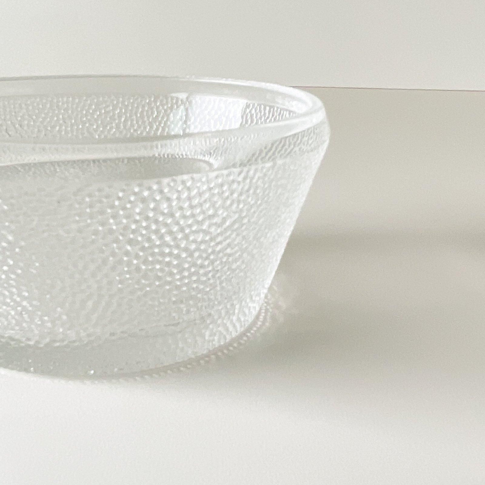 フィンランドのNuutajarvi | ヌータヤルヴィ社でOiva Tokka | オイバ・トイッカがデザインしたサアナシリーズのグラスボウルです。北極圏にある山の名前がつけられたボウルの外側は細かな凹凸模様で、北極の凍った雪の表面を思わせます。内側はつるっとしているので、お手入れしやすいです。ヨーグルトやフルーツのボウルにぴったりです。