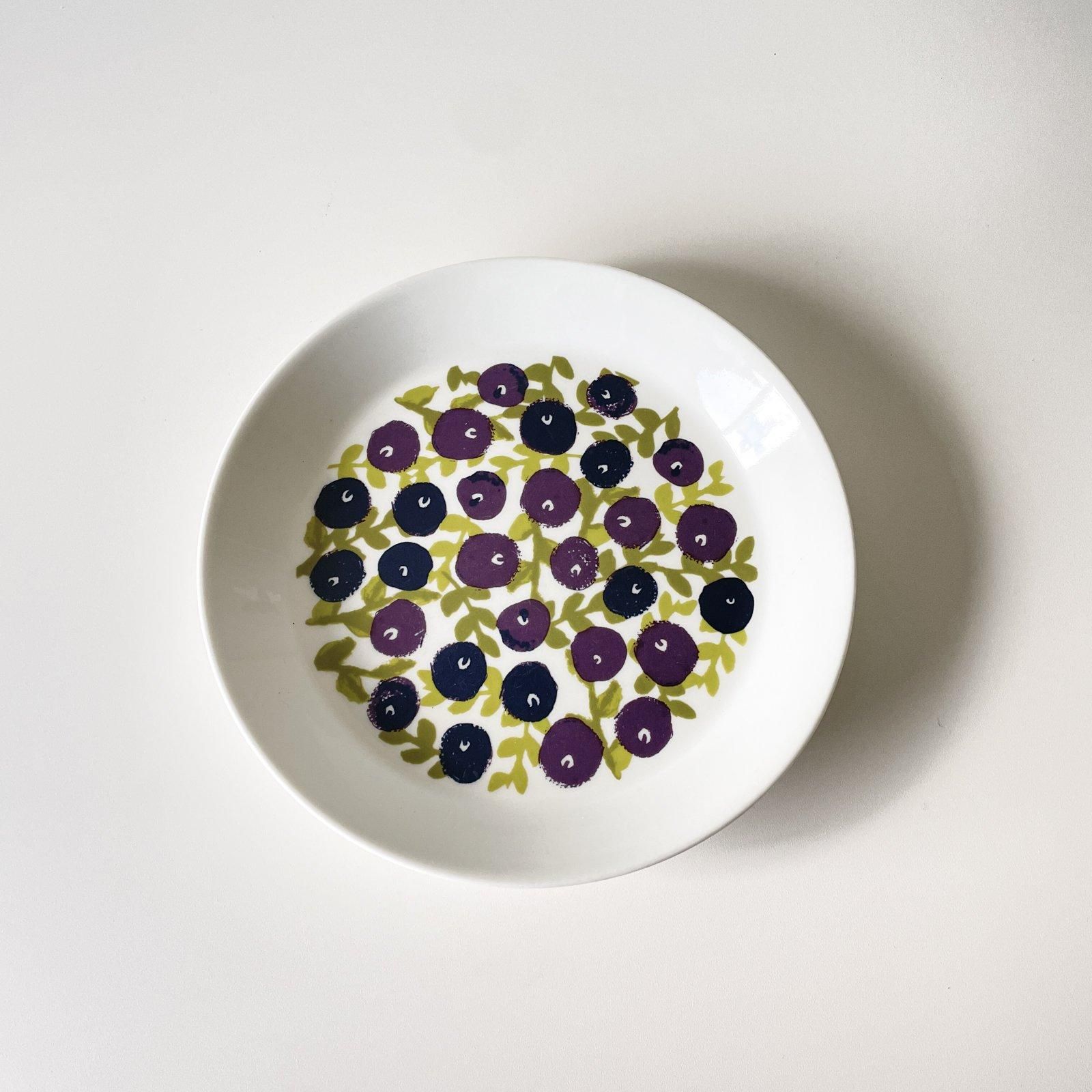 ARABIAで2010年の夏季限定アイテムとして発売された、ブルーベリーシリーズのプレートです。プレートはTEEMAの型を採用し、表面にブルーベリーをまるで手描きのように、若草色の葉と、紫色の濃淡で表現された実が魅力的です。フィンランドでは夏になると、森の至るところでブルーベリーが身をつけ始め、熟したブルーベリー摘みをたのしみます。ブルーベリーはフィンランドの人々にとって、とても身近な存在なのです。