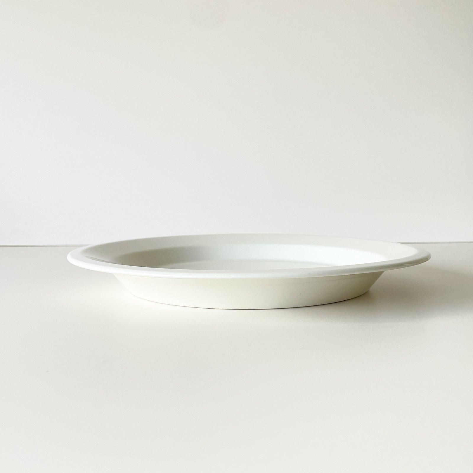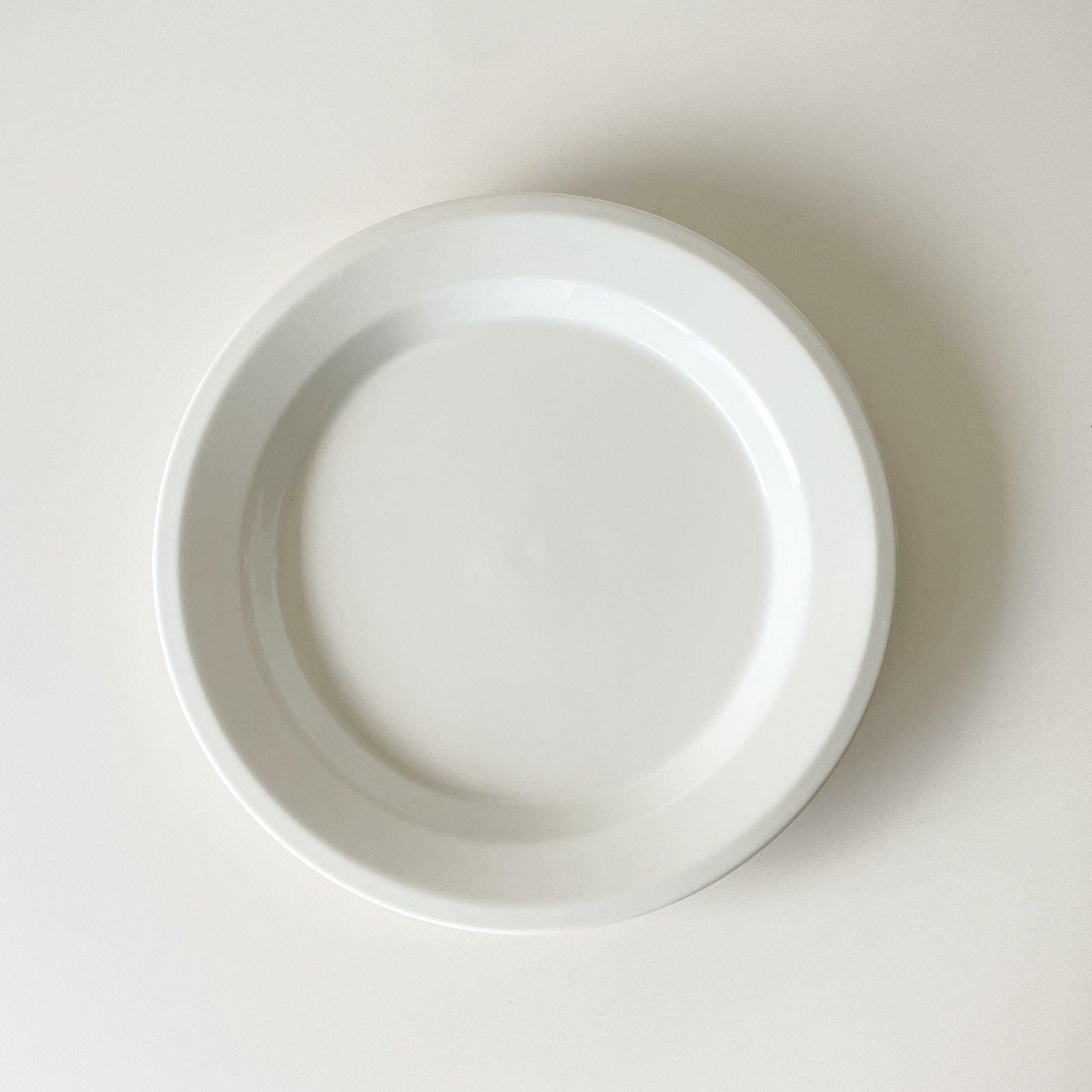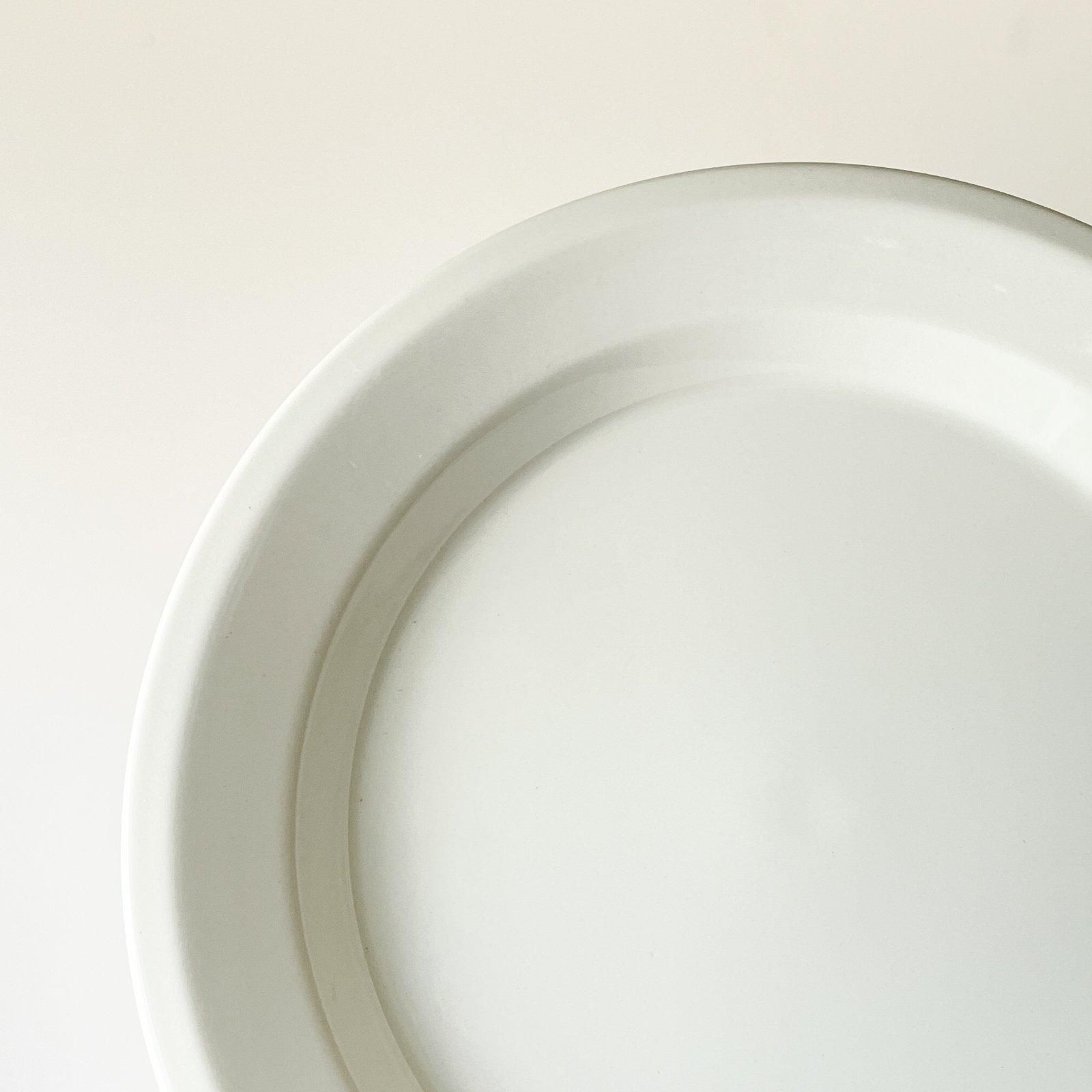 ARABIA社製の FAENZA | ファエンツァシリーズの直径24.5cmのプレートです。ファエンツァシリーズは、フチにブラックやイエロー、グリーンのラインが入ったものをよく見かけますが、シンプルなアイボリー一色のプレートを見つけました。ファエンツァのエッジを立たせたフォルムは、無地でも存在感のあるデザインです。