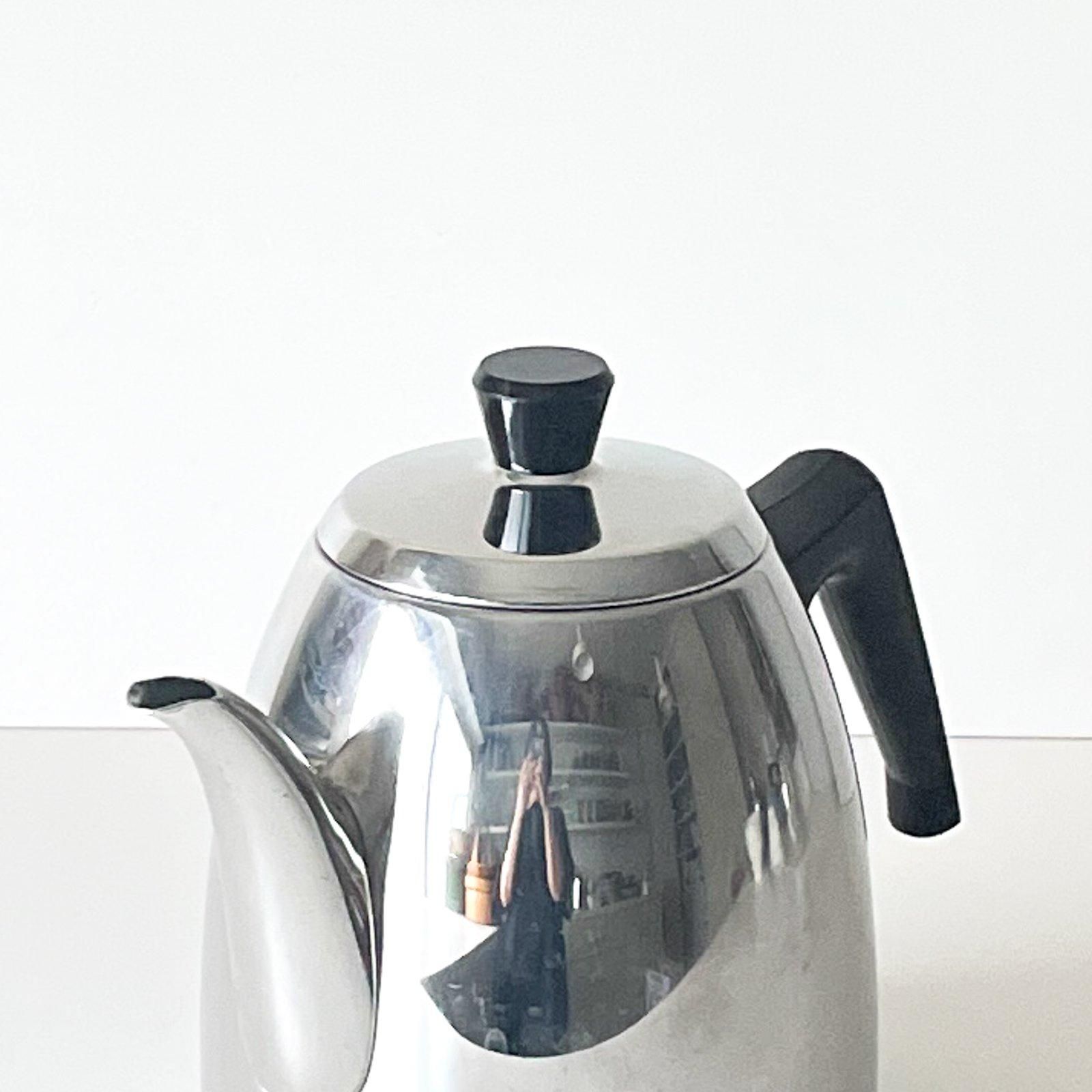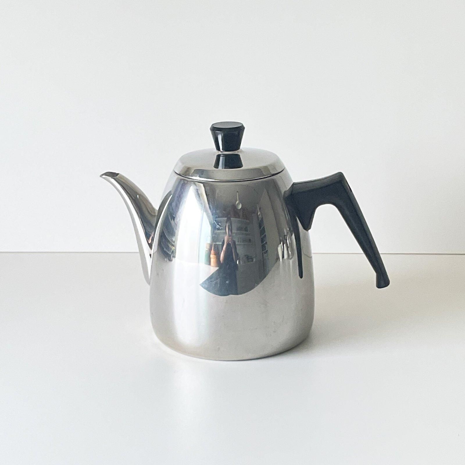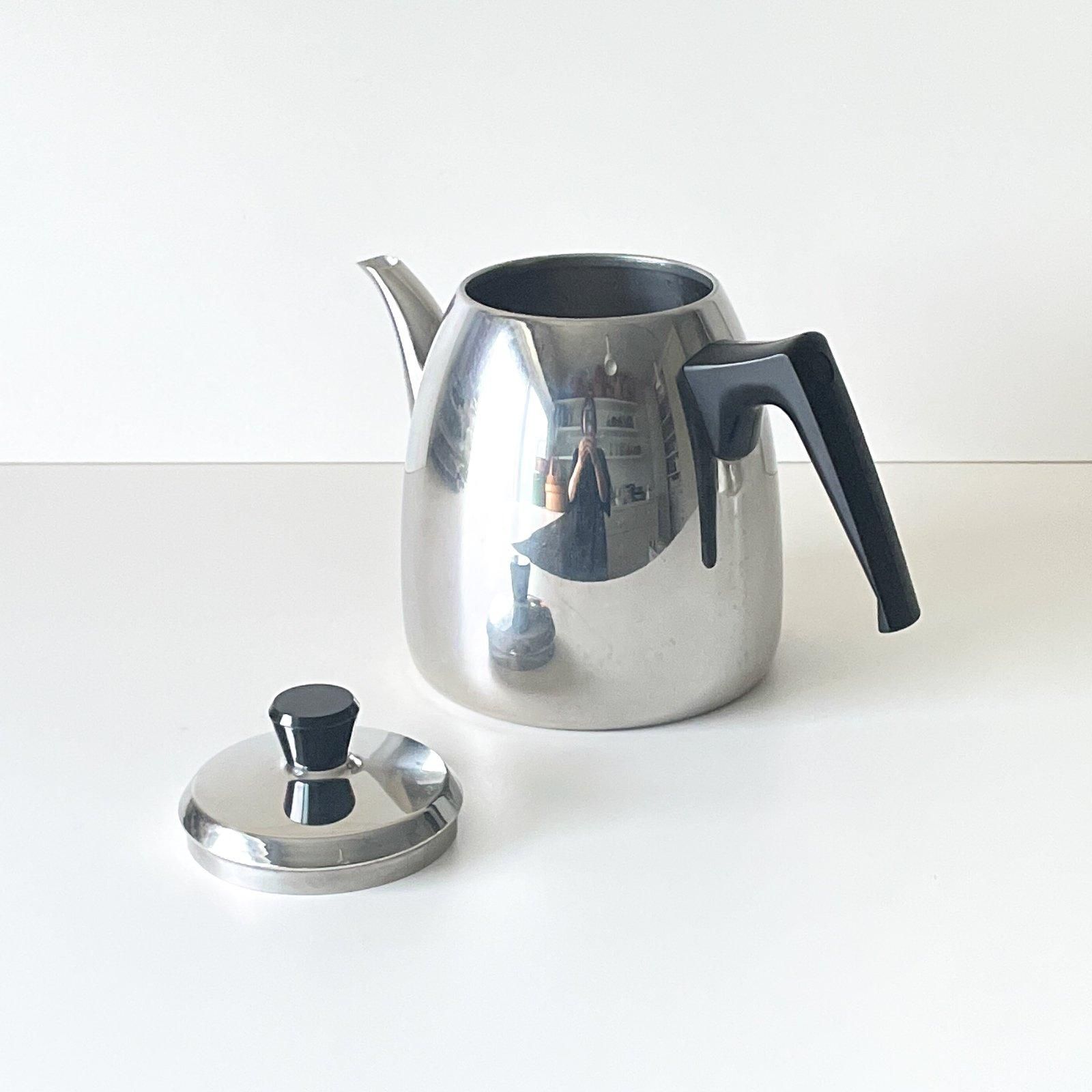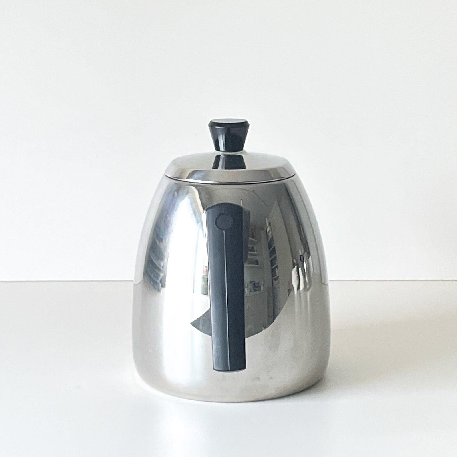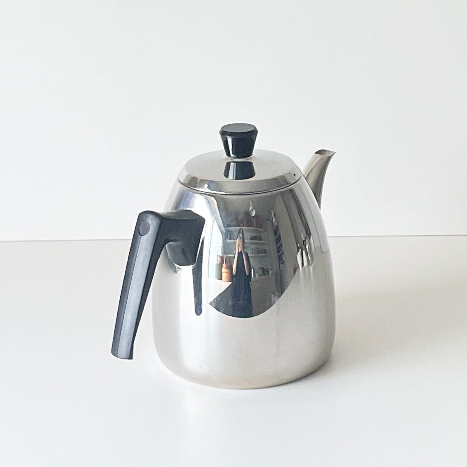 ノルウェー・ポラリス社で作られていたステンレスのケトルです。1964年にデザインされ販売がスタートしました。安定感のある形の本体に、黒い樹脂のハンドルとフタのつまみという、北欧らしいグッドデザイン。ハンドルのラインやフタのつまみのくびれた形、注ぎ口のキュッとしまった形など、細部にまでこだわりが感じられるデザインです。容量は1.5リットルです。
